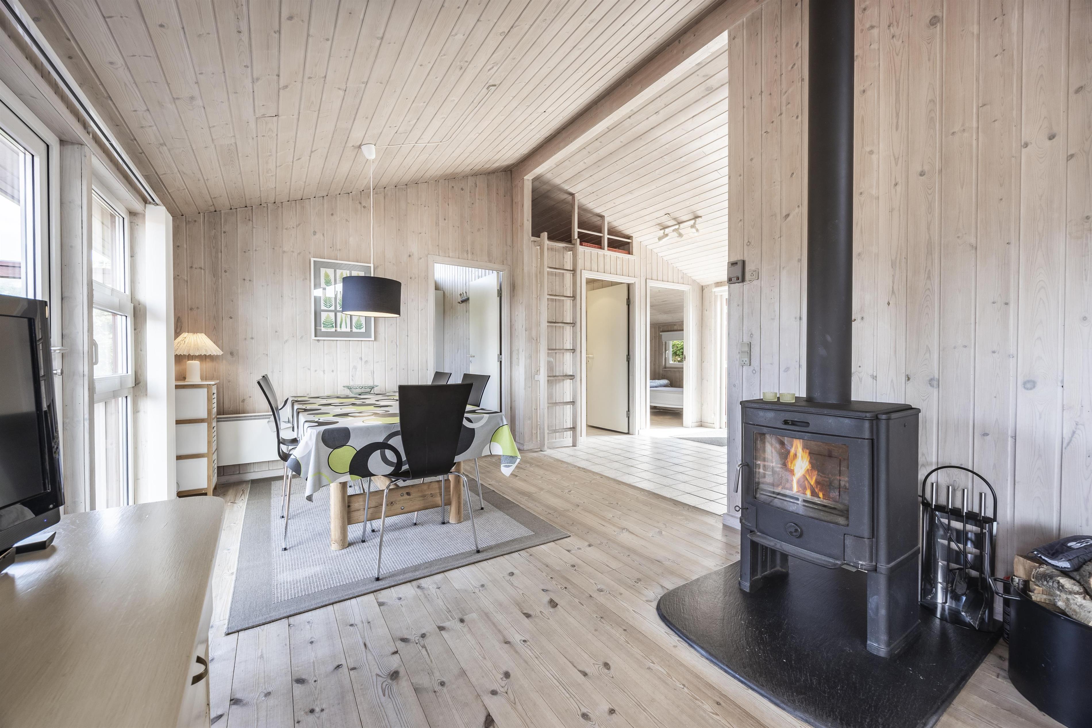 Huset er lyst, velholdt og indrettet med omtanke. I det rummelige opholdsrum er der plads til hyggelige aftener med spil og snakke om dagens oplevelser, og stuen inviterer til afslapning foran den knitrende brændeovn. Feriehuset er udstyret med energivenlig varmepumpe, og både køkkenet og det moderne badeværelse har behagelig gulvvarme – en skøn detalje, især på køligere dage.