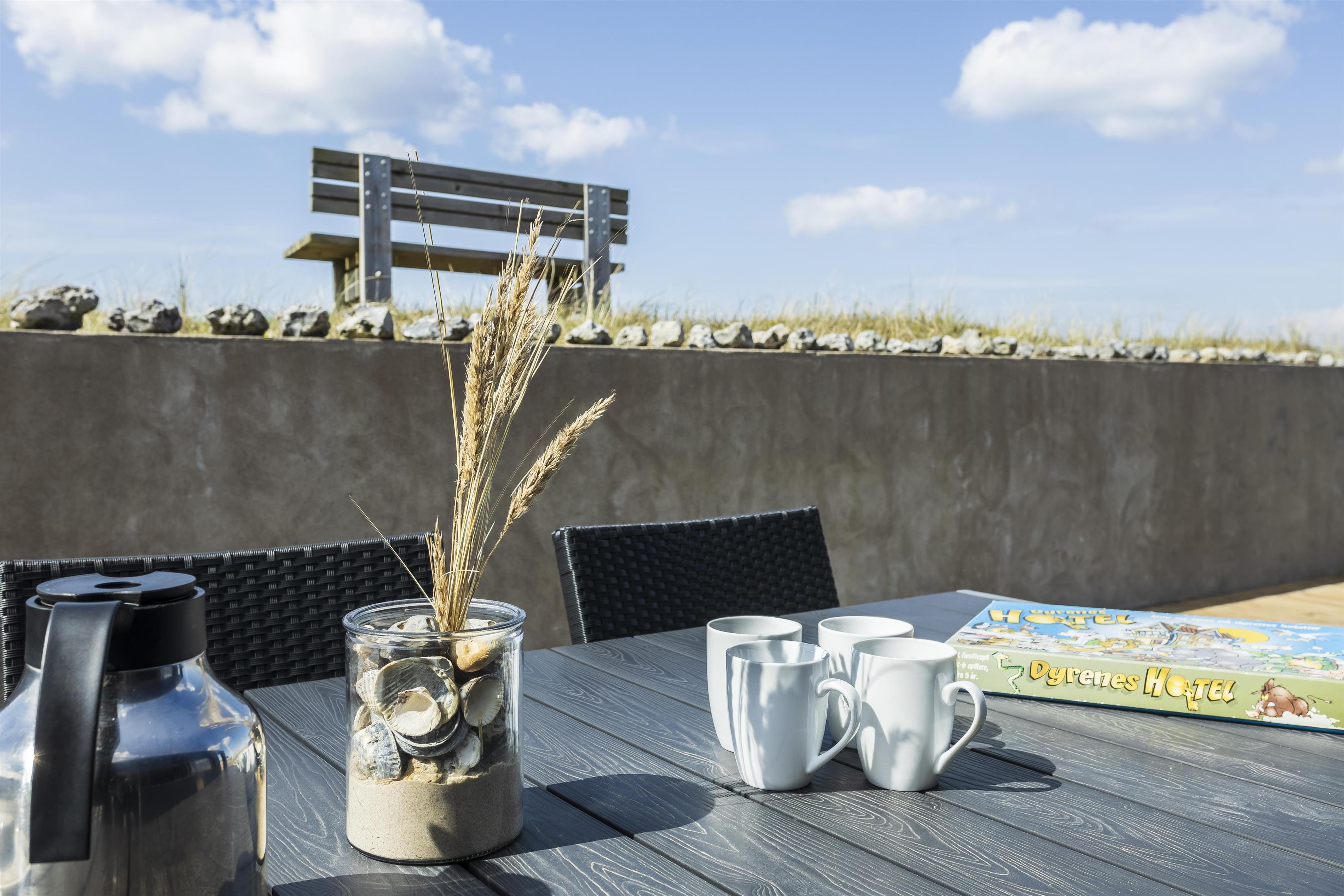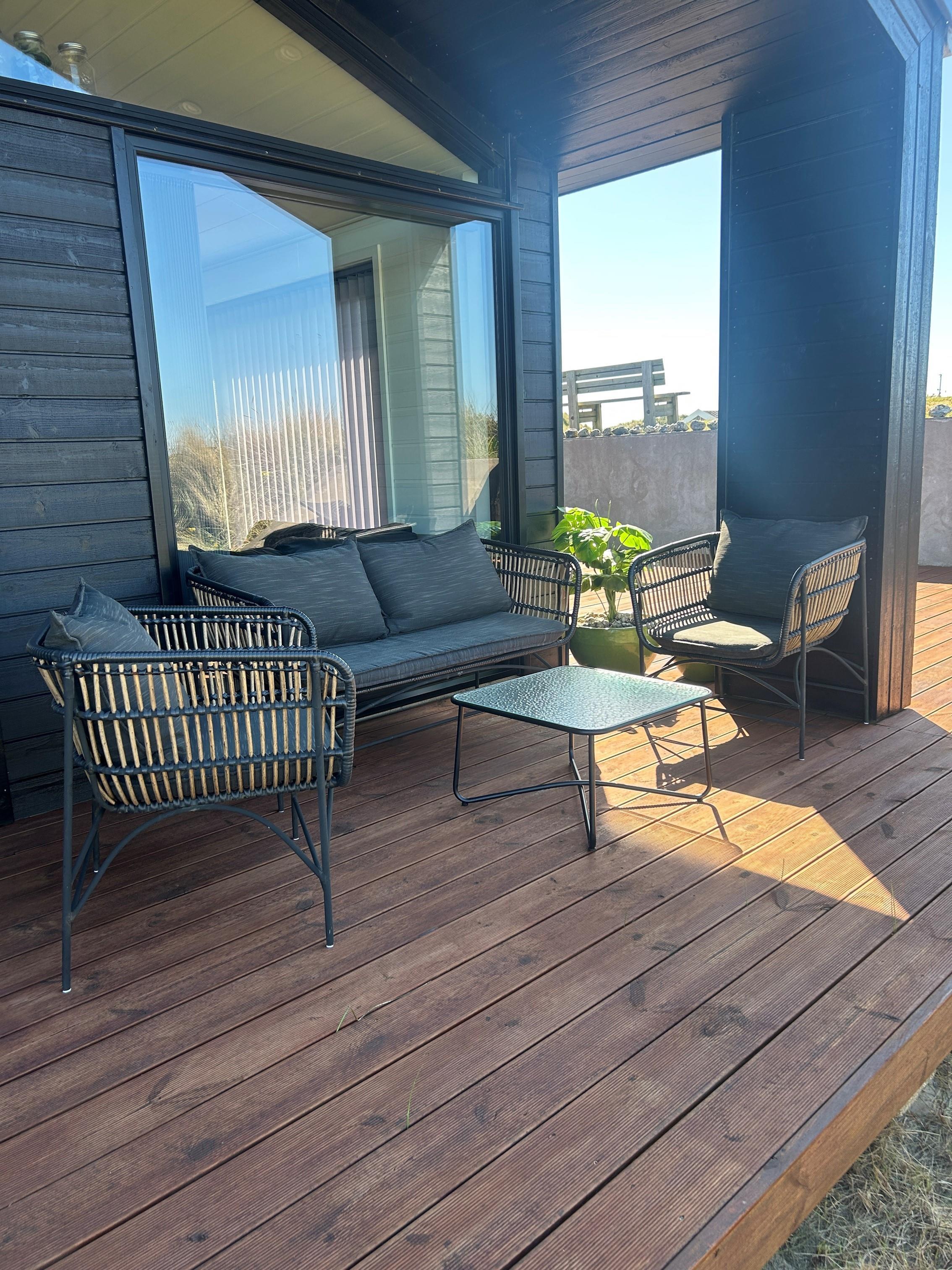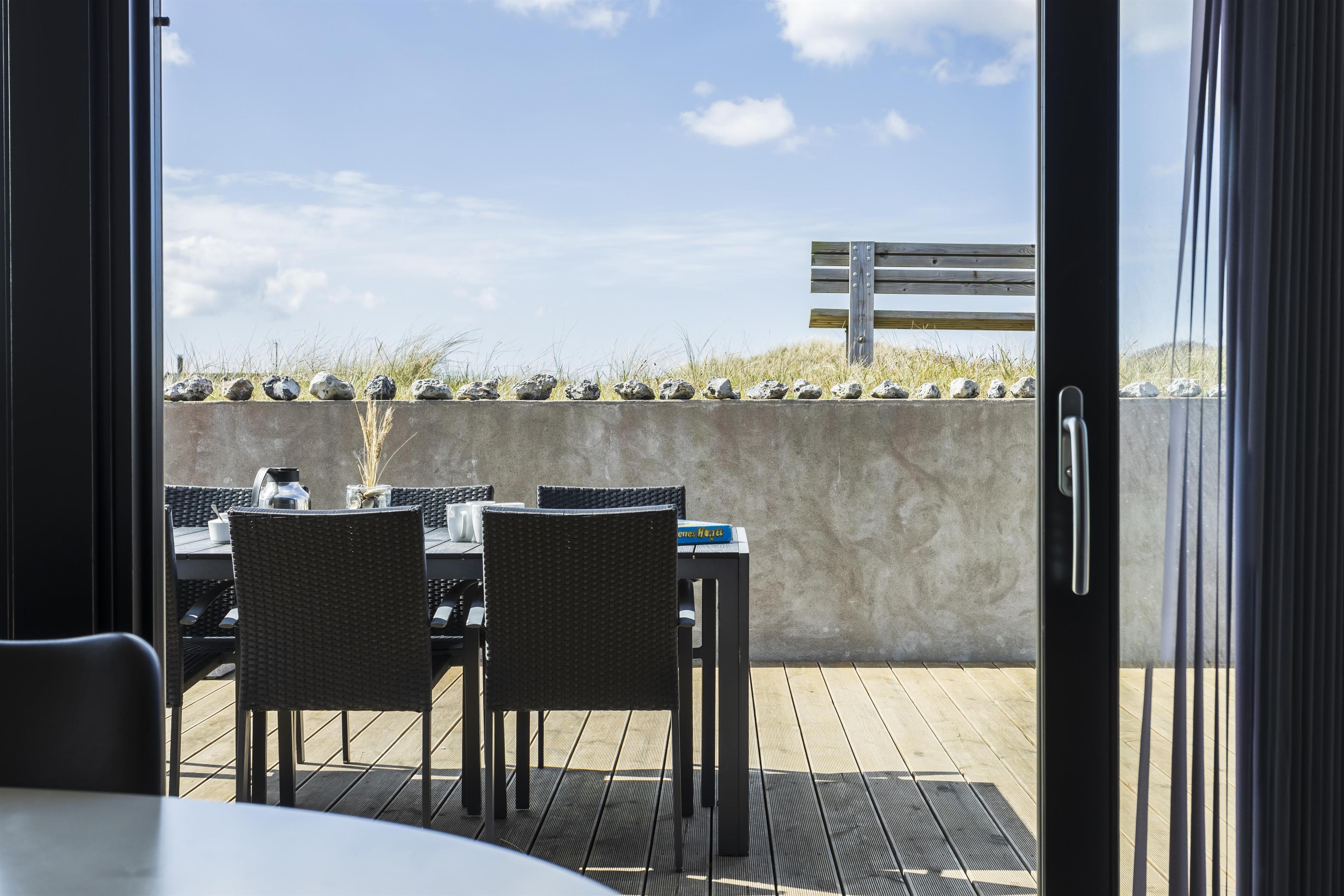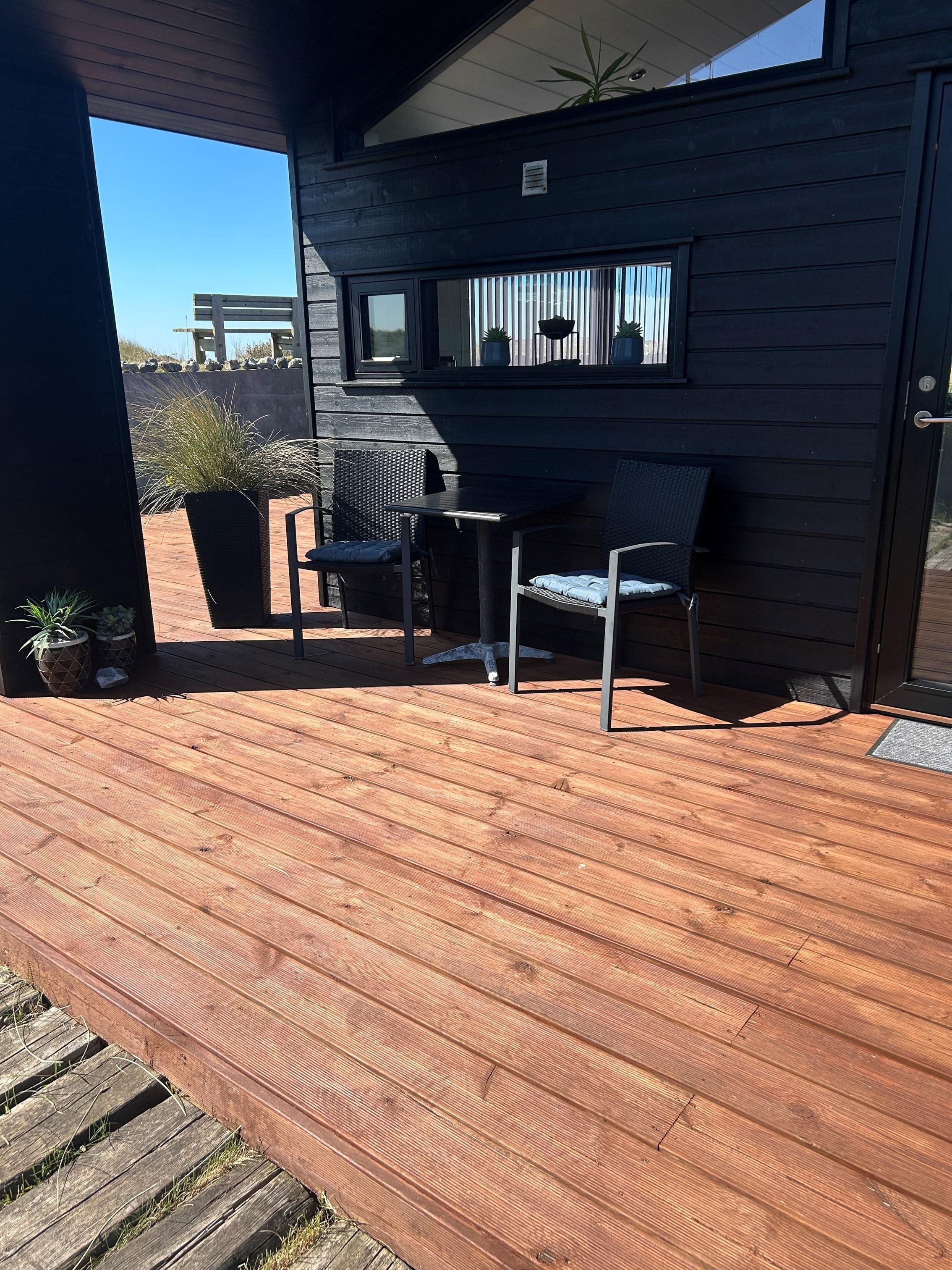 Er sommeren lun, kan I skyde de store skydedøre i opholdsrummet til sid og lukke naturen og den friske havluft ind. I vil træde lige ud på den store, hyggelige terrasse. Her kan I sidde ugeneret og nyde jeres måltider, mens I lytter til havets brusen i baggrunden. Tag aftenskaffen eller et koldt glas rosévin med op på bænken og nyd den flotte havudsigt, mens solen maler himlen i flotte farver. Bliver aftenen kølig, kan I trække ind under de overdækkede terrasser, som I finder i hver ende af feriehuset.