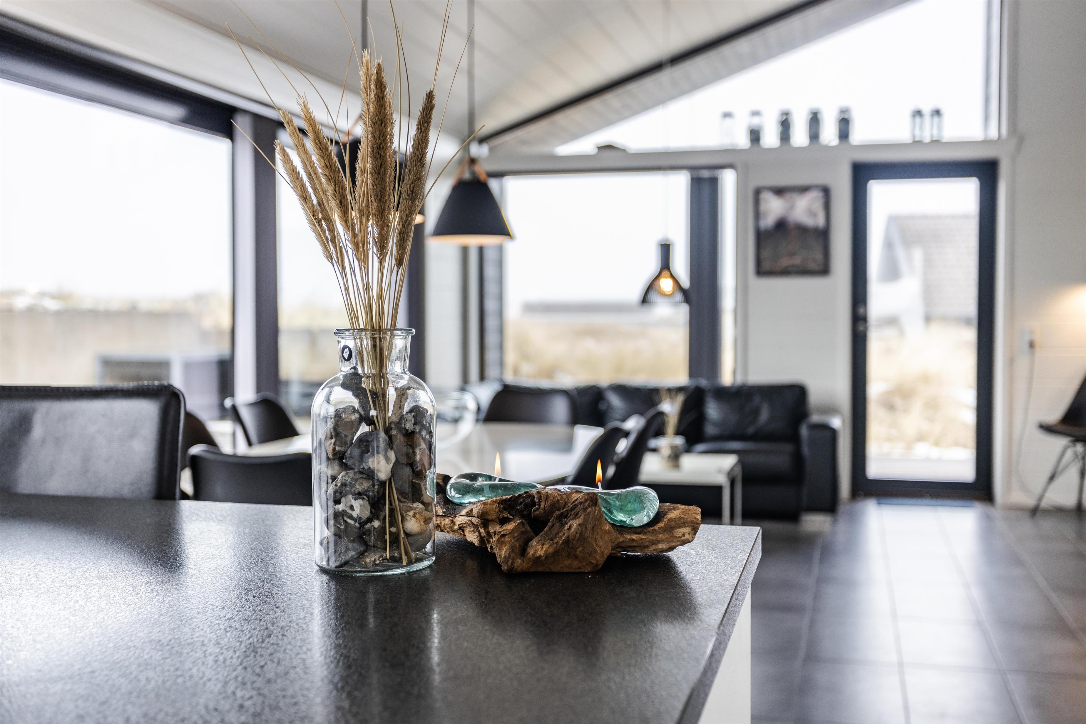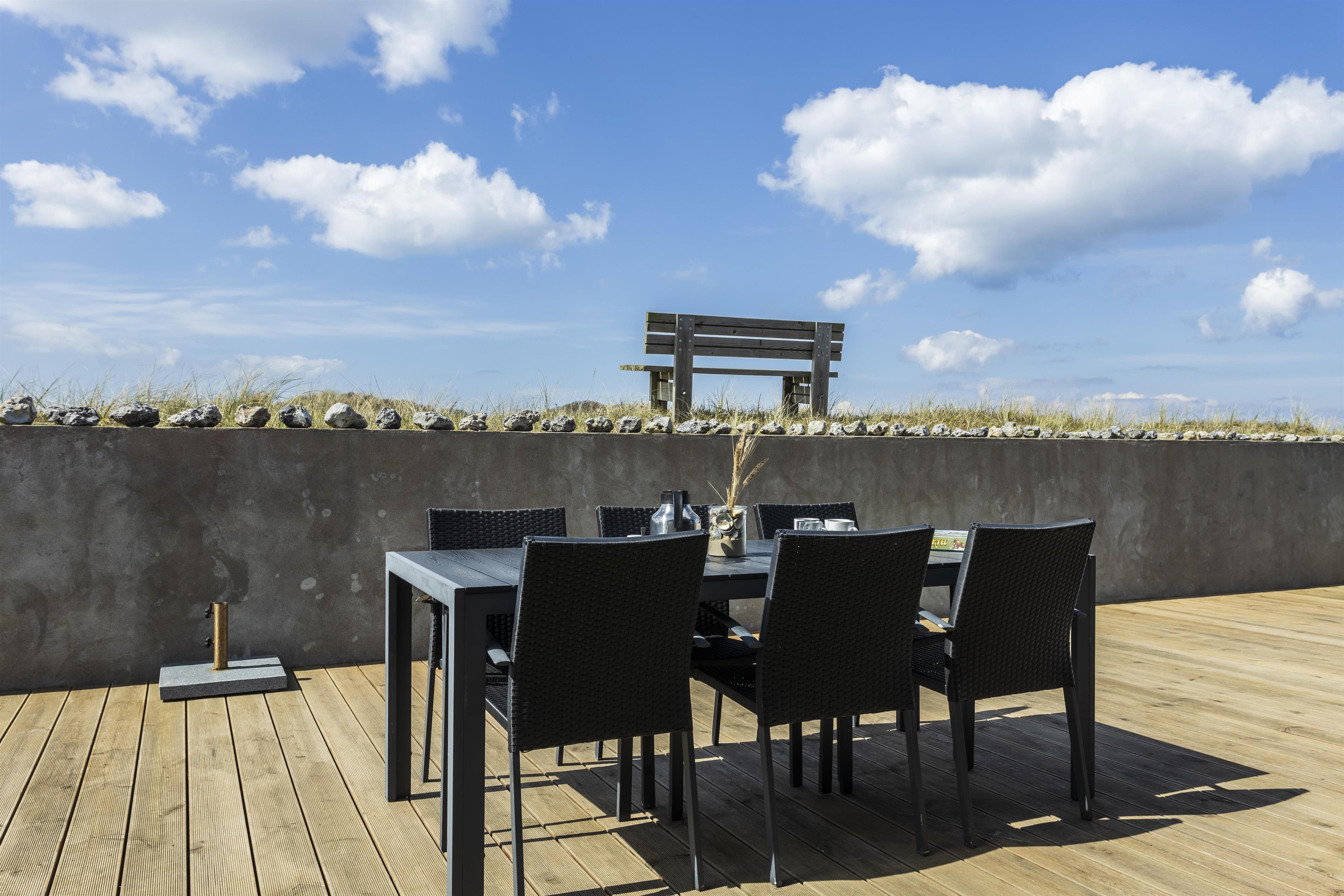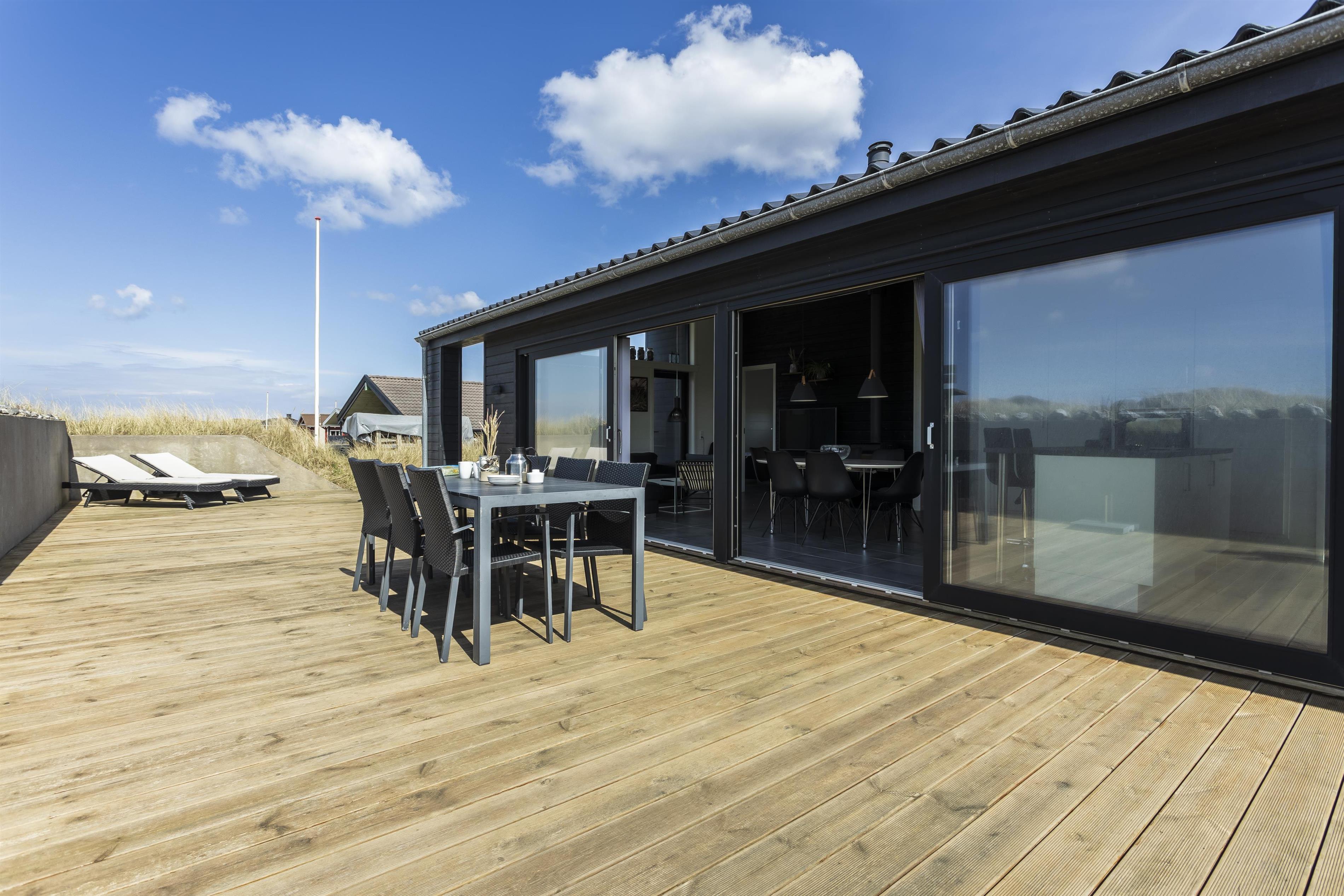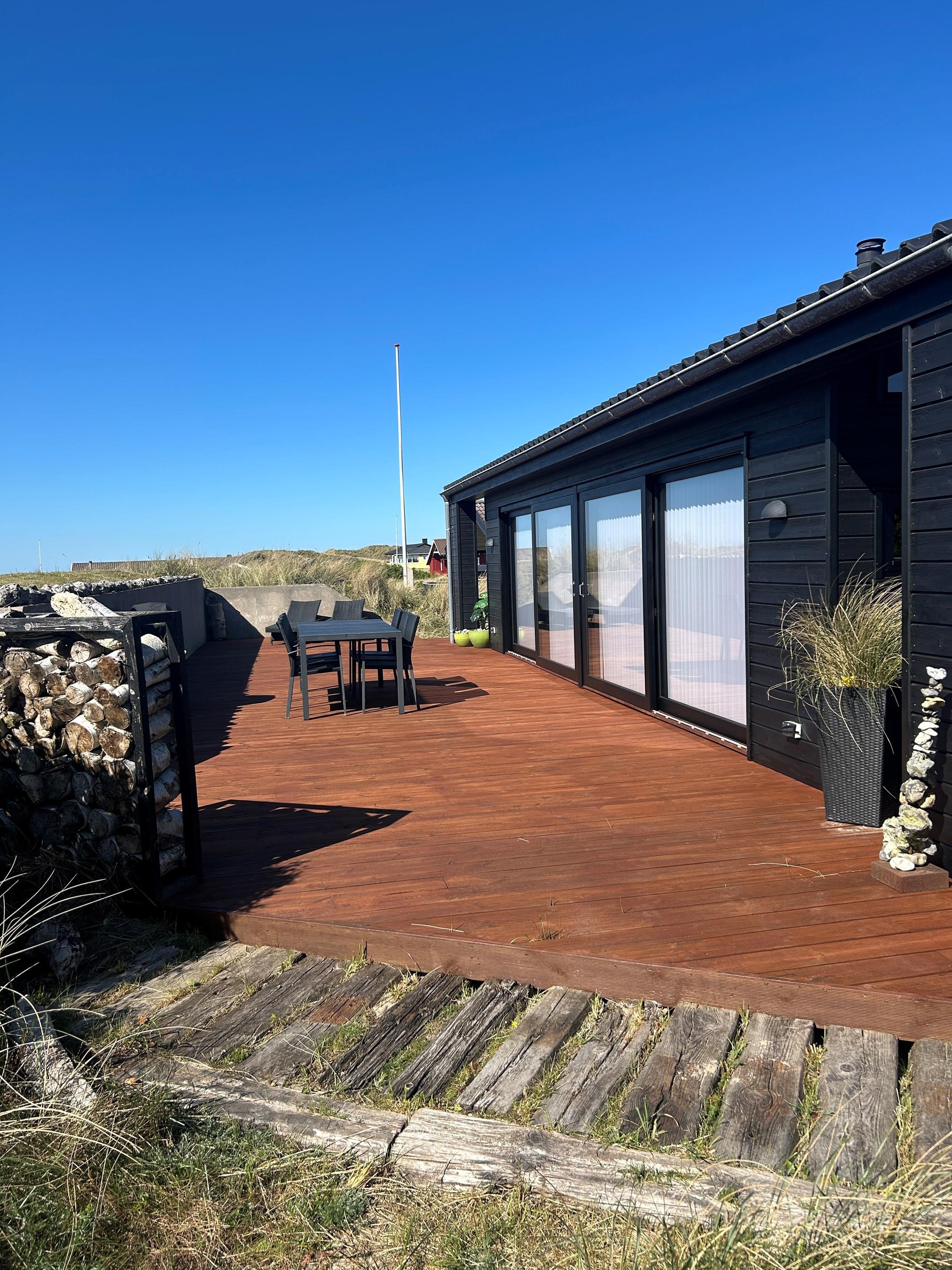 Er sommeren lun, kan I skyde de store skydedøre i opholdsrummet til sid og lukke naturen og den friske havluft ind. I vil træde lige ud på den store, hyggelige terrasse. Her kan I sidde ugeneret og nyde jeres måltider, mens I lytter til havets brusen i baggrunden. Tag aftenskaffen eller et koldt glas rosévin med op på bænken og nyd den flotte havudsigt, mens solen maler himlen i flotte farver. Bliver aftenen kølig, kan I trække ind under de overdækkede terrasser, som I finder i hver ende af feriehuset.