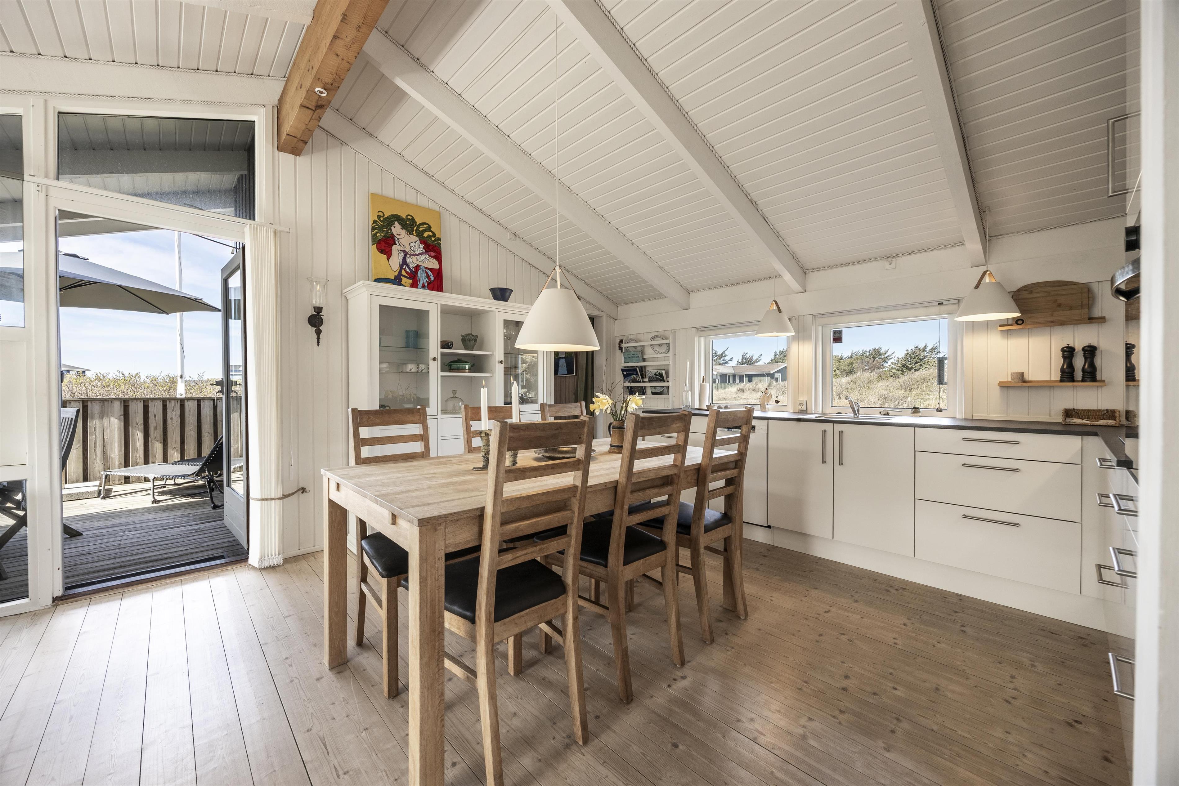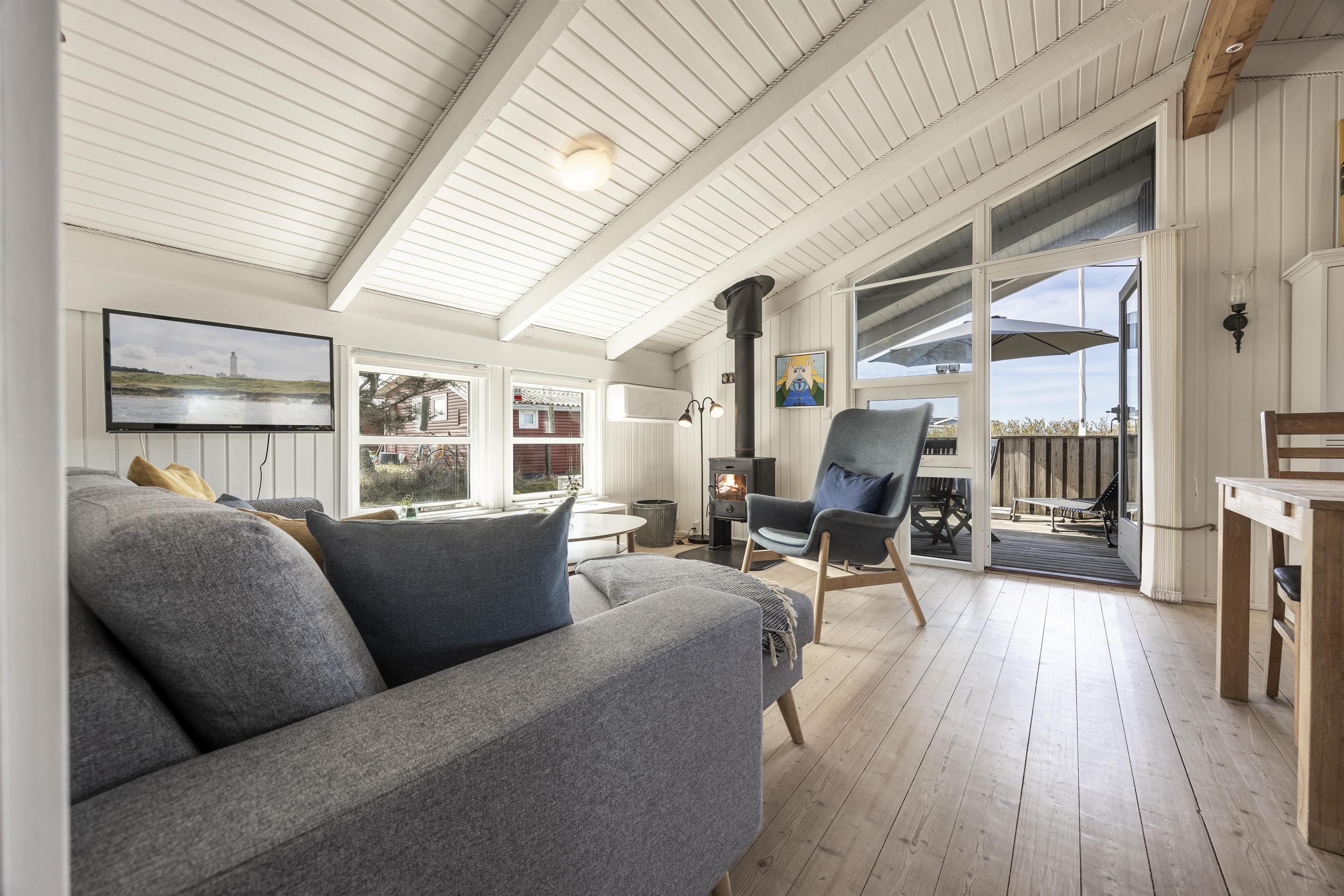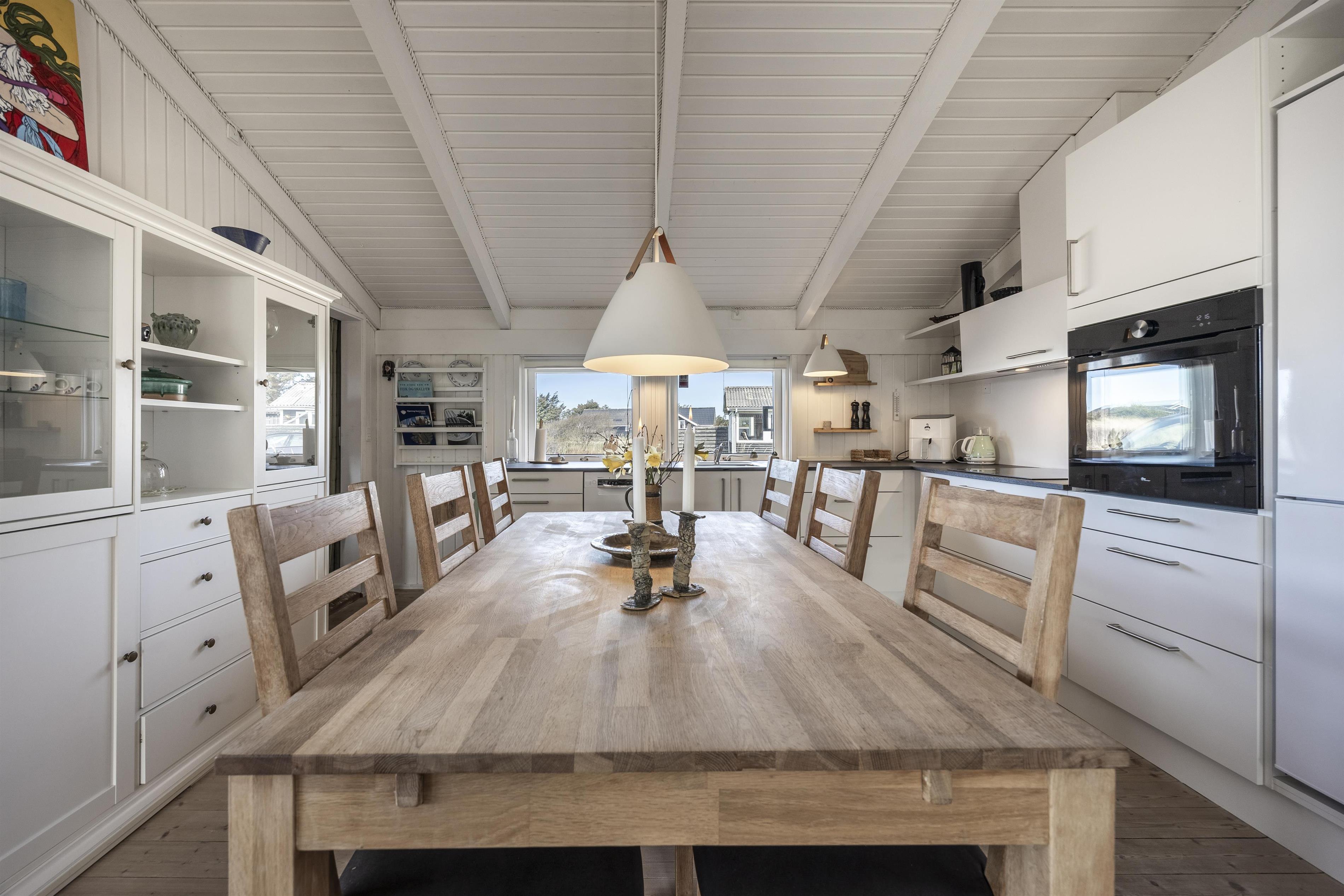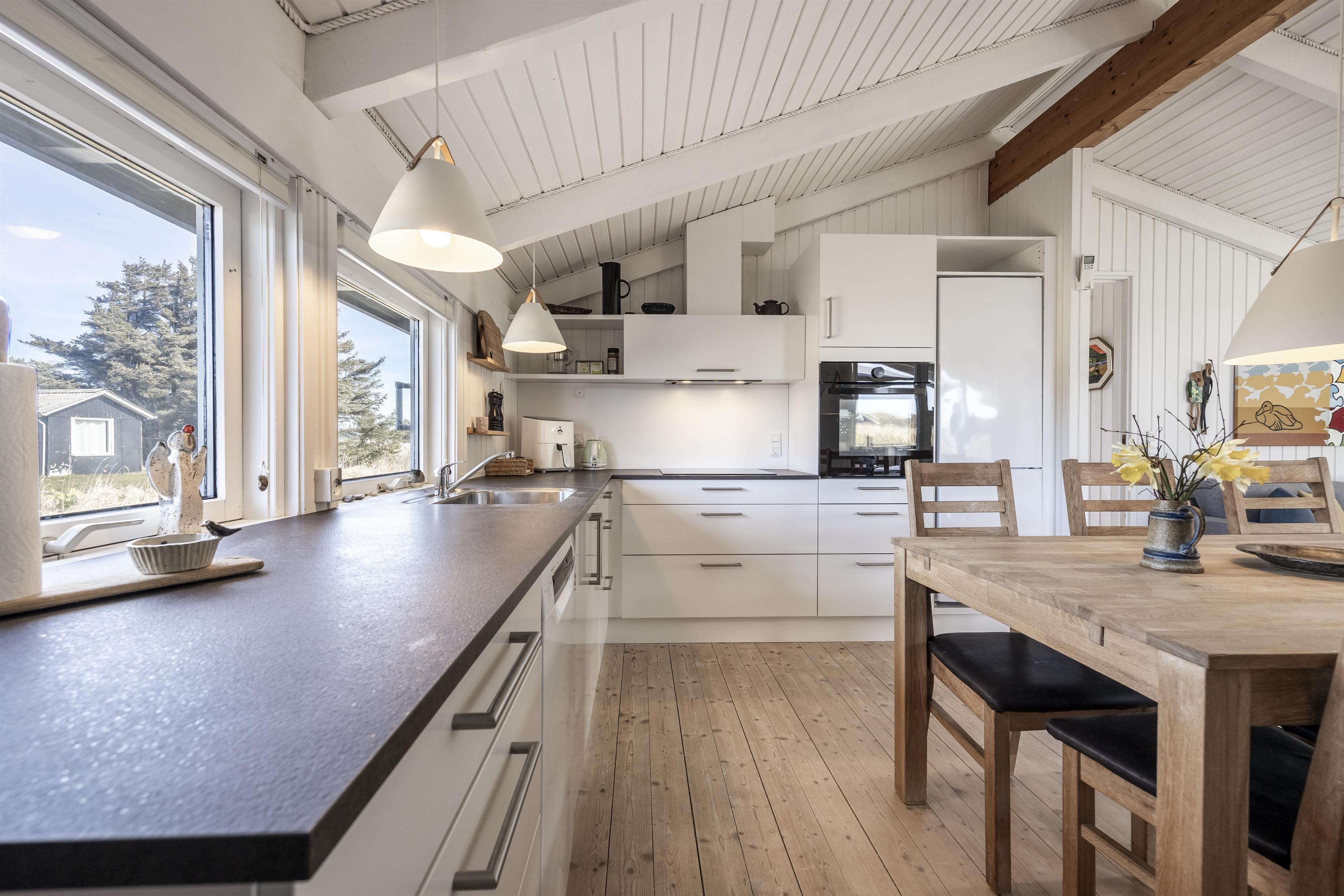 Det lyse køkken ligger i åben forbindelse med spiseafdelingen og det hyggelige sofahjørne - husets hjerte - som indbyder til hyggelige stunder med spil, en god bog eller en god film på tv'et, hvis vejret ikke tillader, at man er udendørs. Tænd op i brændeovnen og lad varmen brede sig i huset på de kølige dage.