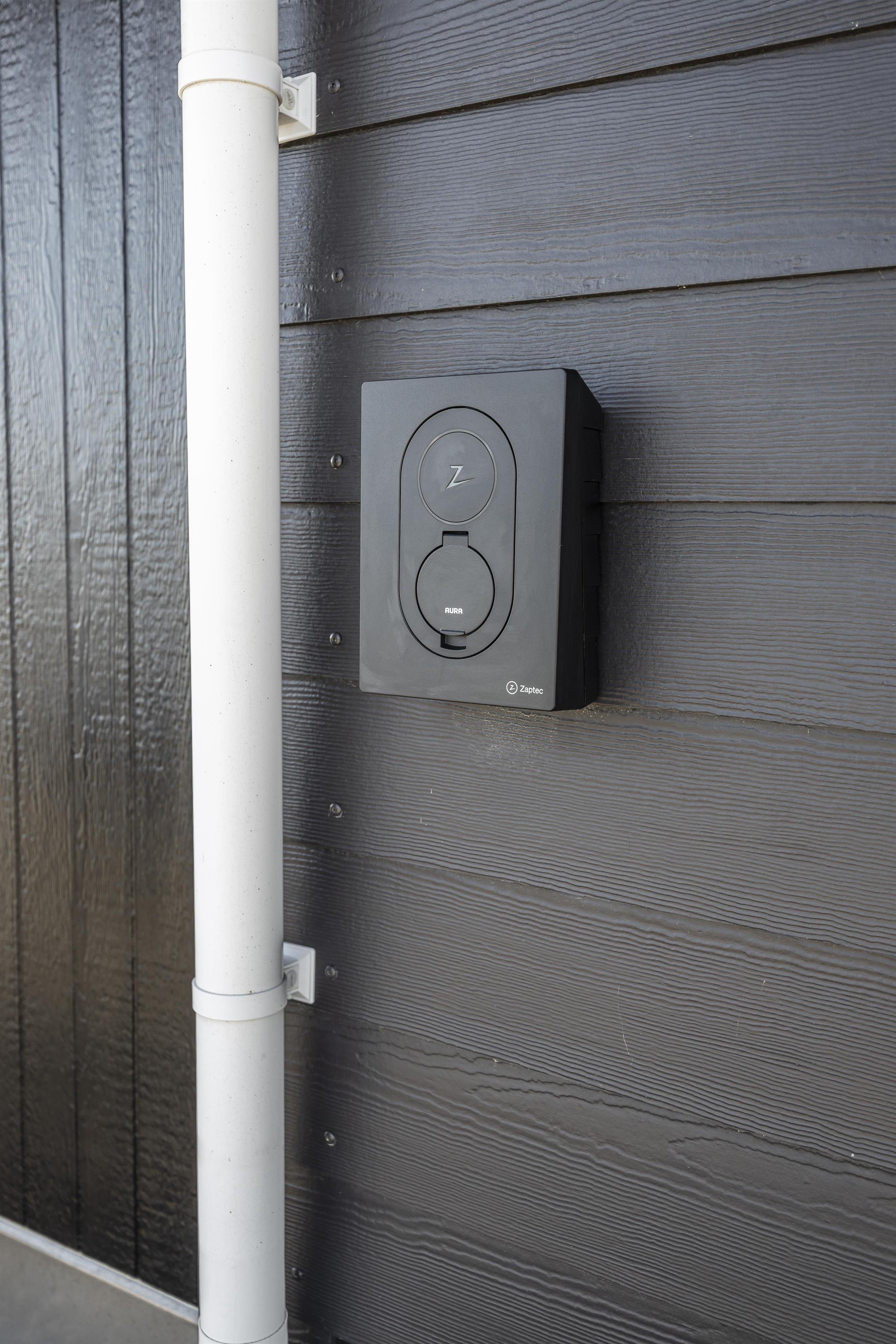 Også elbilen er der tænkt på, da der er opsat en ladeboks direkte ved feriehuset.
