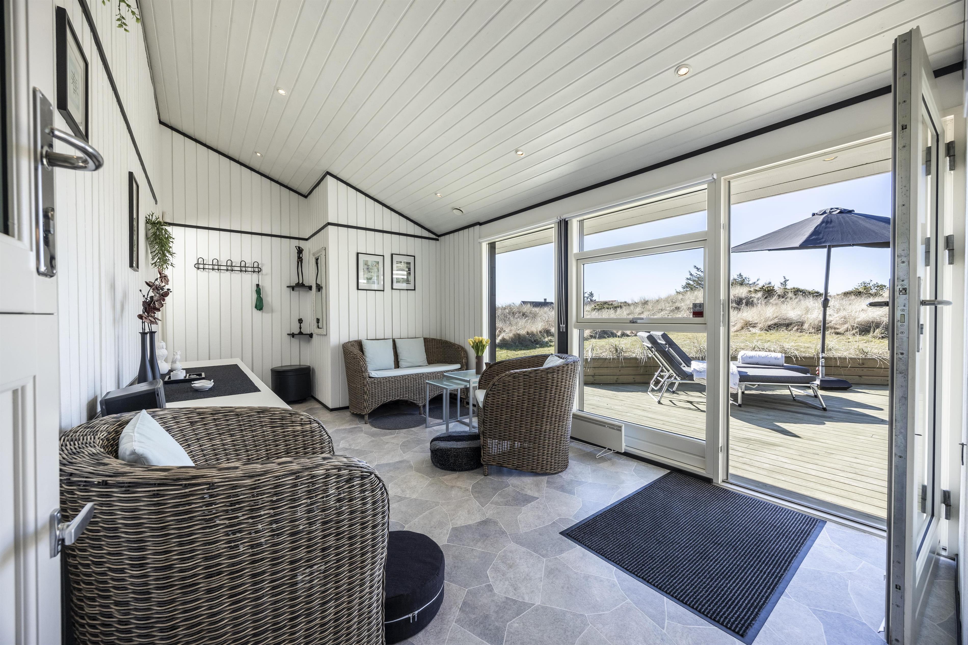 En dejlig, lys udestue er også til rådighed, hvilket gør det oplagt at nyde eftermiddagskaffen her – særligt hvis vejret ikke tillader at sidde ude på terrassen.