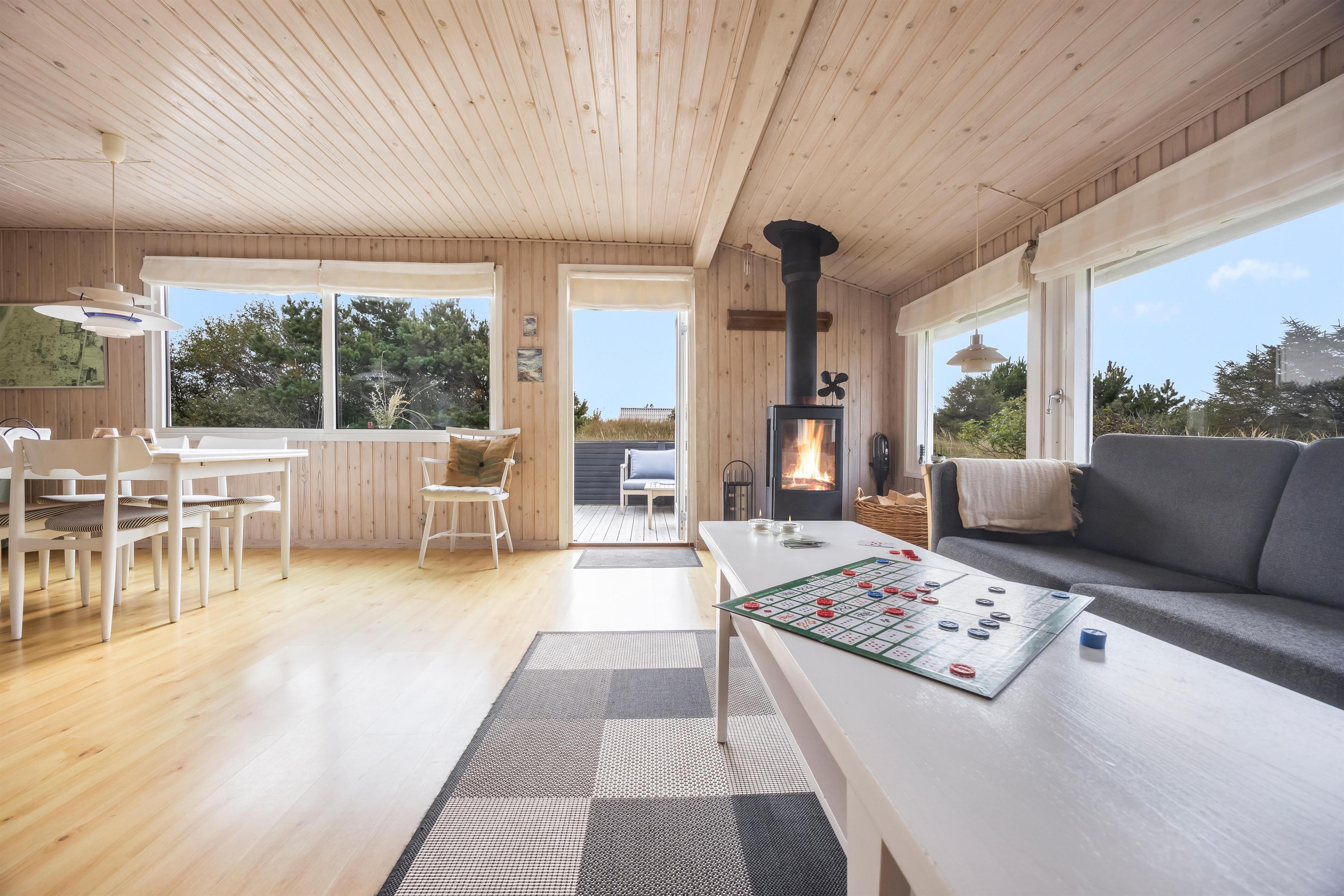 I stuen kan I samles til brætspil eller en hyggelig aften foran brændeovnen, mens varmen breder sig og udsigten til naturen udenfor inviterer til ro. Det er et sted, hvor nærvær og familiehygge virkelig får plads.