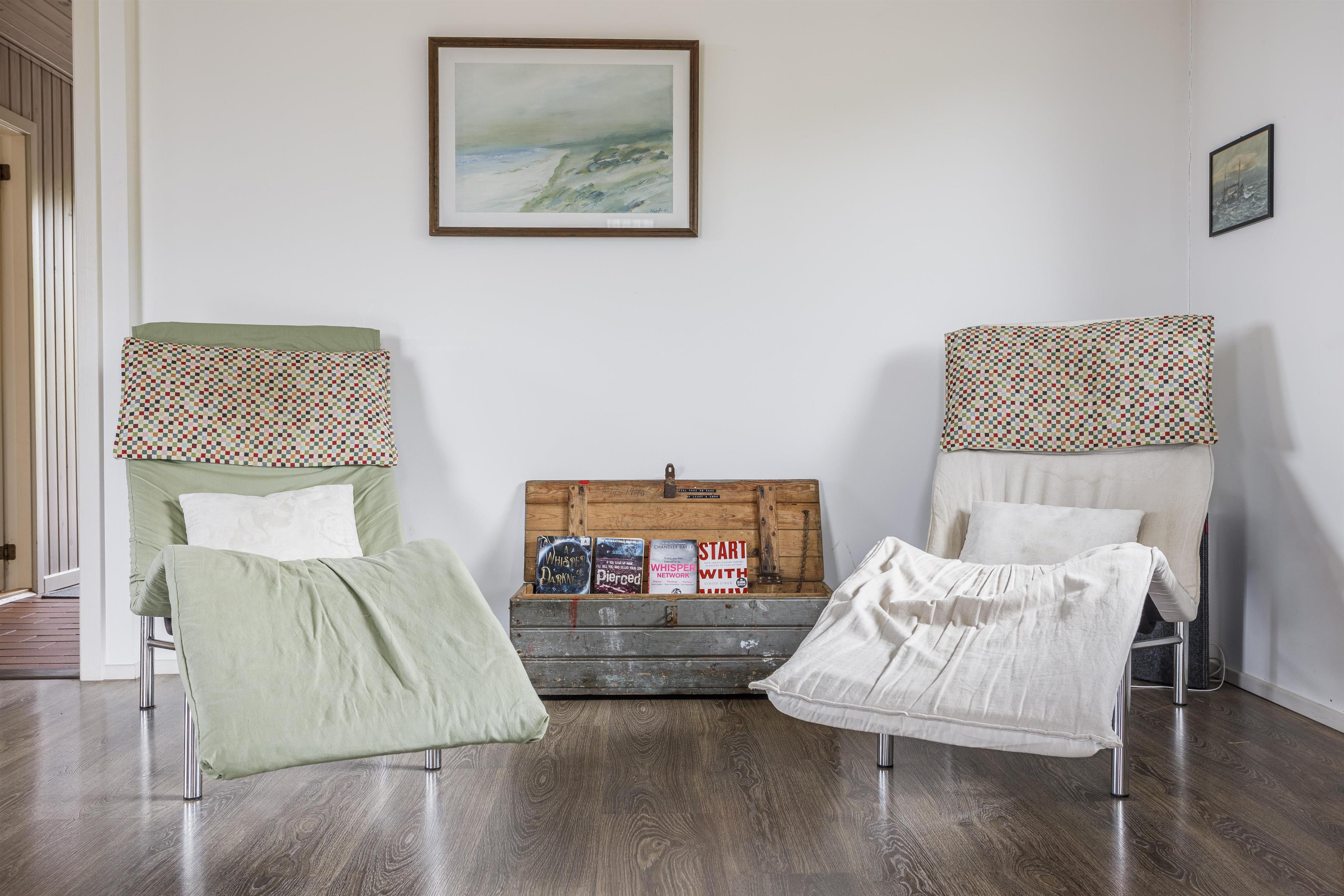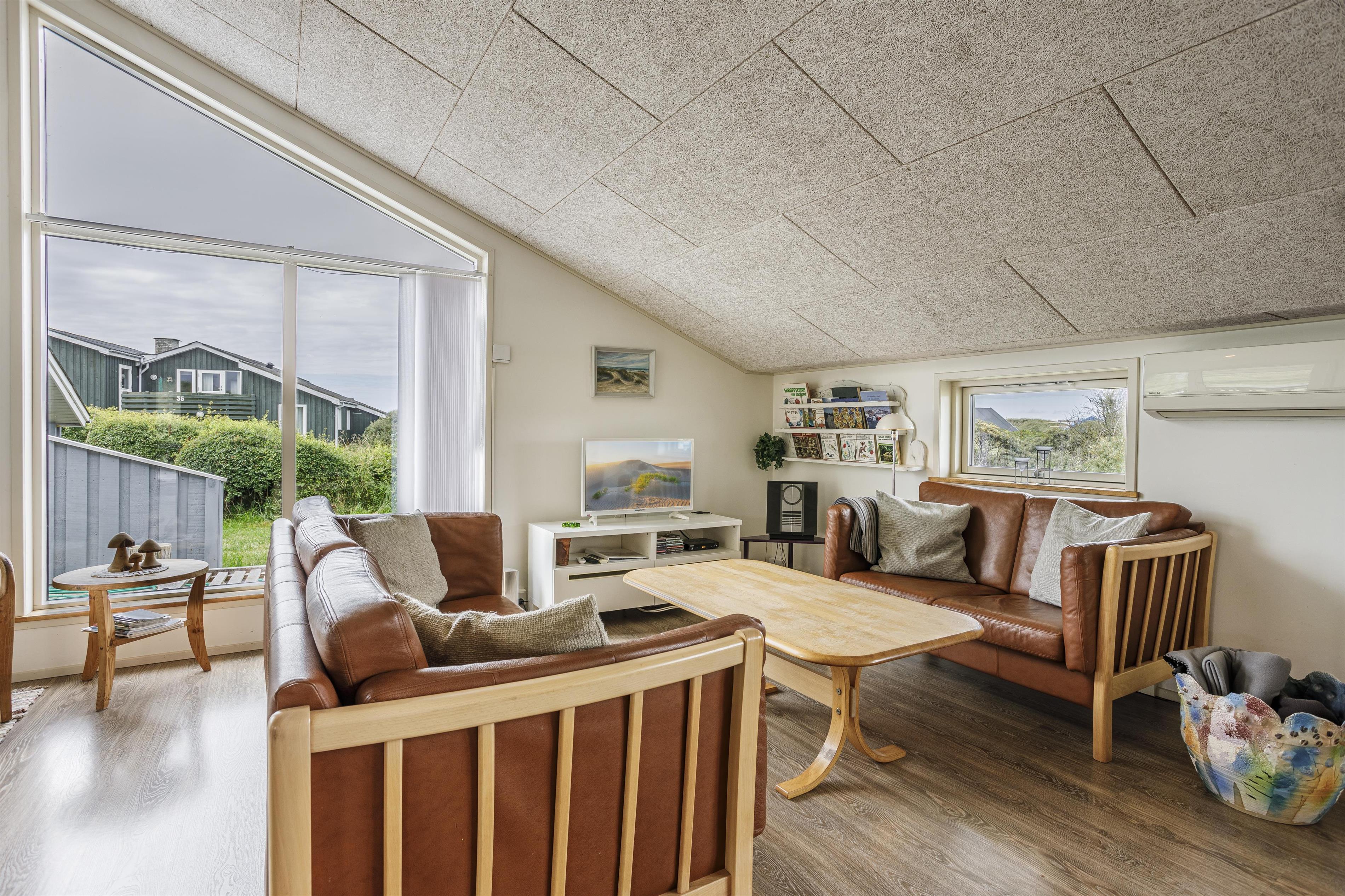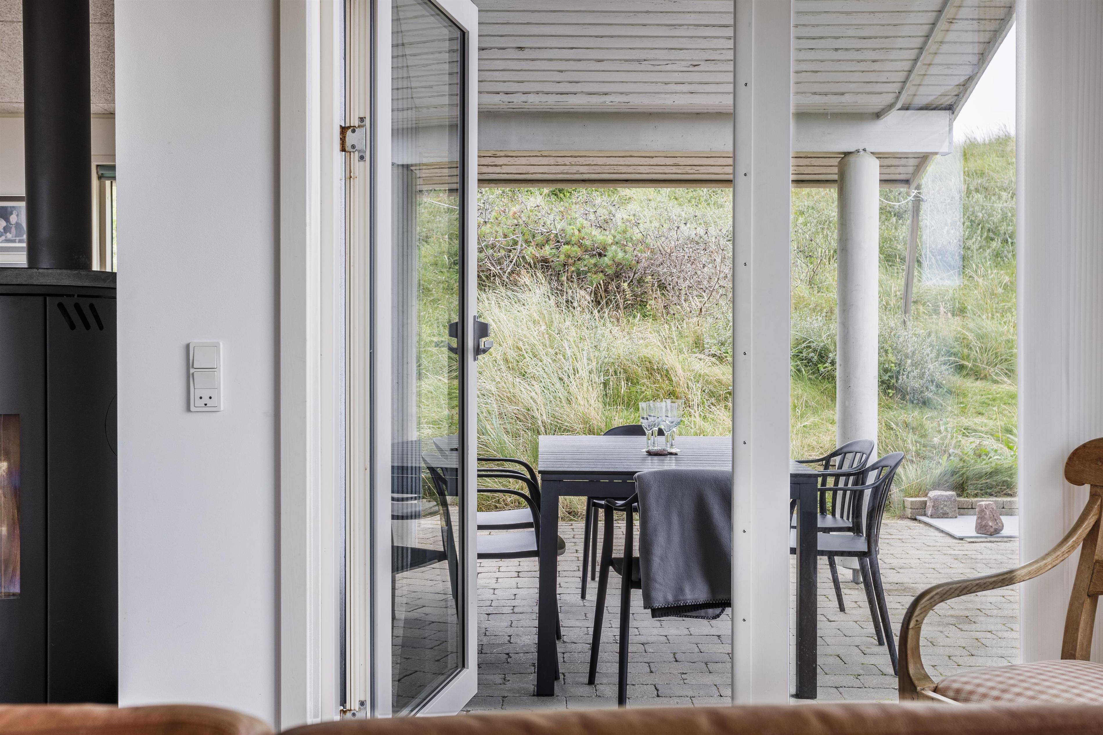 Feriehuset er smukt indrettet med komfortable møbler og en lys, rummelig stue med loft til kip og store vinduespartier, som lukker lyset og naturen indenfor. Den hyggelige brændeovn skaber en varm atmosfære, hvor I kan nyde en stille aften til lyden af knitrende træ. Det åbne køkken-alrum er ideelt til fælles madlavning, spil eller film på husets TV, alt imens I nyder den storslåede udsigt over klitlandskabet. I kan også åbne dørene, lade den friske havluft strømme ind og lytte til lyden af dansk sommer.
