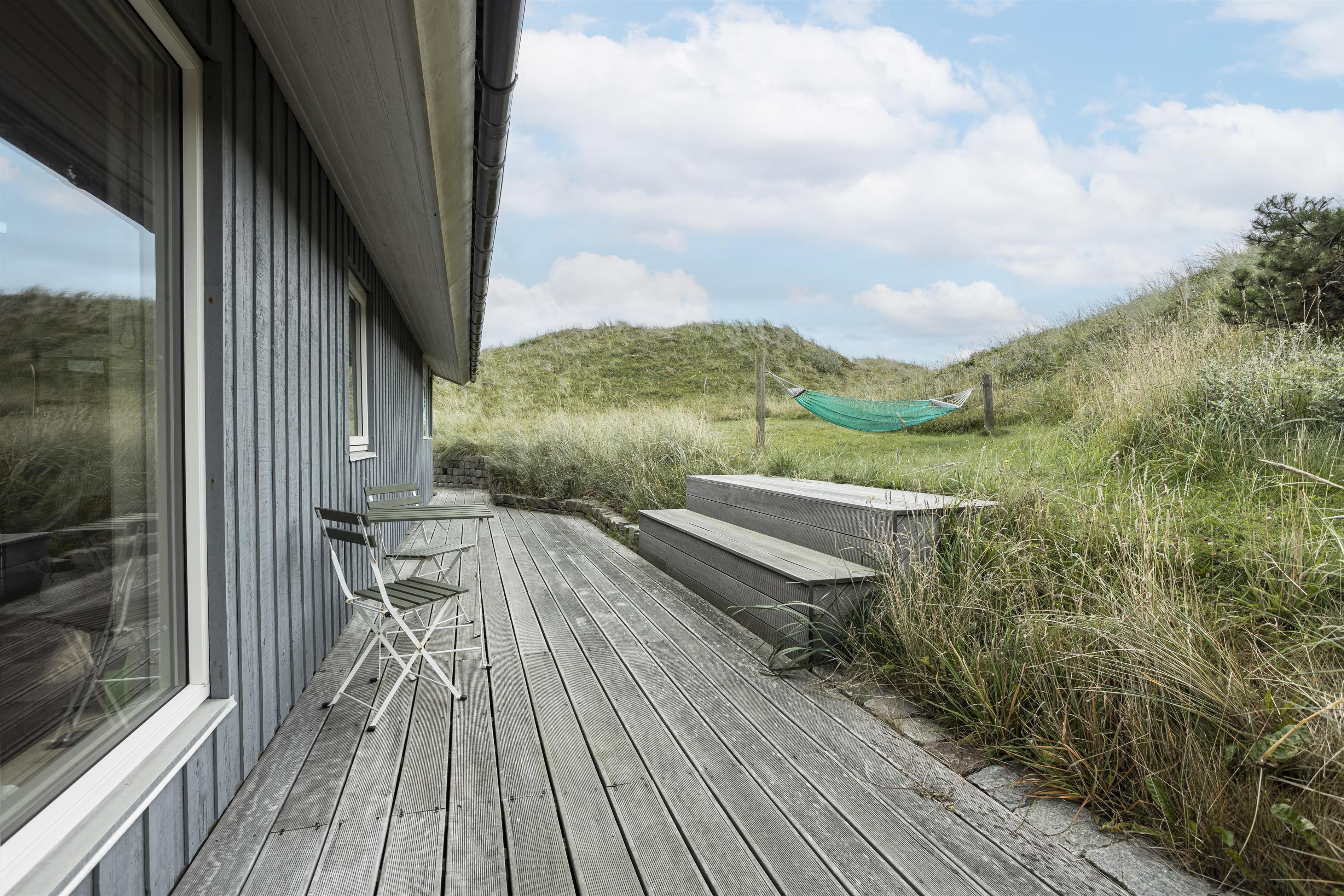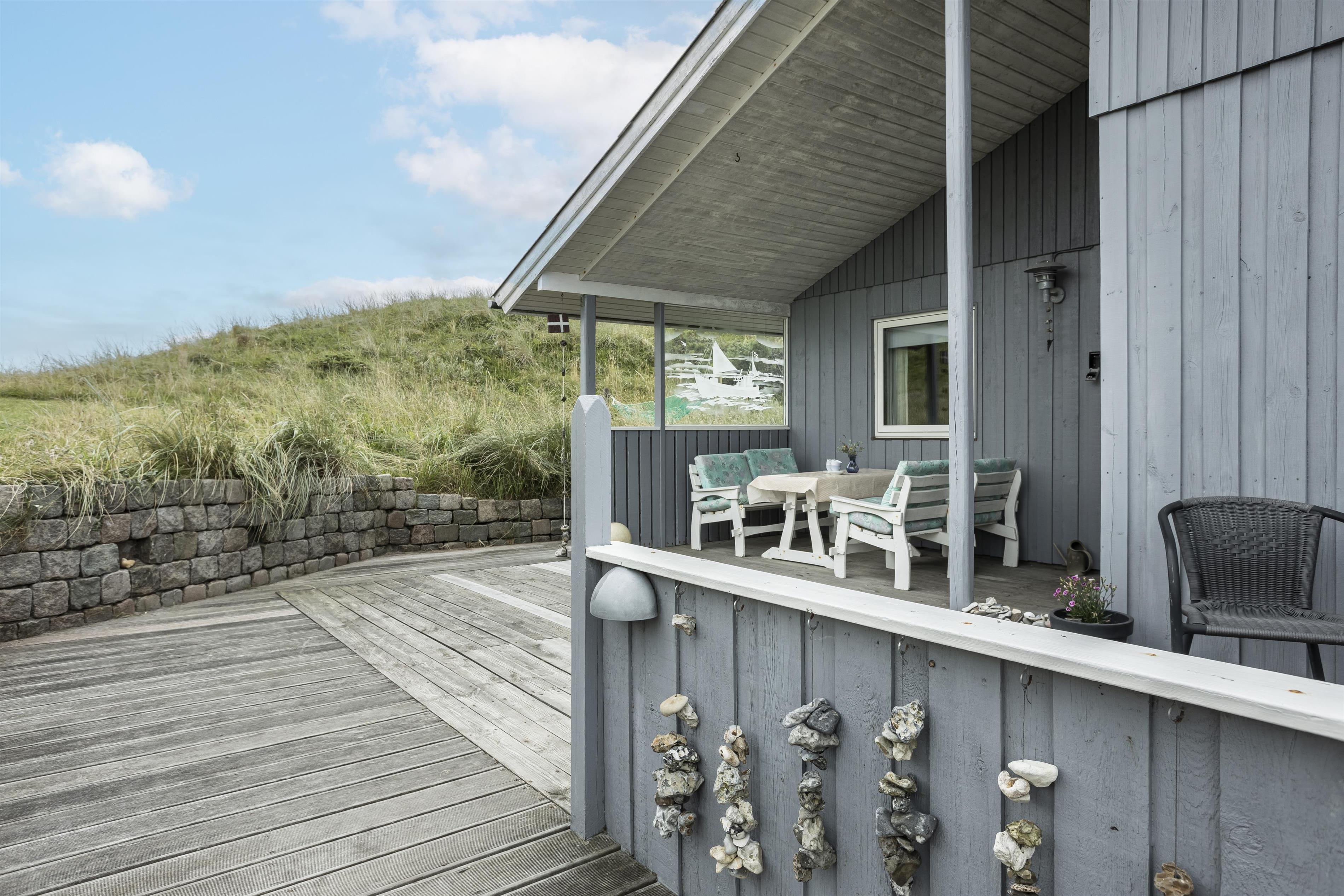 Sommerhuset huset ligger på en stor naturgrund midt i det bølgende klitlandskab i Tornby blot 300 meter fra stranden. Flere terrasser og lækroge giver jer mulighed for at nyde solen fra morgen til aften. Det er også muligt at trække sig ind i skyggen på de overdækkede terrasser, hvis solen bliver for varm. På de lune sommeraftener kan I overnatte i husets shelter og falde i søvn til havets beroligende lyd.