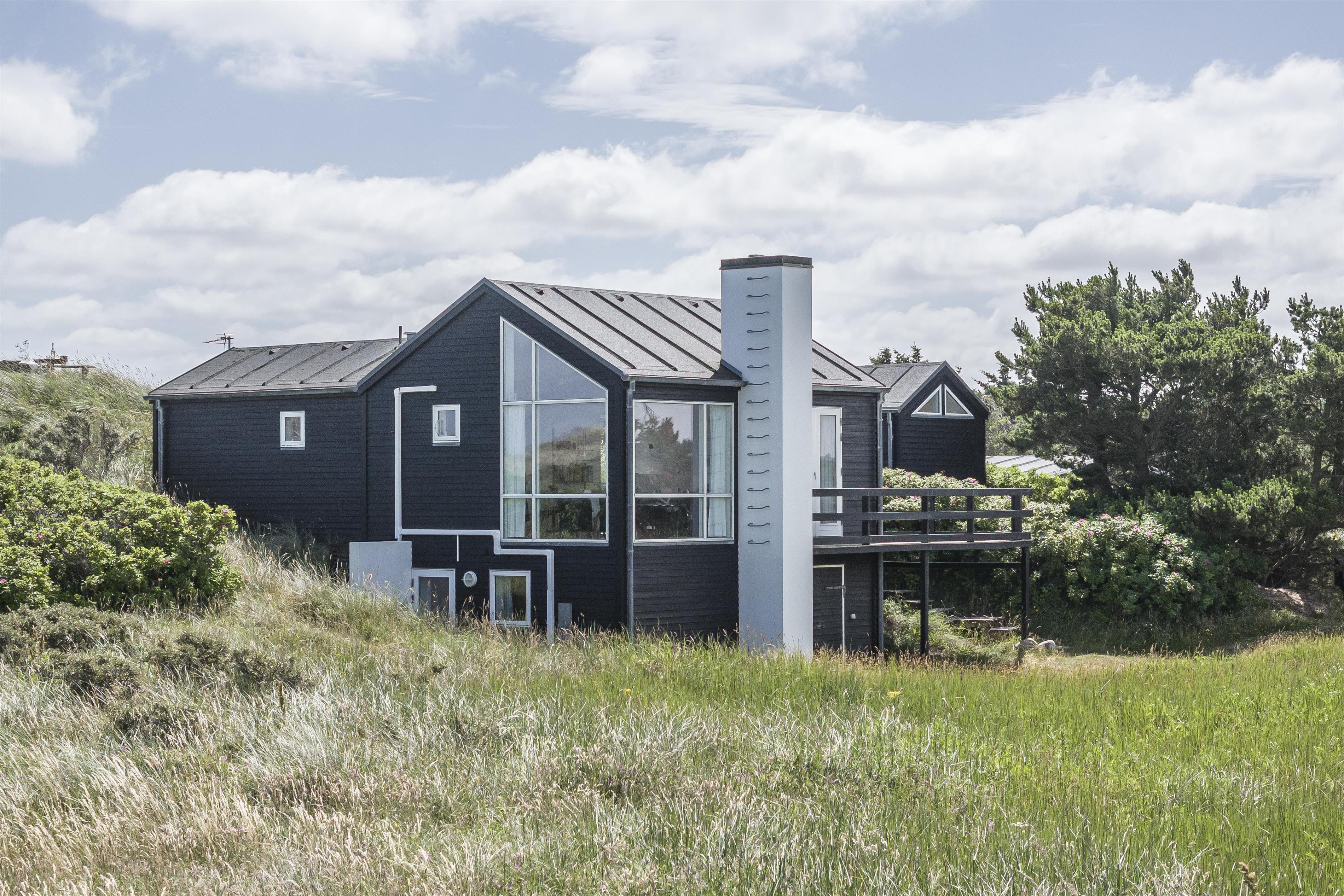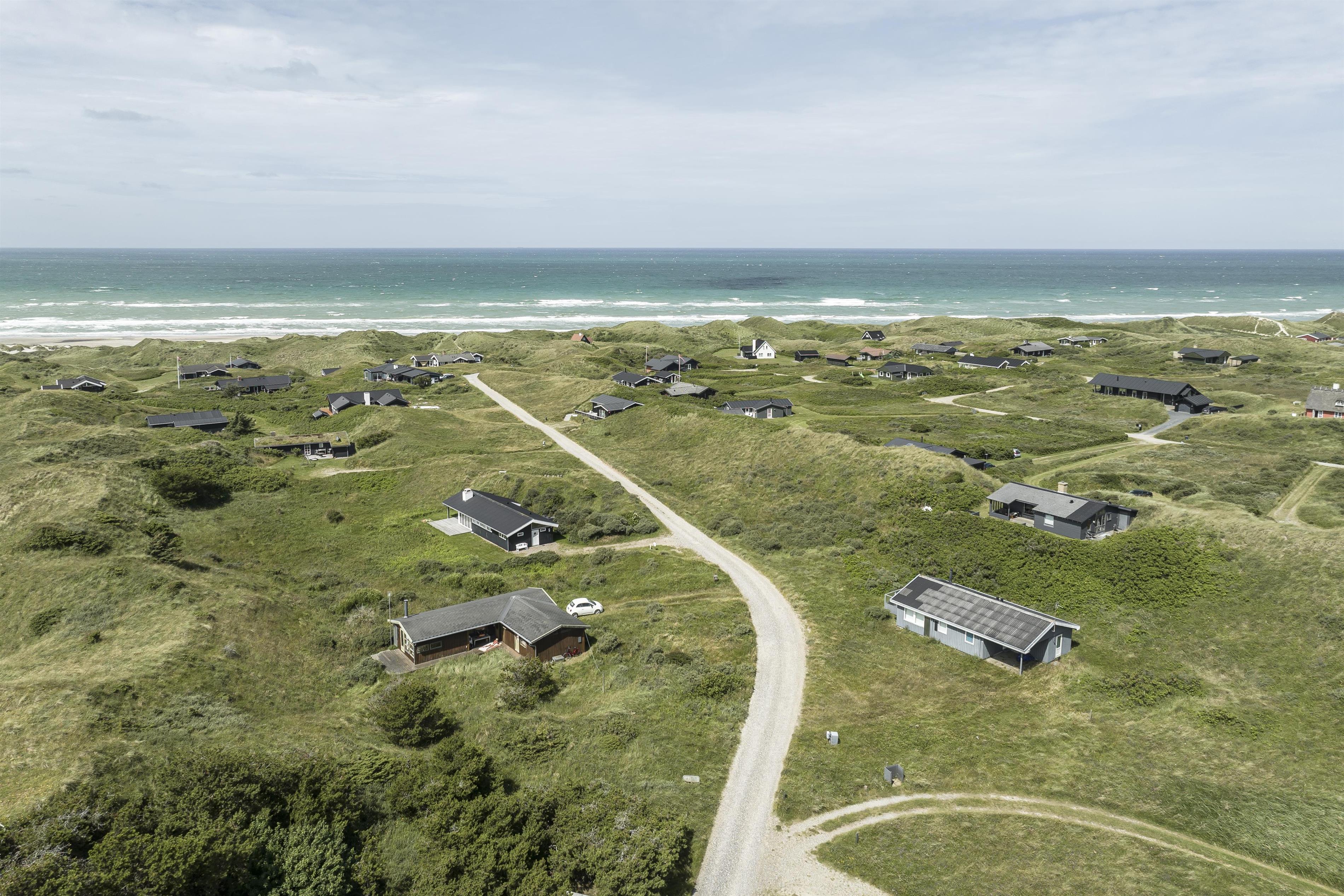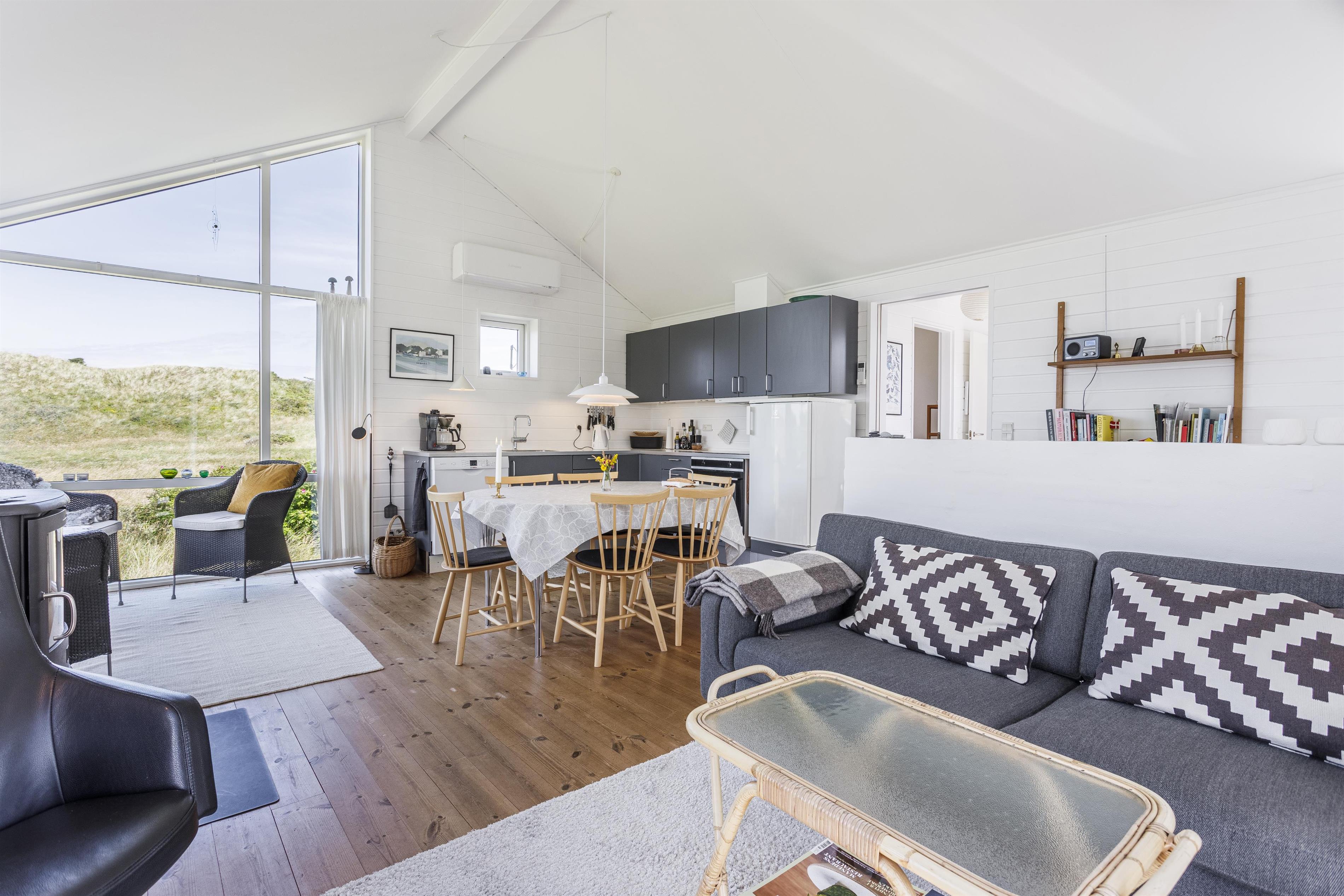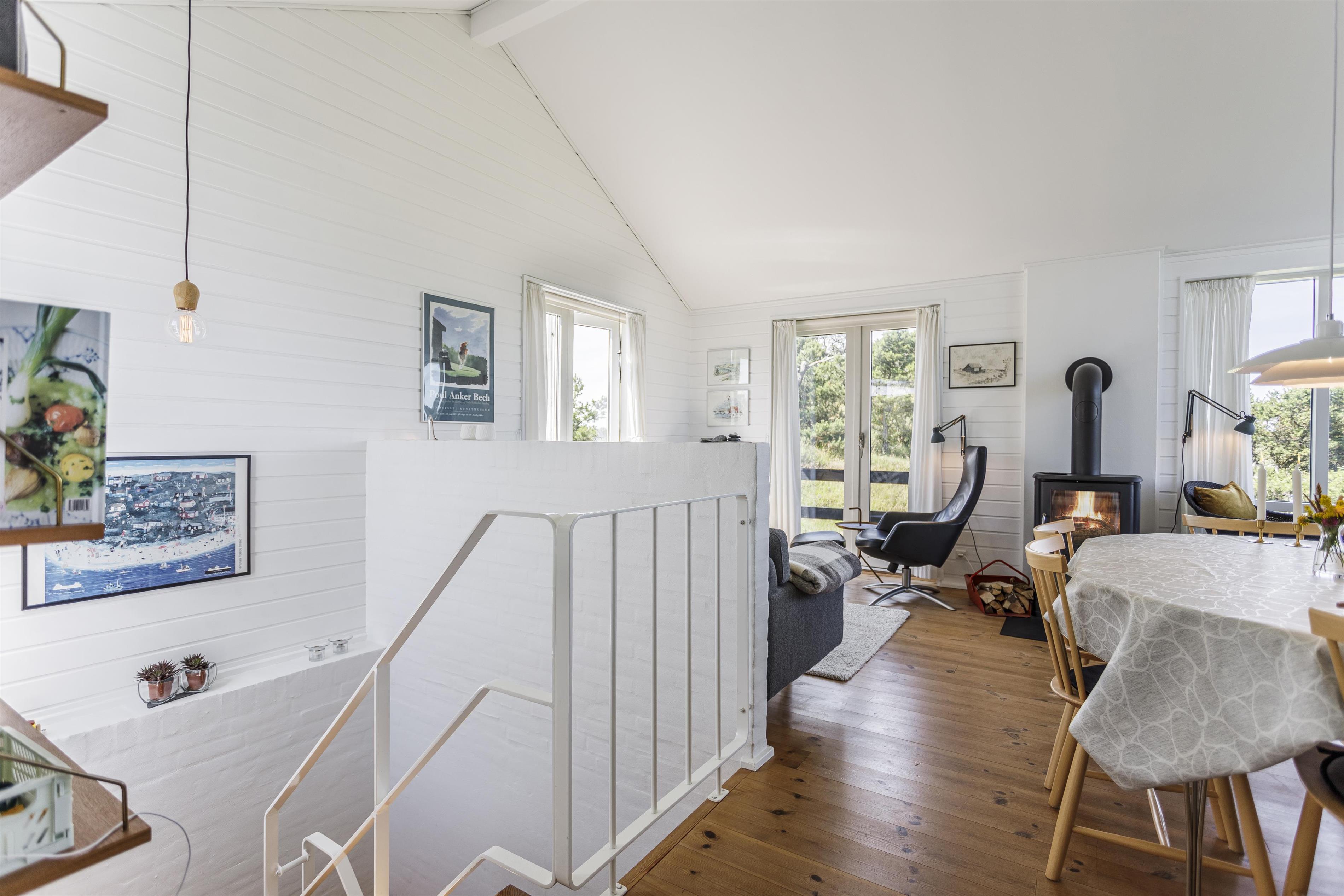 Midt i det kuperede klitlandskab finder du dette attraktive og meget velholdte feriehus med plads til 6 personer. Huset er i to plan og består af et dejligt køkkenalrum, hvor I kan samles om måltiderne, spille spil eller blot nyde en god bog, mens brændeovnen knitrer i baggrunden. Takket være de store vinduespartier er der et helt utroligt lysindfald, og samtidig får du følelsen af at være ét med naturen. Sæt dig til rette i kurvestolene og se hvordan fasaner, harer og råvildt lægger vejen forbi grunden, eller betragt hvordan farverne forandrer sig i takt med årstidernes skifte. I stueplan finder du desuden et fint soveværelse med gode opbevaringsmuligheder samt badeværelse. Feriehuset er gennemgribende renoveret og fremstår moderne og indbydende.