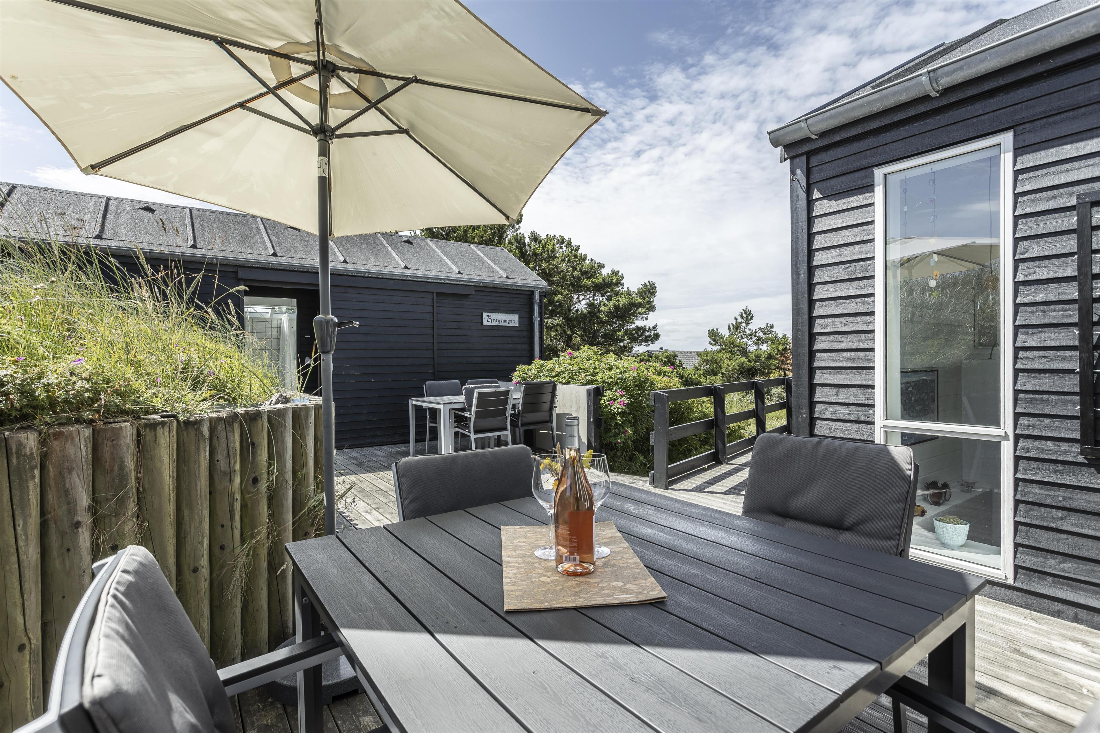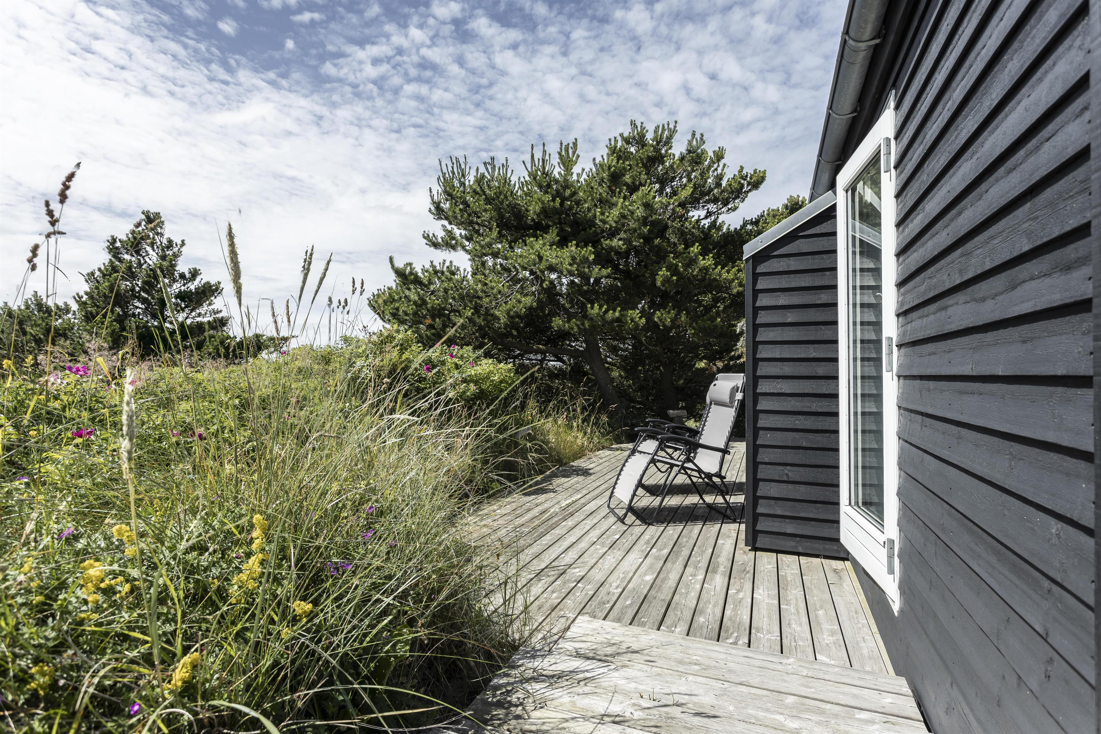 Sommerhuset er placeret på en spændende naturgrund, hvor man har udnyttet det kuperede terræn og indrettet flere hyggelige udemiljøer. Nyd den store træterrasse, som binder feriehuset og annekset sammen. Her er der rig mulighed for at finde en god lækrog i solen, mens du nyder stilheden og den friske havluft.