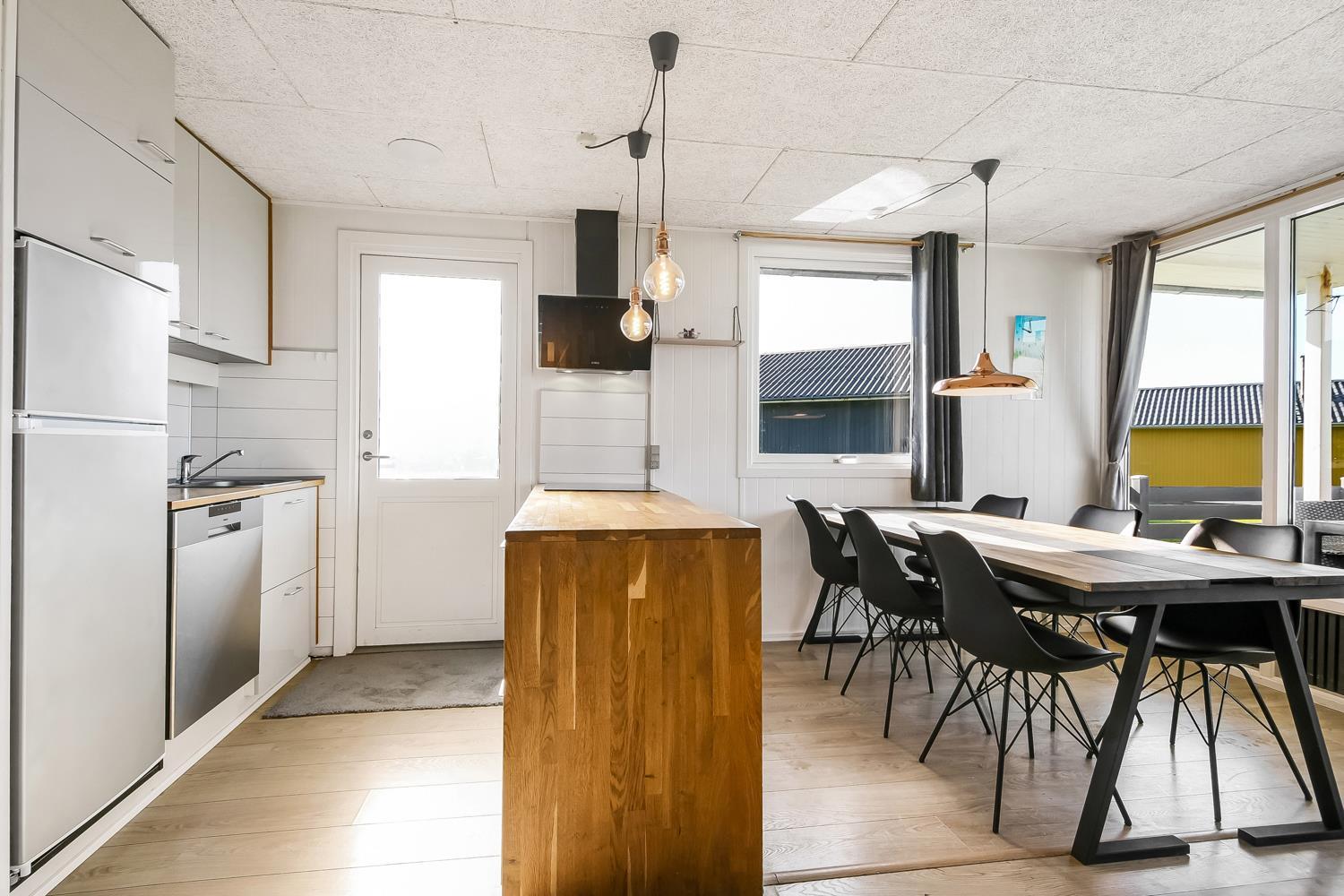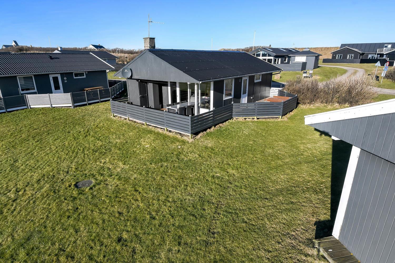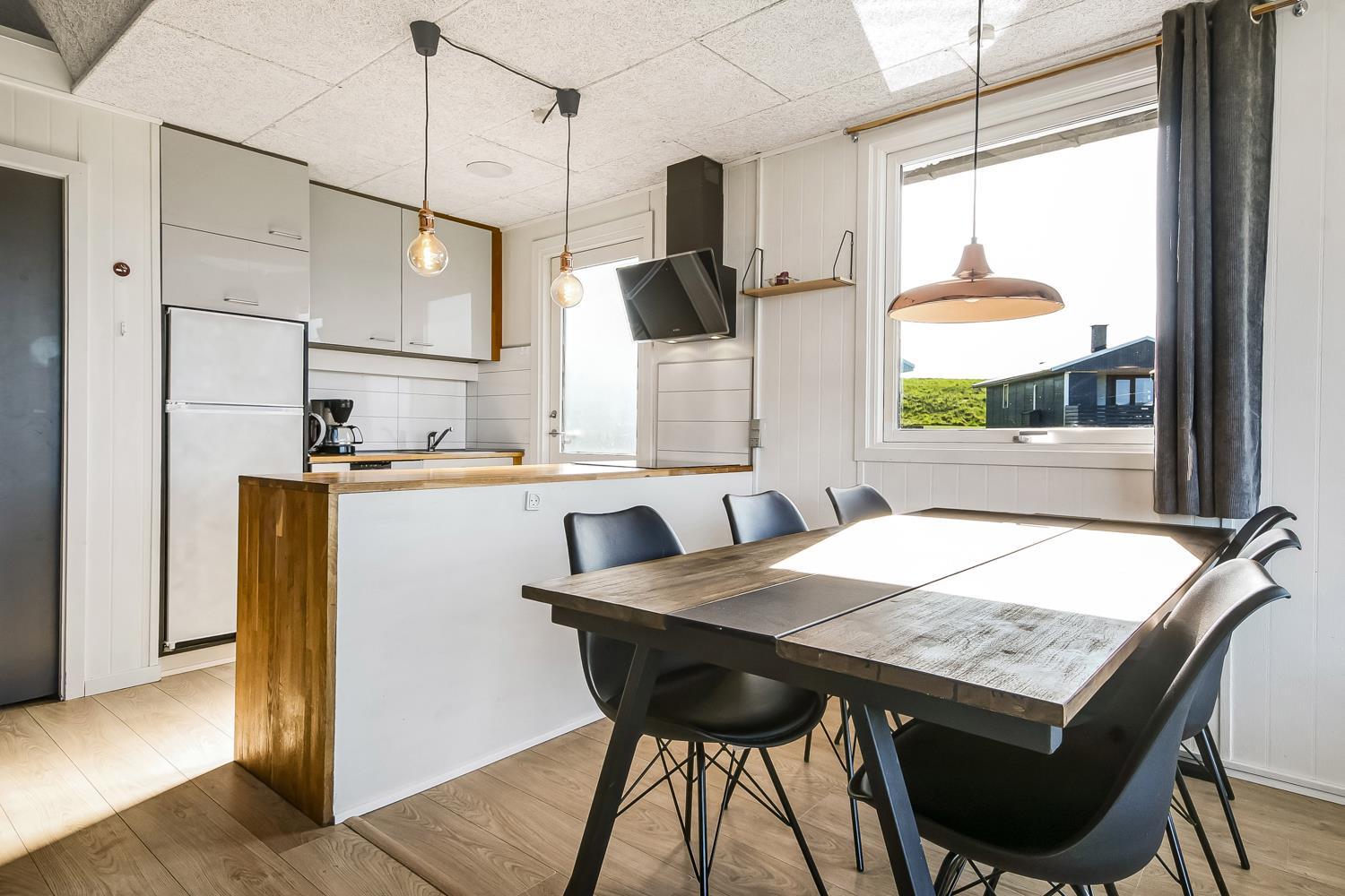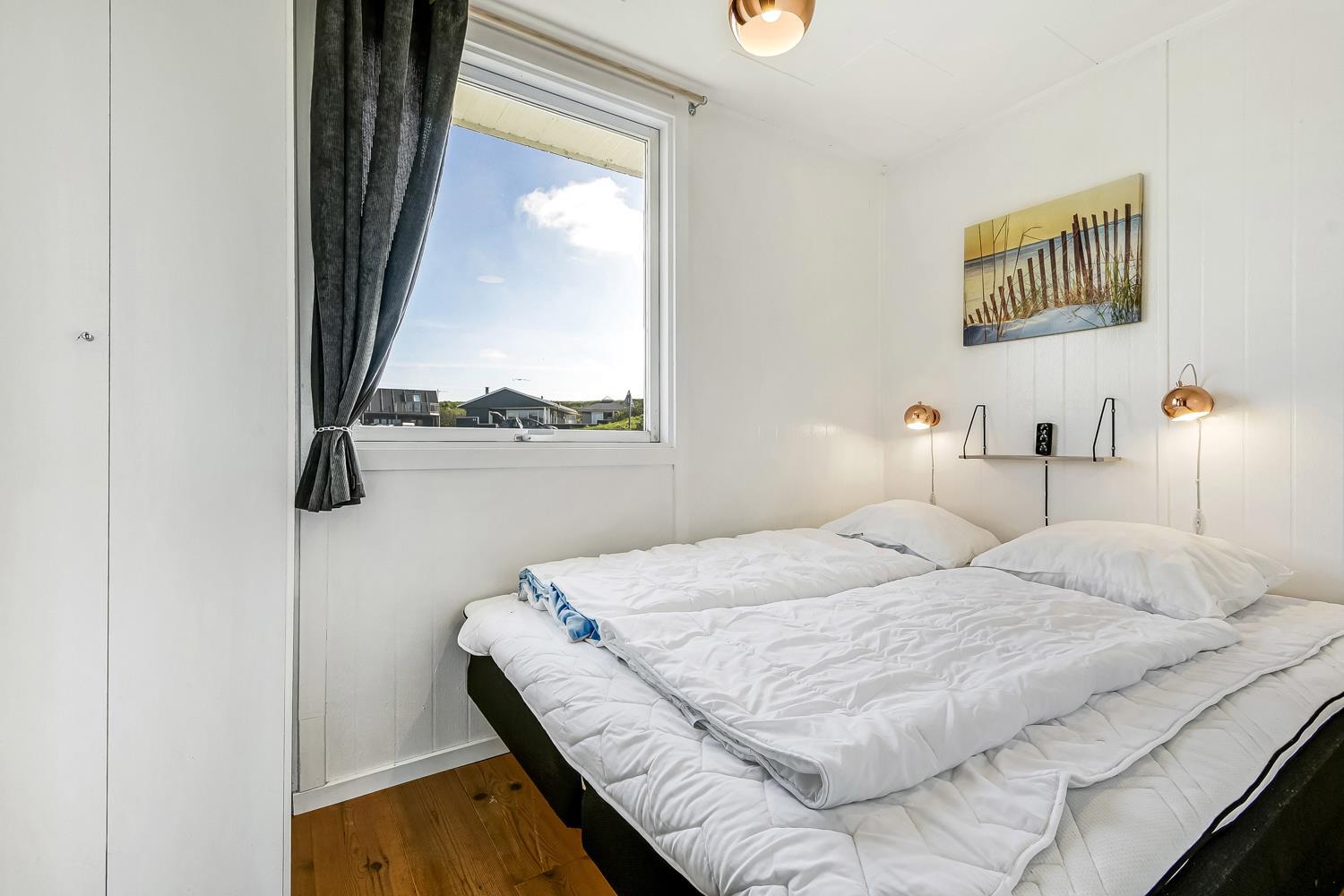 Huset er lyst og venligt indrettet med komfortable lædermøbler, brændeovn som giver en behagelig varme også på de kolde dage samt TV med danske og tyske programmer. Der er lyse trægulve i stue og køkkenafdelingen. Åben køkken som er indrettet med elkomfur, emhætte, opvaskemaskine og mikroovn. Badeværelse med bruser, toilet, håndvask. 3 soverum med 1DB + 1DB og 1 køjeseng. Der er trægulve i soverummene. Der er også en vaskemaskine i huset. Fra stue og køkkenet er der en fantastisk udsigt til Vesterhavet og fællesarealet med legeplads og bålplads ligger lige udenfor døren. Der er gratis internetadgang. 2 husdyr er tilladt. Rygning er ikke tilladt.