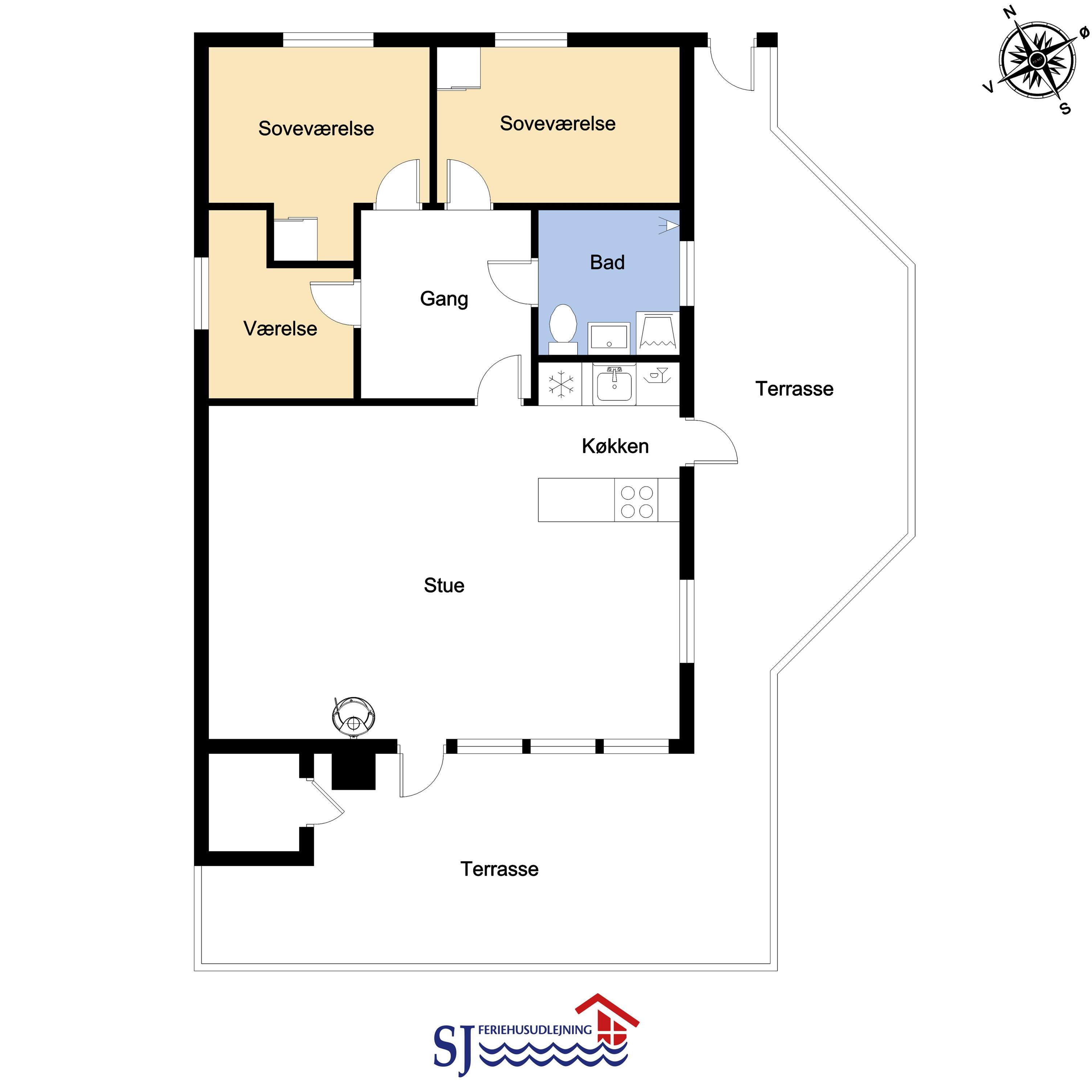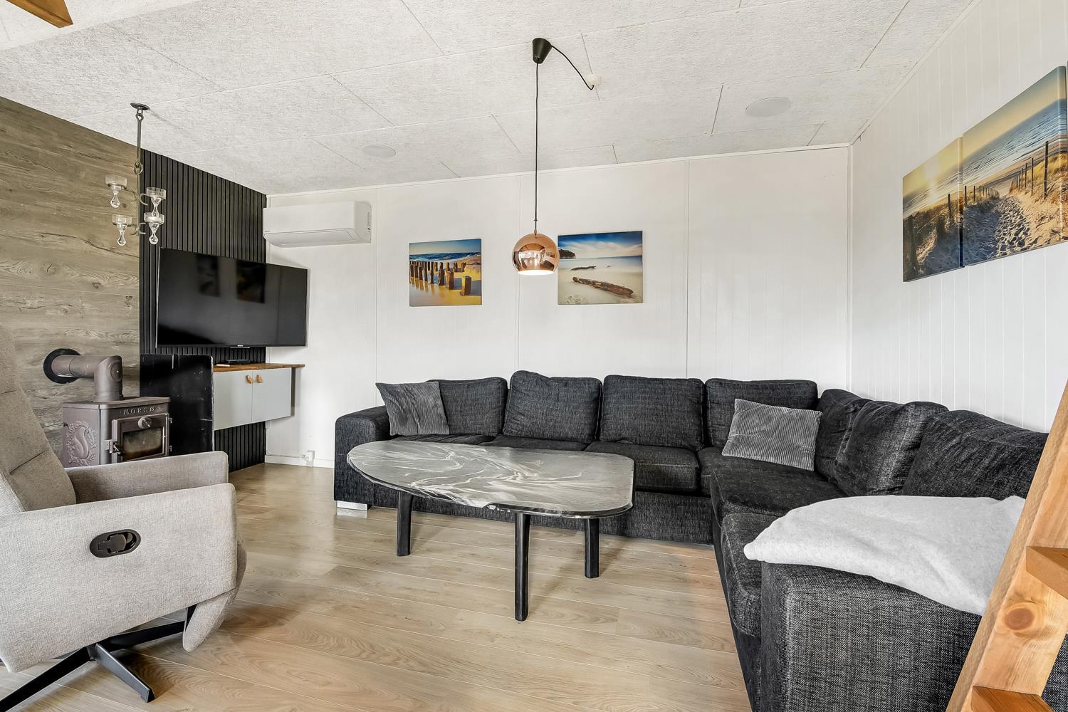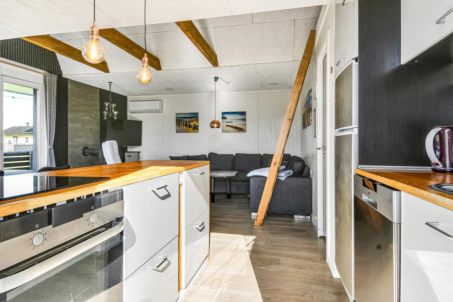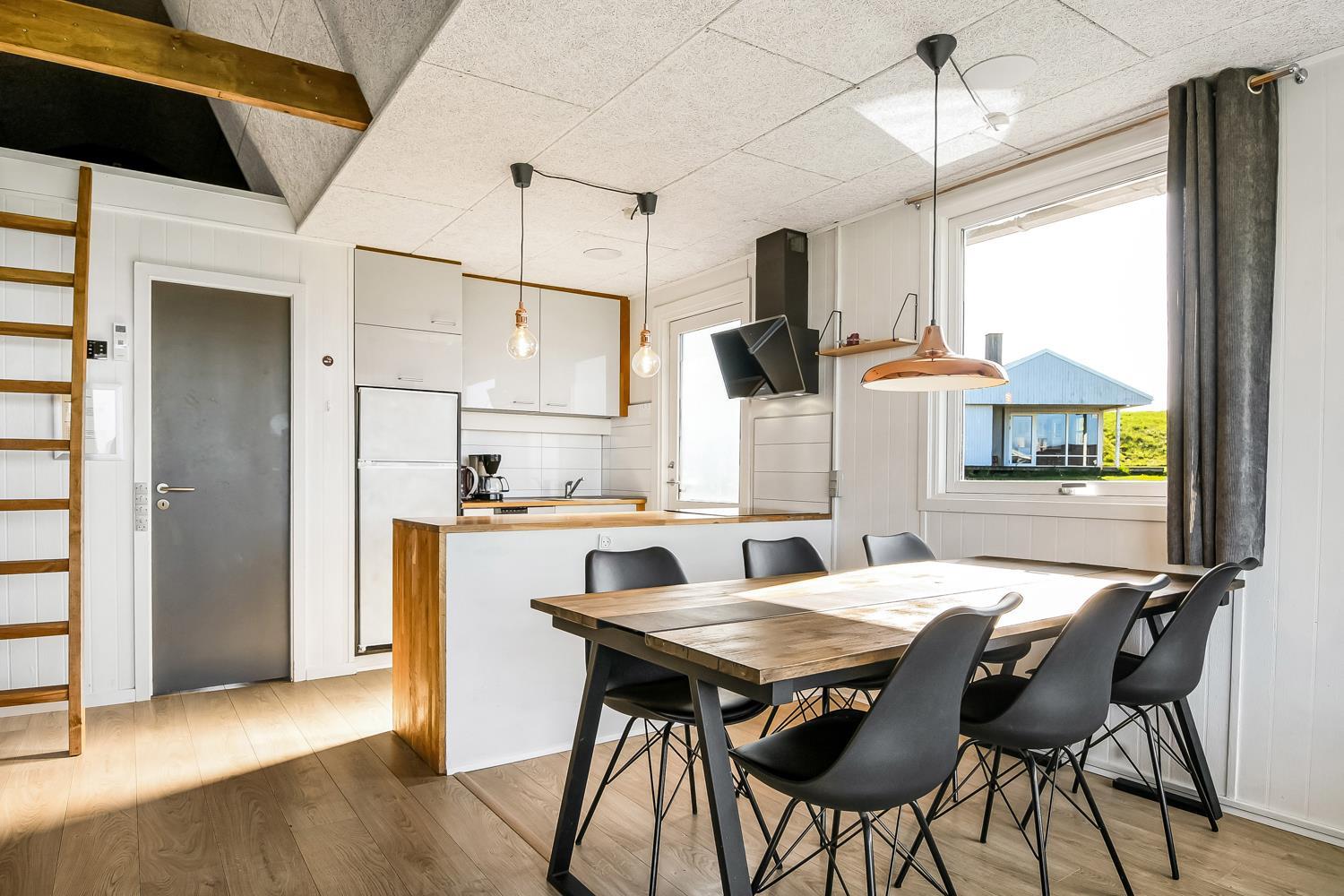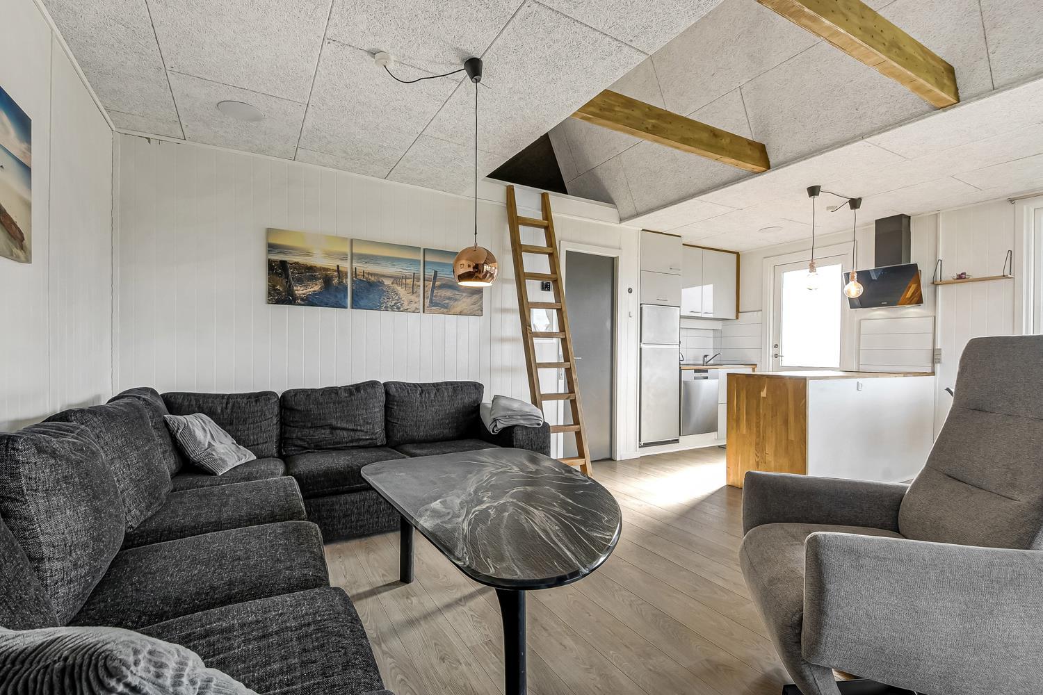 Huset er lyst og venligt indrettet med komfortable lædermøbler, brændeovn som giver en behagelig varme også på de kolde dage samt TV med danske og tyske programmer. Der er lyse trægulve i stue og køkkenafdelingen. Åben køkken som er indrettet med elkomfur, emhætte, opvaskemaskine og mikroovn. Badeværelse med bruser, toilet, håndvask. 3 soverum med 1DB + 1DB og 1 køjeseng. Der er trægulve i soverummene. Der er også en vaskemaskine i huset. Fra stue og køkkenet er der en fantastisk udsigt til Vesterhavet og fællesarealet med legeplads og bålplads ligger lige udenfor døren. Der er gratis internetadgang. 2 husdyr er tilladt. Rygning er ikke tilladt.