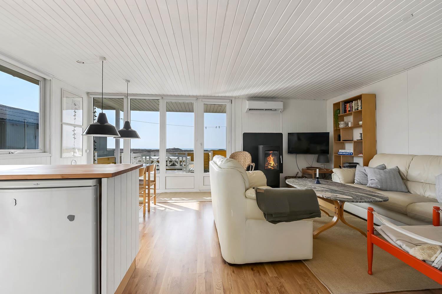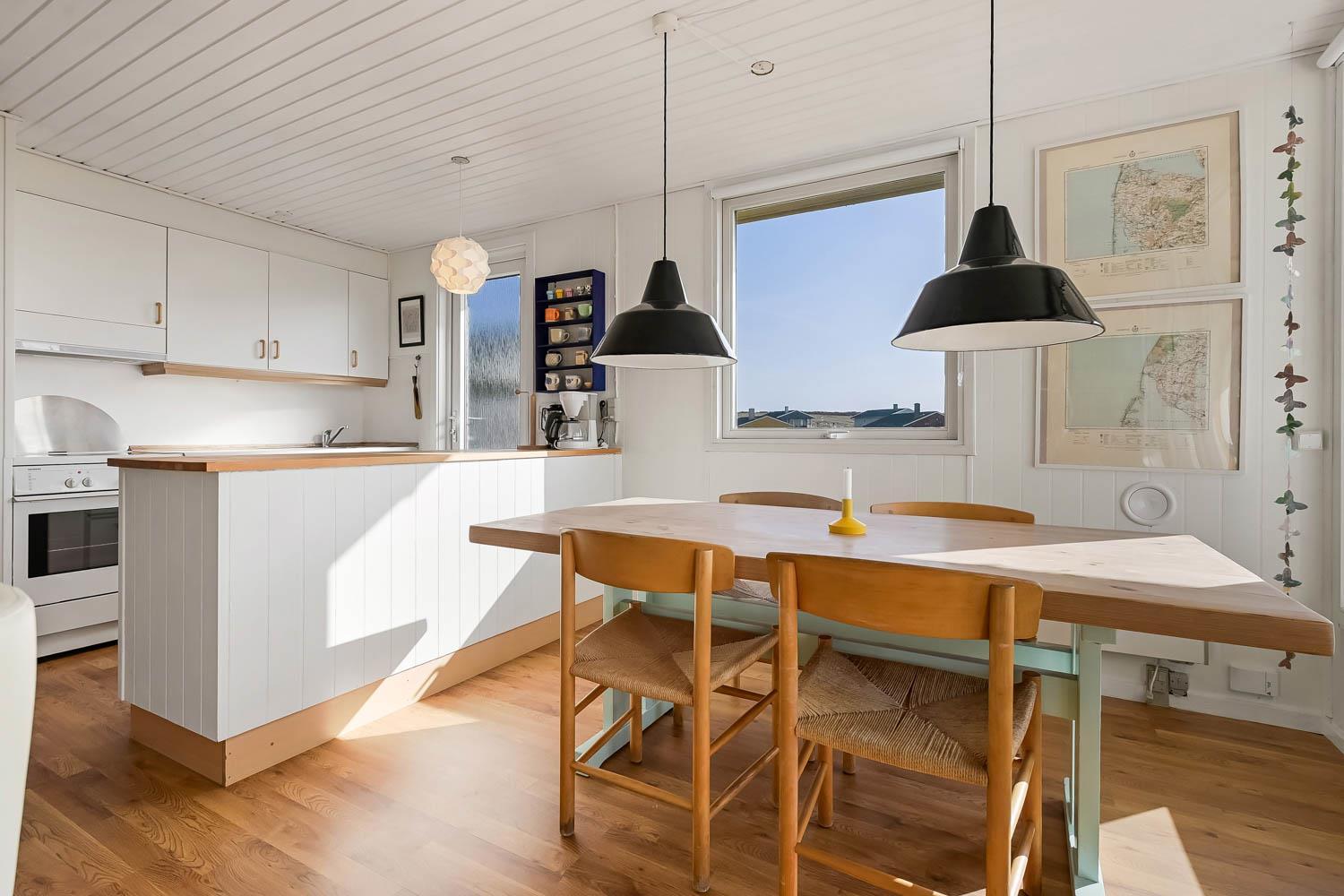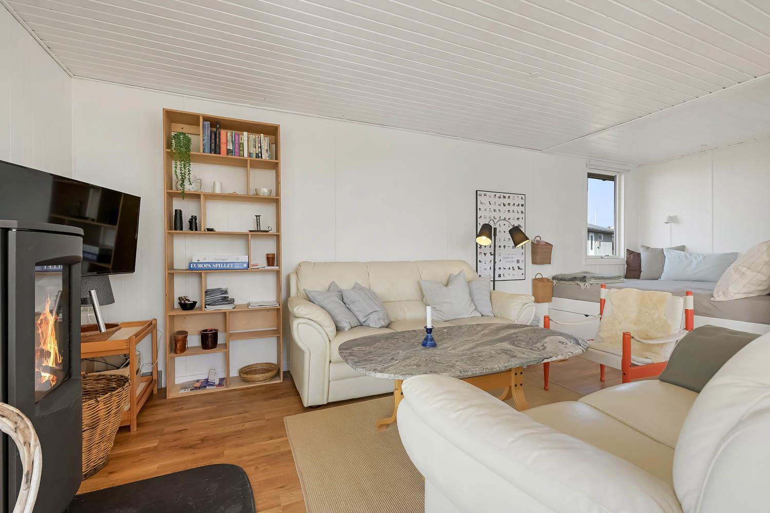 Huset er lyst og smagfuldt indrettet med kombineret opholdsstue og køkkenhjørne, som skaber en hyggelig ramme for ferien. Opholdsstuen er møbleret med både læder- og polstermøbler, Smart-TV med danske og tyske programmer samt mulighed for streaming af TV, radio og apps. Den hyggelige brændeovn og varmepumpen, skaber en varm og stemningsfuld atmosfære, mens I nyder udsigten til Vesterhavet.
