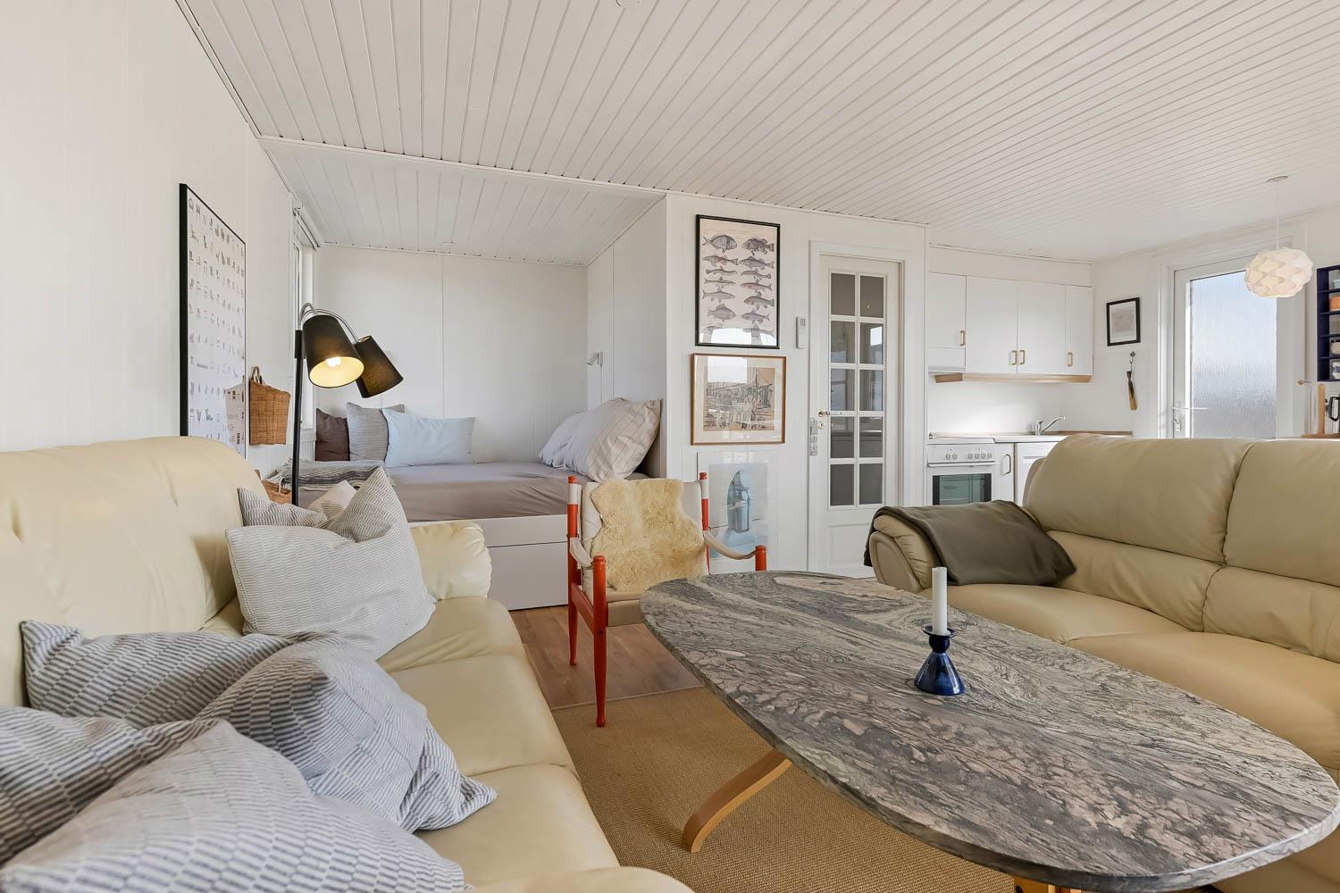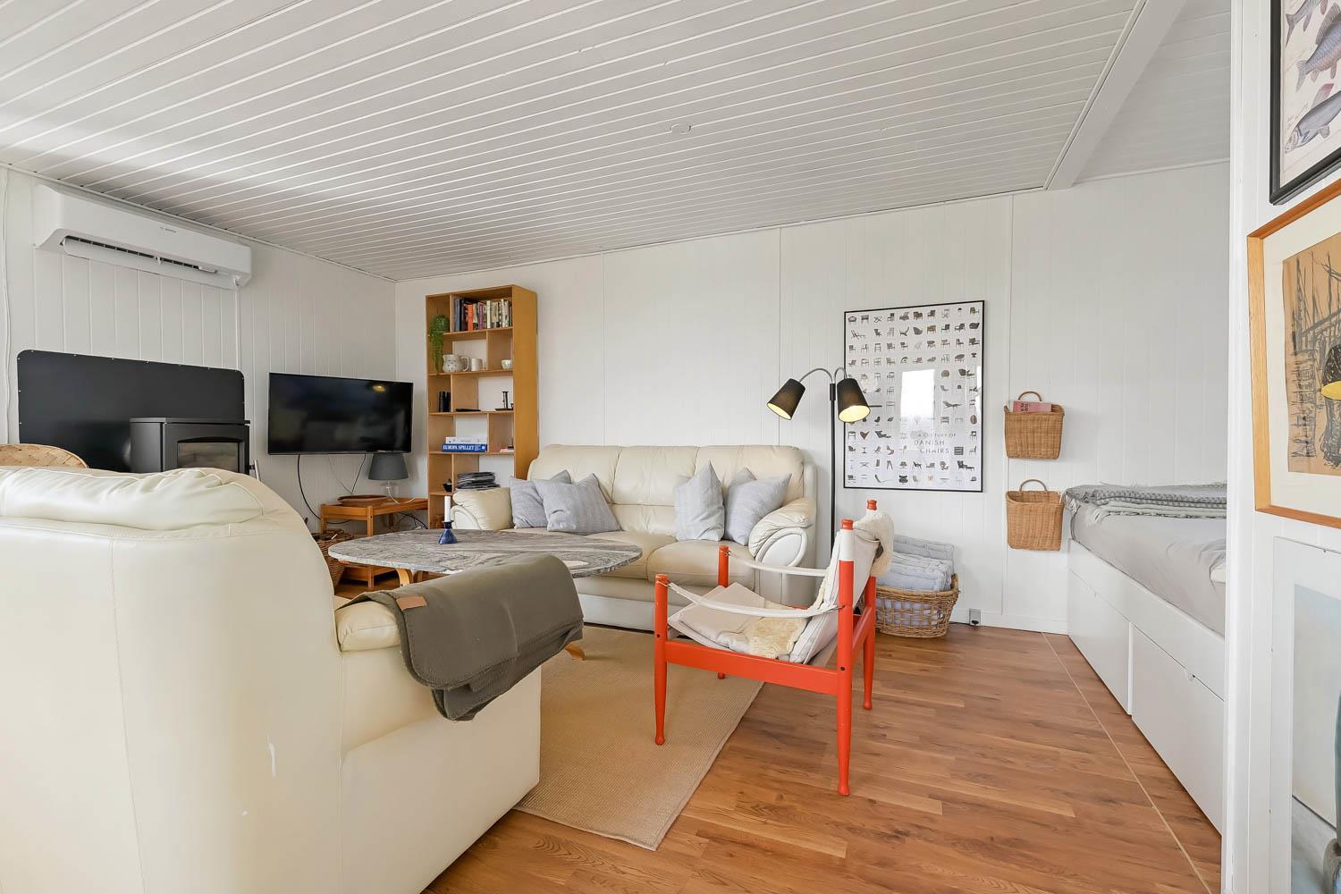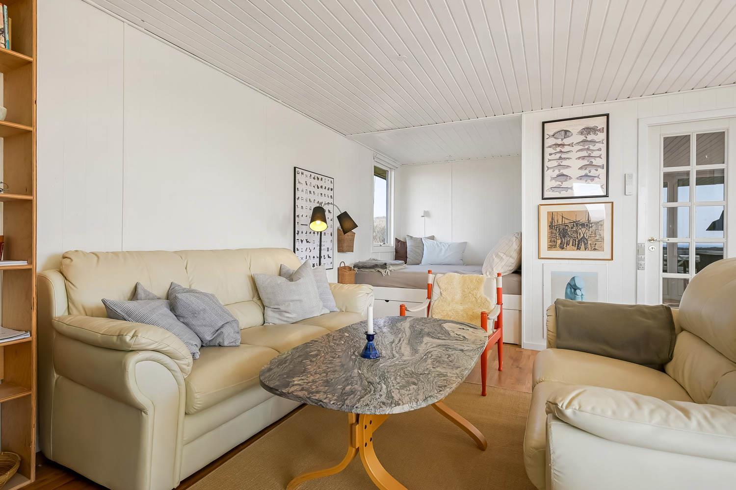 Huset er lyst og smagfuldt indrettet med kombineret opholdsstue og køkkenhjørne, som skaber en hyggelig ramme for ferien. Opholdsstuen er møbleret med både læder- og polstermøbler, Smart-TV med danske og tyske programmer samt mulighed for streaming af TV, radio og apps. Den hyggelige brændeovn og varmepumpen, skaber en varm og stemningsfuld atmosfære, mens I nyder udsigten til Vesterhavet.