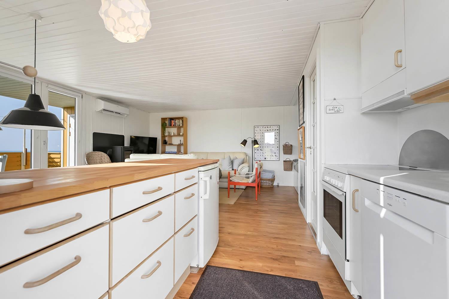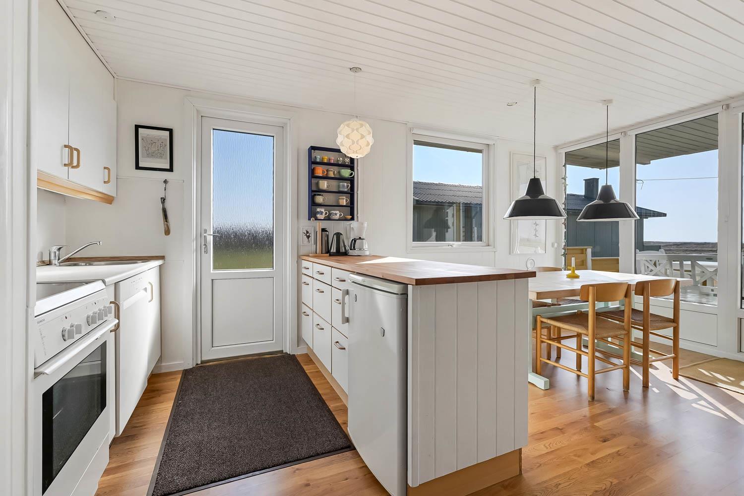 Det pæne køkkenhjørne er veludstyret med keramiske kogeplader, indbygningsovn, emhætte, opvaskemaskine samt køleskab med lille fryseboks.