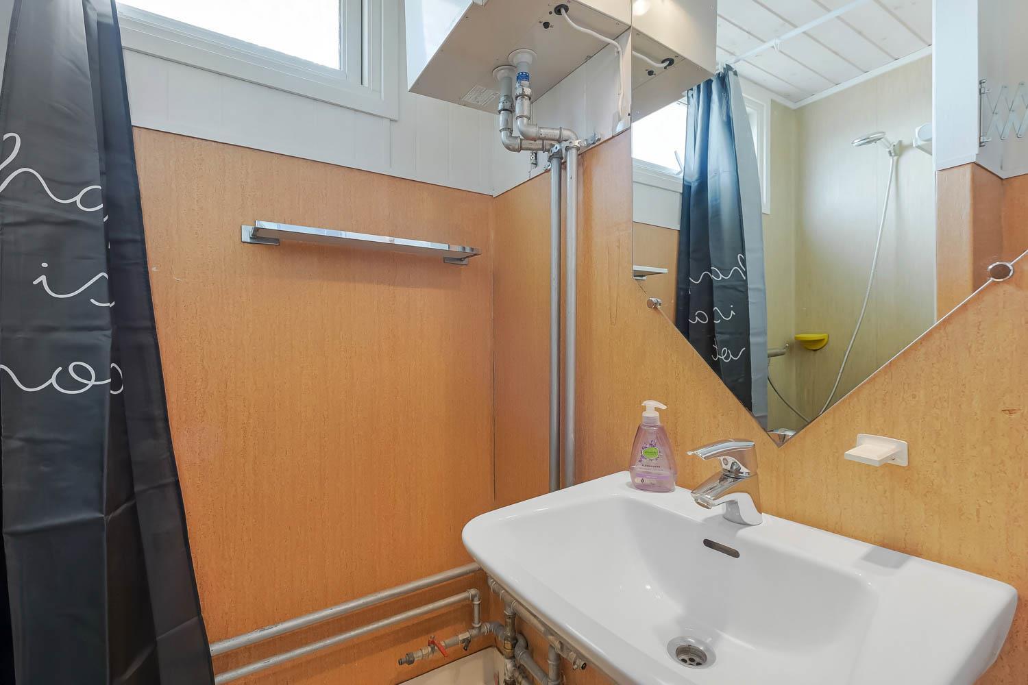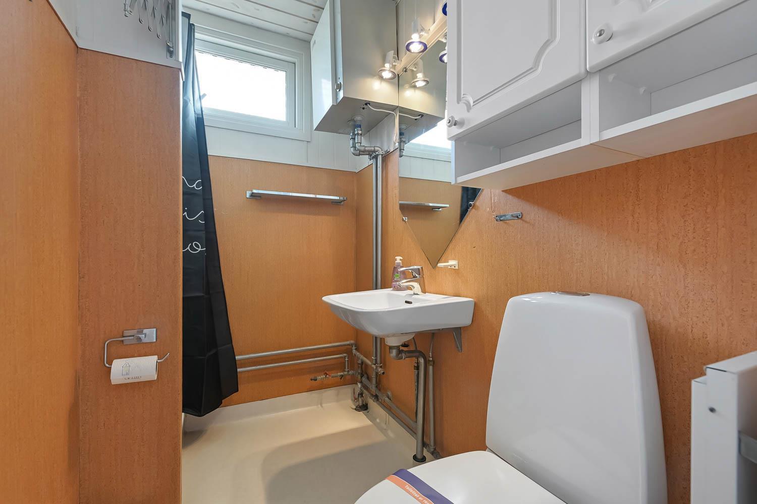 Badeværelset fremstår lyst og funktionelt med toilet, bruser og håndvask.