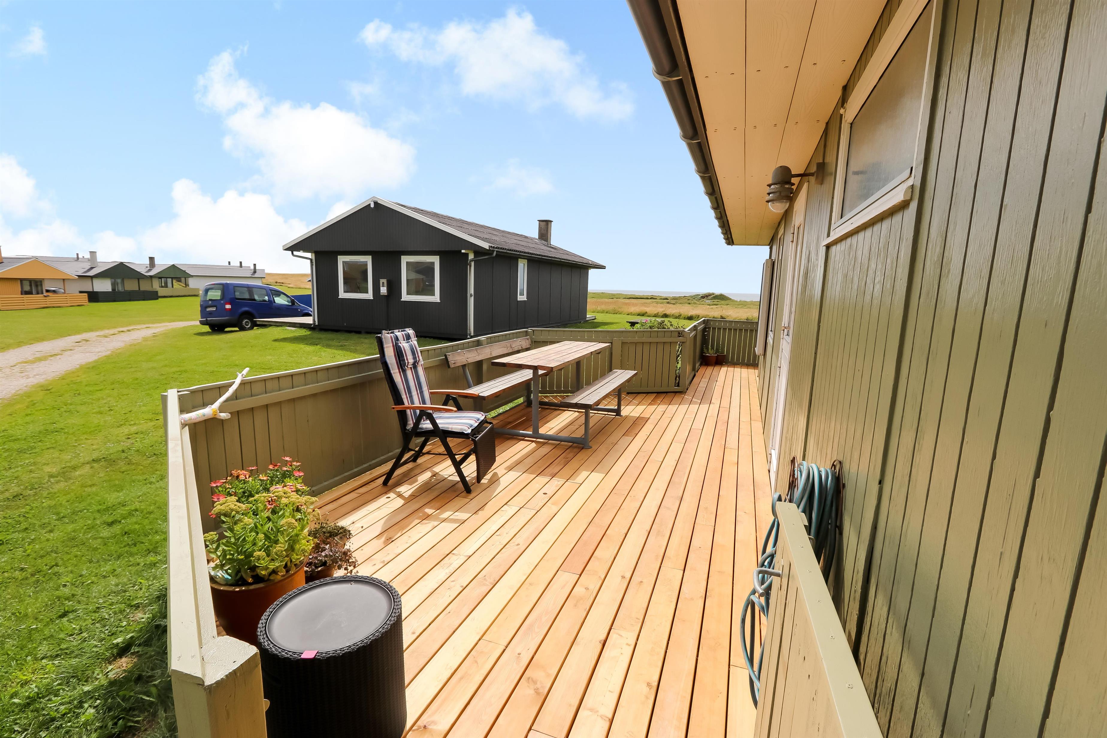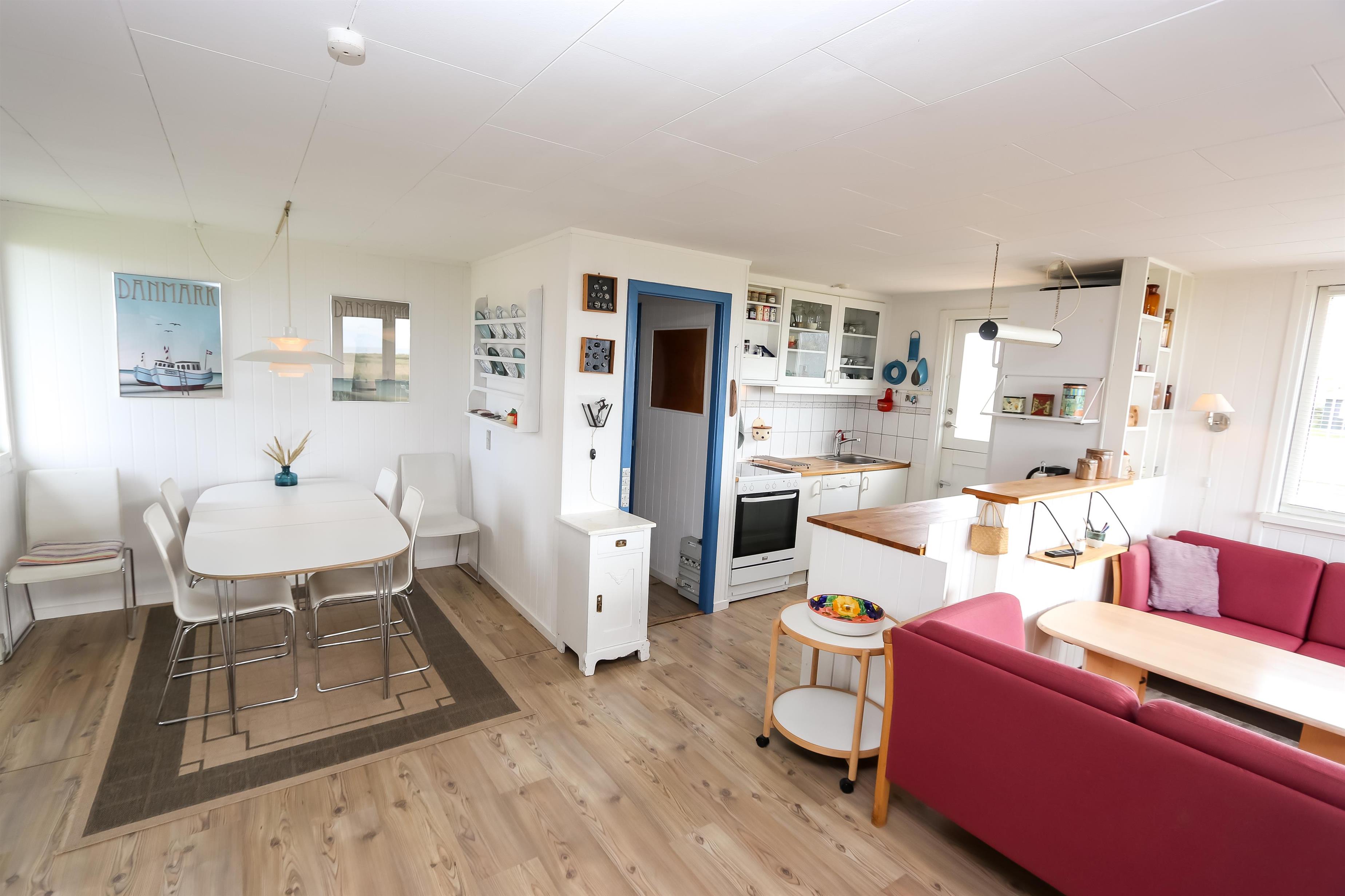 67 m2 træferiehus med 2 soveværelser (1DS, 2ES + 1KS). Kombineret opholdsstue og køkkenhjørne. Opholdsstue med polstermøbler, tv med danske og tyske kanaler, radio og spisebord. Nyd udsigten over Vesterhavet og slap af foran den knitrende brændeovn som sammen med varmepumpen hjælper med at reducere udgiften til varmeregningen. Pænt køkkenhjørne med komfur med glaskeramiske kogeplader, emhætte, opvaskemaskine og køleskab med fryseboks. Pænt badeværelse med toilet, bruser, håndvask og vaskemaskine. Fra stuen er der panoramaudsoigt til Vesterhavet. Der er trægulve i alle opholdsrum og linolium i soverum. Ikke ryger hus. Max 1 husdyr tilladt.