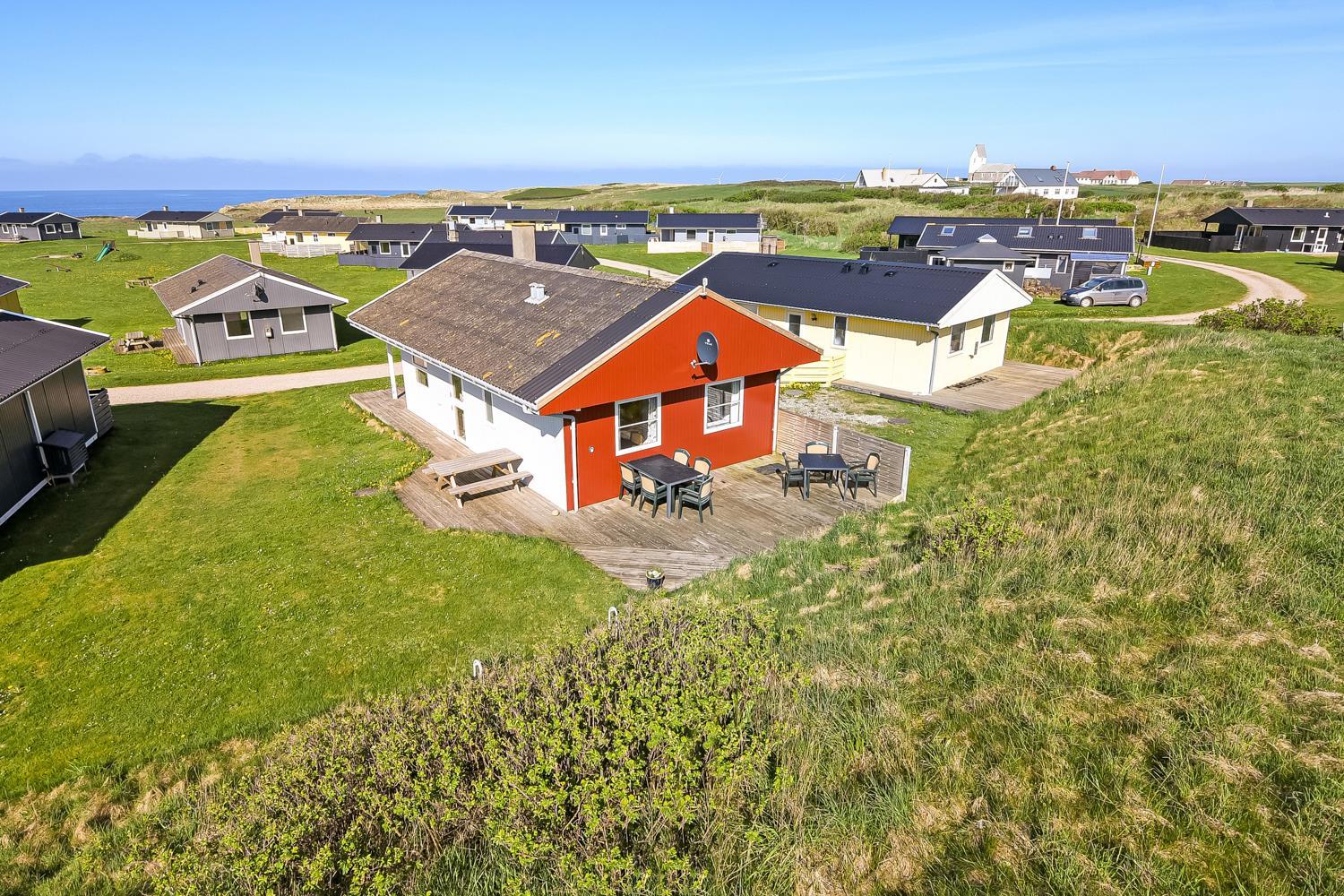 Træferiehus med Gratis Internet og delvis havkig til Vesterhavet. Beliggende i hyggelige og rolige Trans Ferieby kun 200m fra Vesterhavet.