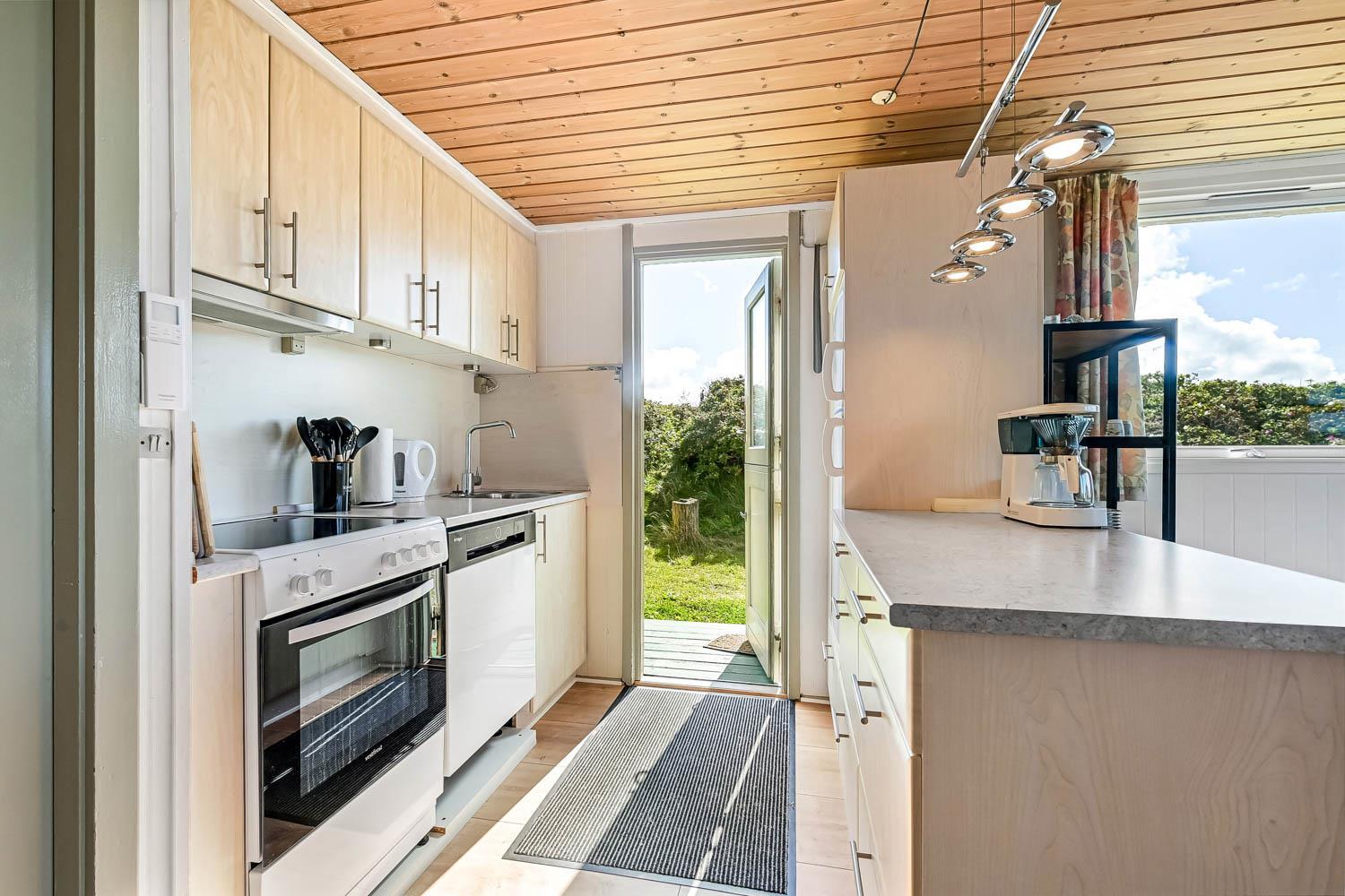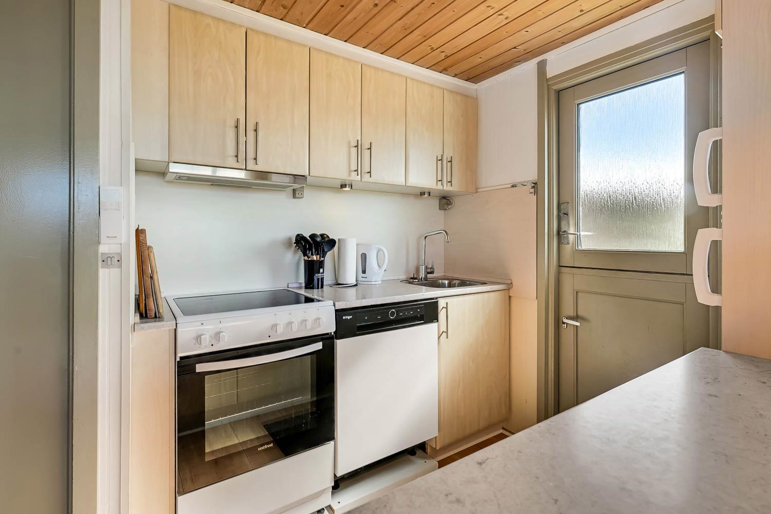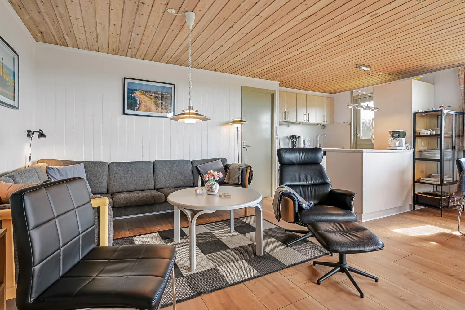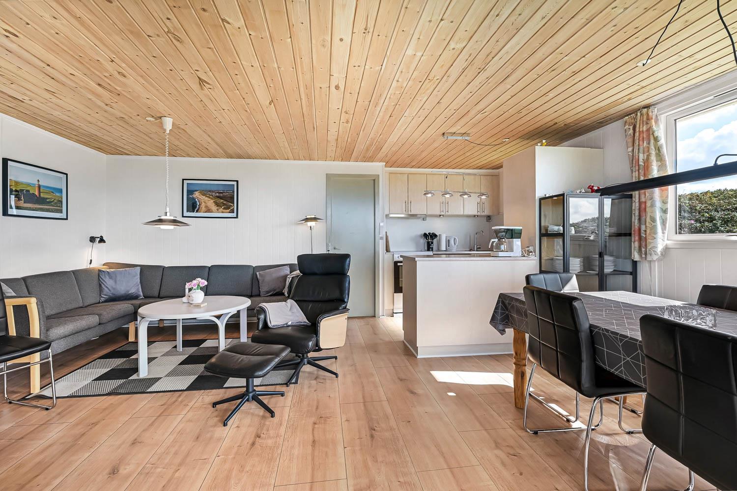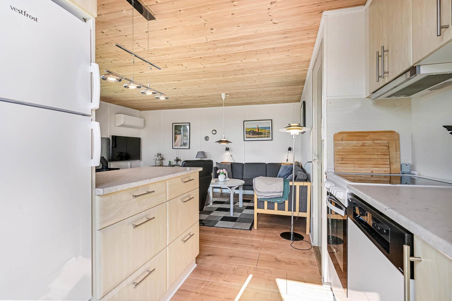 Pænt og hyggeligt indettet, 56 m2 træferiehus fra 1971 og renoveret i 2008. Vægge og lofter er i træ og der er 3 soveværelser (1DS, 2ES 1ES). Kombineret opholdsstue og køkkenhjørne. Lige på den anden side af køkkenhjørnet er spisebordet placeret. Opholdsstue med polstermøbler, tv med danske og tyske kanaler og cromecast til streaming, radio/CD og en dejlig brændeovn samt varmepumpe som skaber ekstra hygge og hjælper med at sparer på varmeregningen. Pænt køkkenhjørne med Induktions kogeplader, emhætte, mikroovn, køleskab med fryseboks og opvaskemaskine. Ekstra fryser på 80L i køjerummet. Pænt badeværelse med toilet, bruser og håndvask samt en minivaskemaskine. Der er linoleumsgulve i alle rum, som gør at huset er nemt at rengøre. Ikke ryger hus. Max 1 husdyr tilladt.