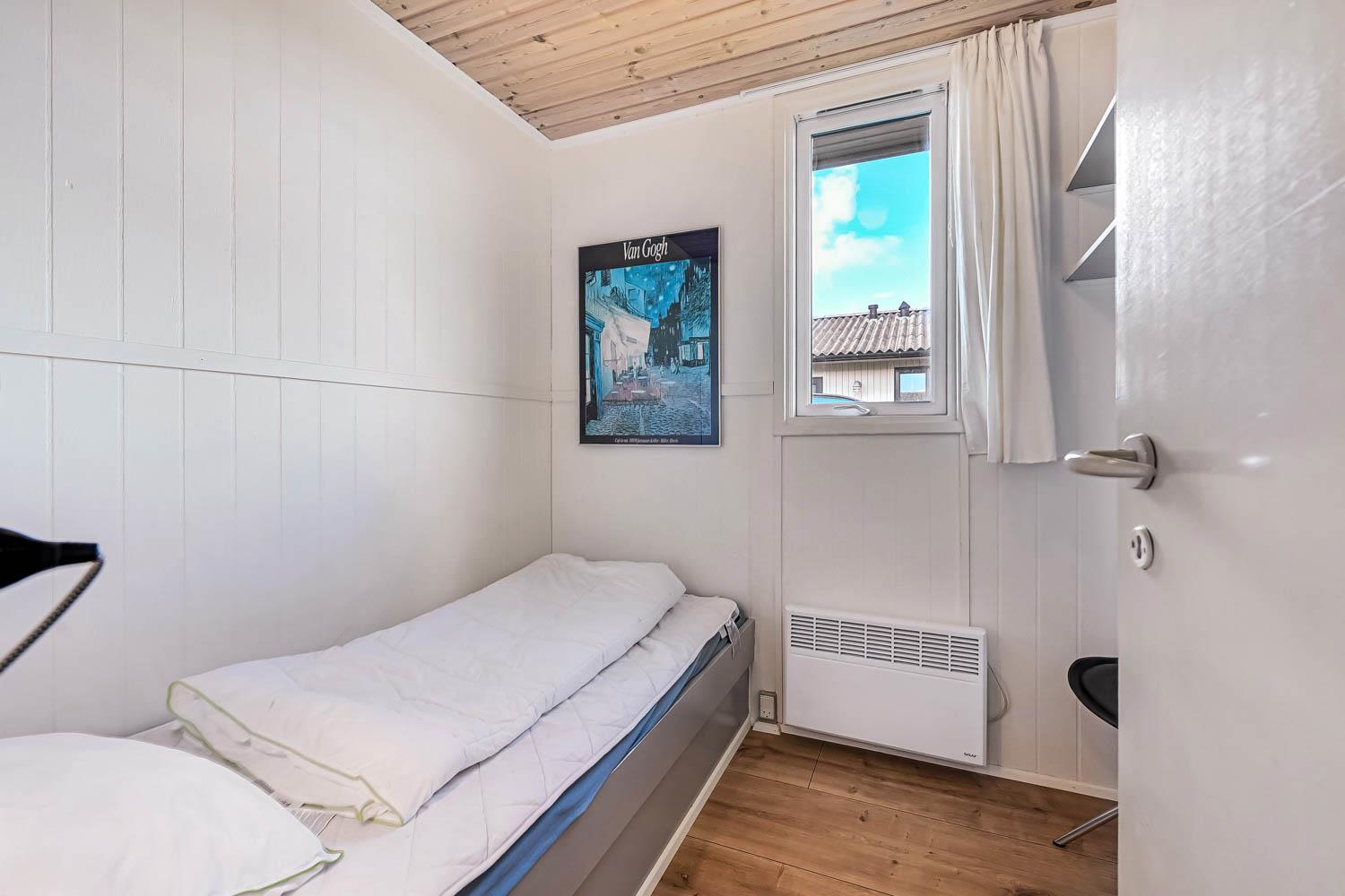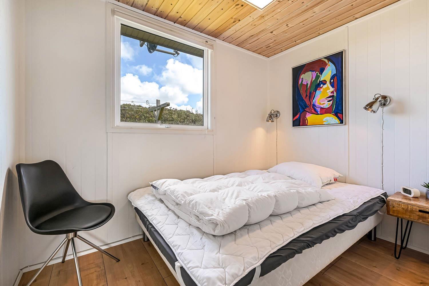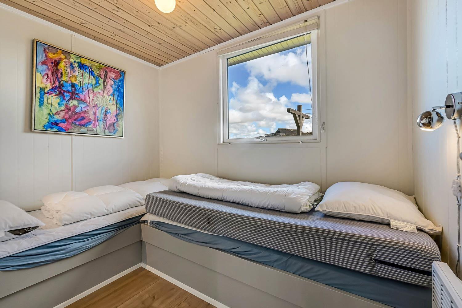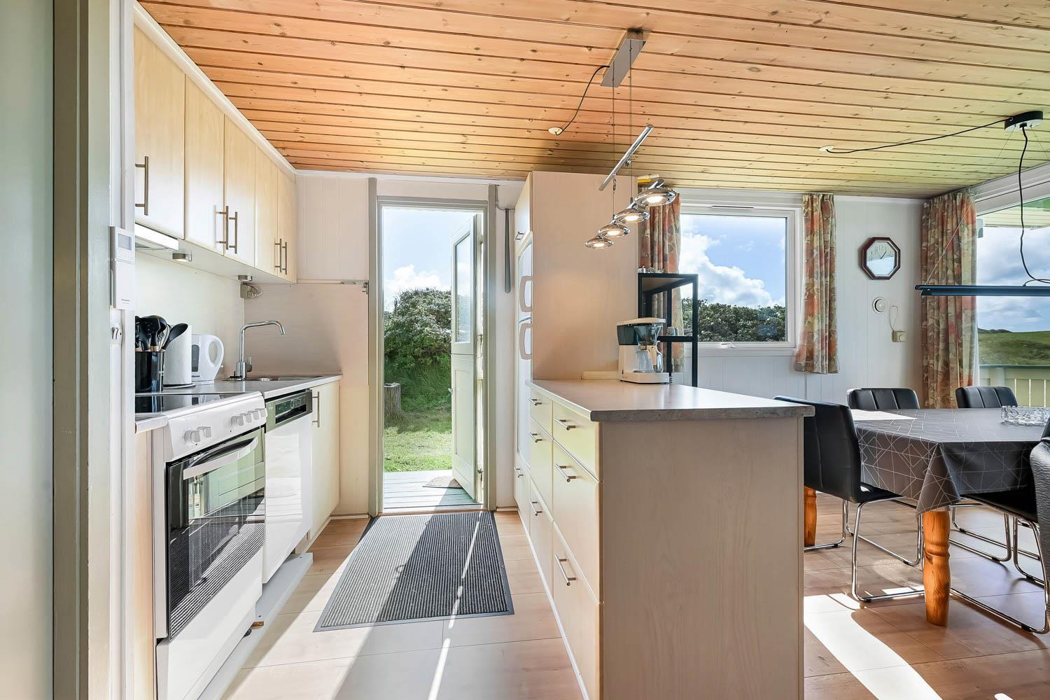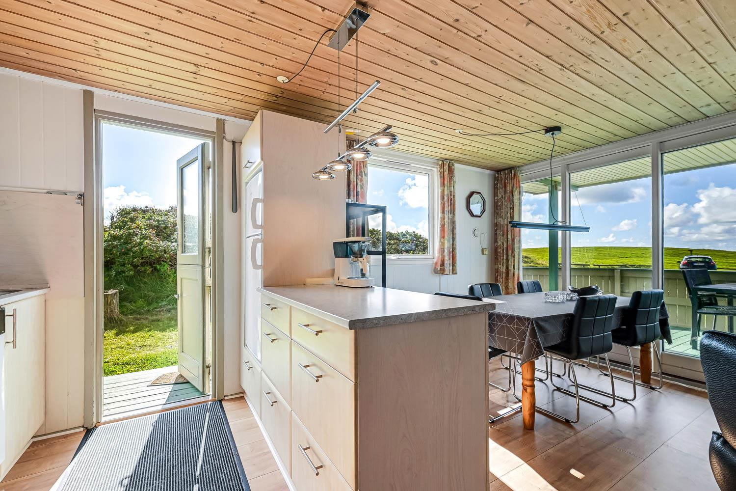 Pænt og hyggeligt indettet, 56 m2 træferiehus fra 1971 og renoveret i 2008. Vægge og lofter er i træ og der er 3 soveværelser (1DS, 2ES 1ES). Kombineret opholdsstue og køkkenhjørne. Lige på den anden side af køkkenhjørnet er spisebordet placeret. Opholdsstue med polstermøbler, tv med danske og tyske kanaler og cromecast til streaming, radio/CD og en dejlig brændeovn samt varmepumpe som skaber ekstra hygge og hjælper med at sparer på varmeregningen. Pænt køkkenhjørne med Induktions kogeplader, emhætte, mikroovn, køleskab med fryseboks og opvaskemaskine. Ekstra fryser på 80L i køjerummet. Pænt badeværelse med toilet, bruser og håndvask samt en minivaskemaskine. Der er linoleumsgulve i alle rum, som gør at huset er nemt at rengøre. Ikke ryger hus. Max 1 husdyr tilladt.