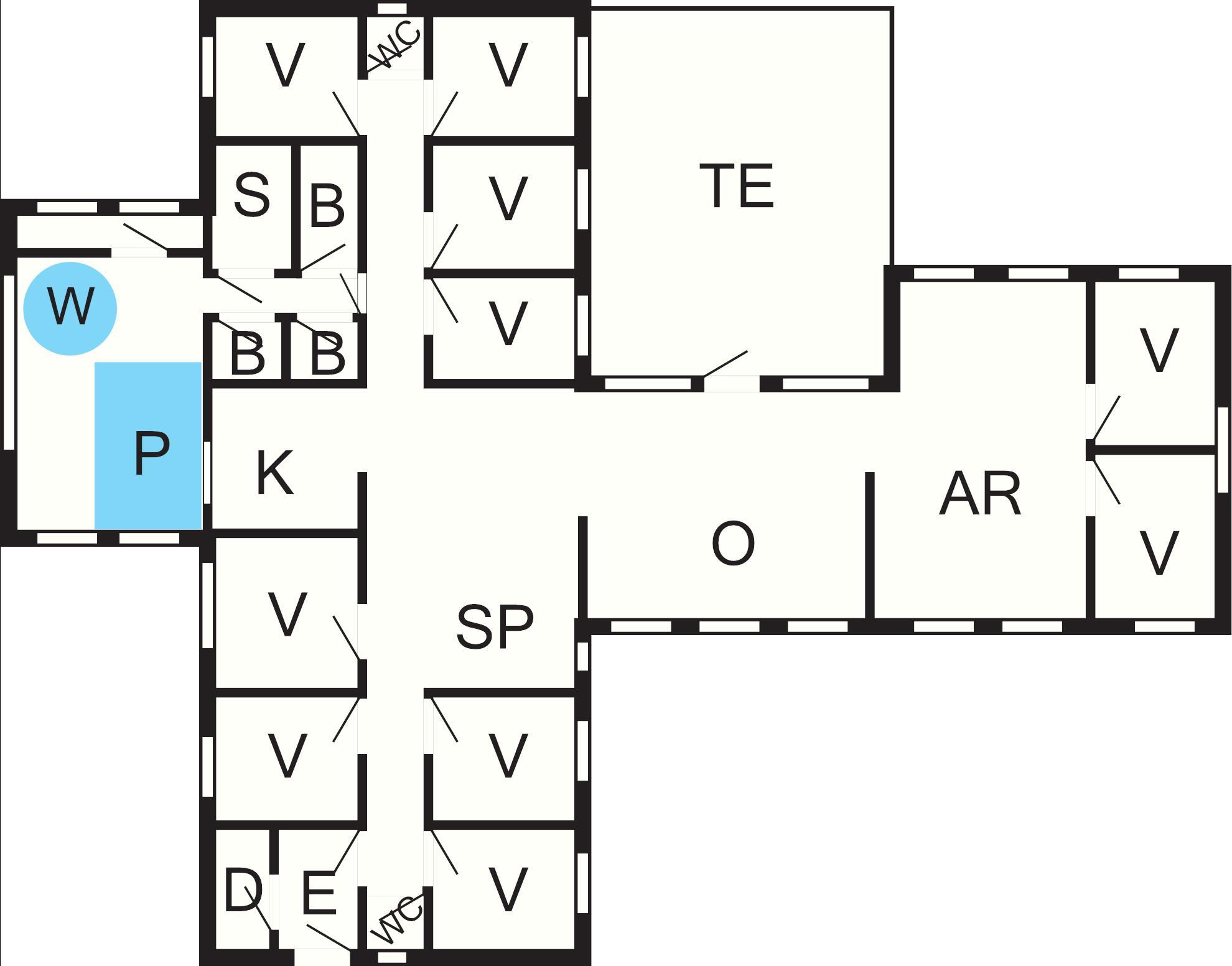 Huset har 10 soveværelser, babyseng og højstol. 2 toiletter med håndvask og wc, 2 baderum med håndvask og bruser samt 1 toilet med håndvask og bruseniche, alle med gulvvarme.