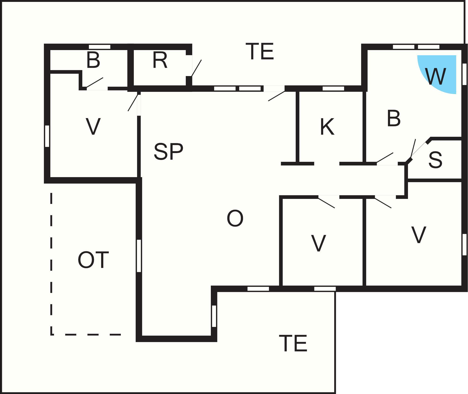 Sommerhus beliggende i den østligste del af det spændende nye ferieområde ved Tranum Strand. Huset er fuldmuret og beklædt med træ udvendig, hvilket giver en god akustik og et godt indeklima året rundt. Indretningen er lys og smagfuld. Badeværelset har gulvvarme, sauna og spabad. Køkkenet er i åben forbindelse med stuen, hvor brændeovnen kan nydes både fra spise- og sofaområdet. Huset indeholder 2 store soveværelser samt et mindre værelse med to enkeltsenge. Gæstetoilettet, der er placeret i forbindelse med det ene soveværelse, har brus og gulvvarme og udgør en regulær voksenafdeling. Der er potte og barneseng med dyne og pude til de helt små børn. Indretningen er let og lys. Der er tænkt over lysindfaldet og resultatet er blevet store vinduespartier mod syd og vest, hvilket gør opholdsrummene usædvanlig lyse og tiltalende og meget behagelige at opholde sig i. Til den overdækkede terrasse er der adgang direkte fra stuen, der naturligvis indbyder til udelivets glæder såsom solbadning, hygge omkring grillen eller bare almindelig afslapning. Grunden ligger ugeneret af den øvrige trafik i området og der er kort afstand til fællesarealerne, som indeholder bl.a. legeplads, boldbaner og æblelund. Grunden, der grænser op til et fredet område, er tilsået med græs – en herlig tumleplads for børnene. Her er sandkasse og rutchebane.