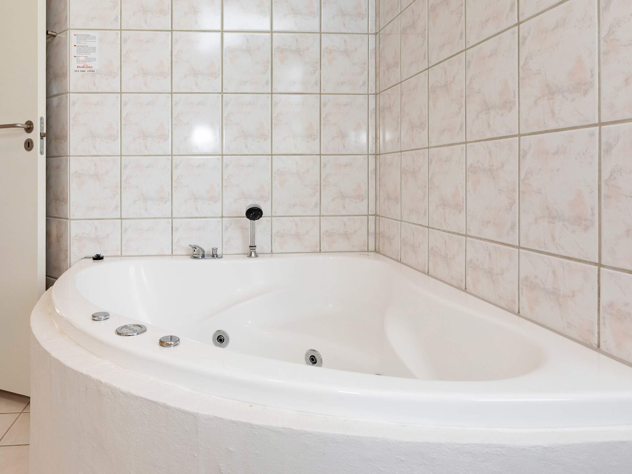 Badeværelse med bruser, badekar, toilet, spabad og sauna til fire personer.