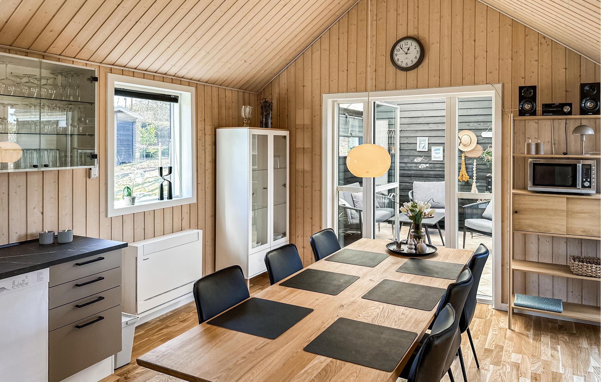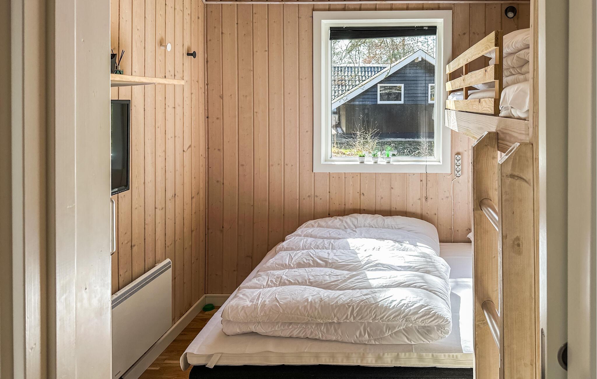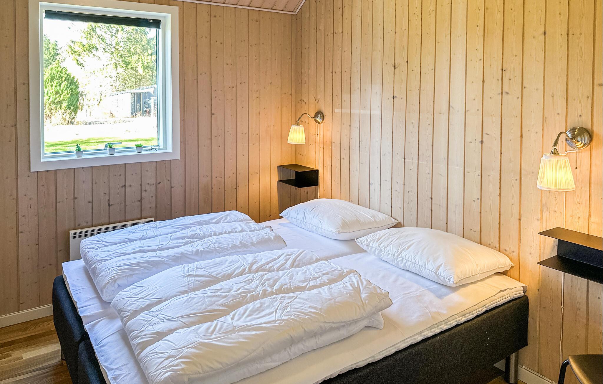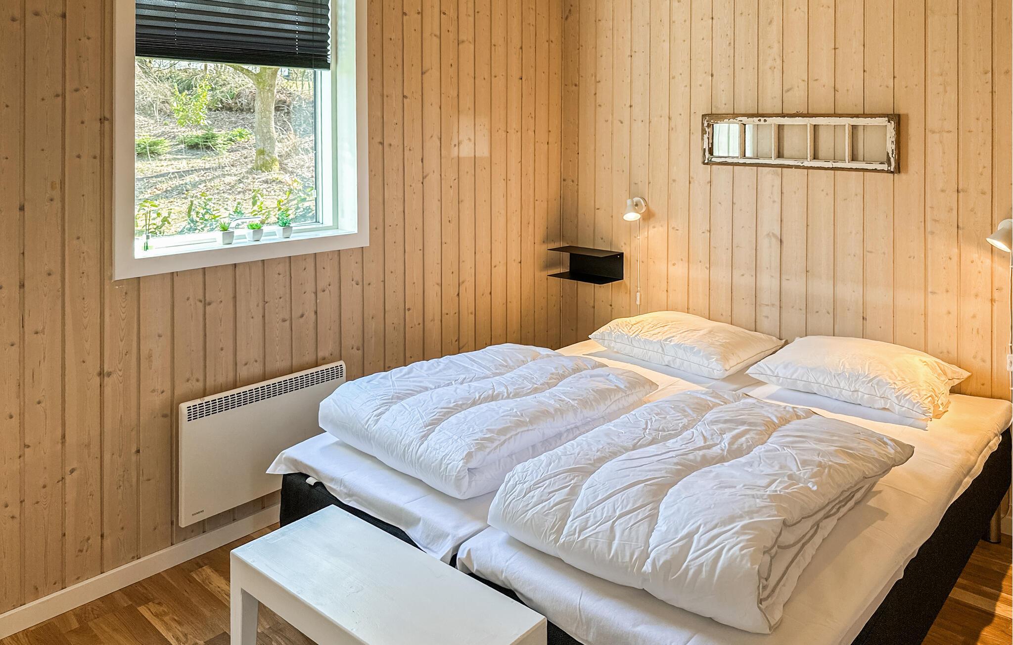 Huset er meget praktisk opdelt. I hovedhoset finder I stue og køkken, et godt soveværelse med dobbeltseng samt et badeværelse. Fra køkken-alrum er der adgang til en meget hyggelig udestue. Her kan dørene åbnes helt op, så det føles som man sidder ude på terrassen, men stadig i læ for vind og dug. Her er virkelig basis for nogle dejlige aftener både sommer og vinter. Fra udestuen er der adgang til den anden del af huset. Her finder I 2 soveværelser - det ene med dobbeltseng og det andet med en 3/4 senge og en enkelt køje ovenover - samt et dejligt stort badeværelser med adgang til spa og sauna. Ud fra udestuden er der adgang til den dejligste lukket terrasse, hvor der virkelig er basis for en dejlig grillaften. I skuret finder I fiskestænger, som er til fri afbenyttelse, og har I været nede og fange fisk til aftensmaden, kan disse renses under det overdækkede areal ved udekøkkenet med både varmt og koldt vand.