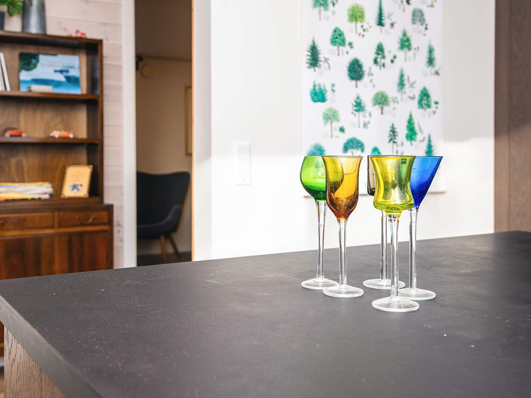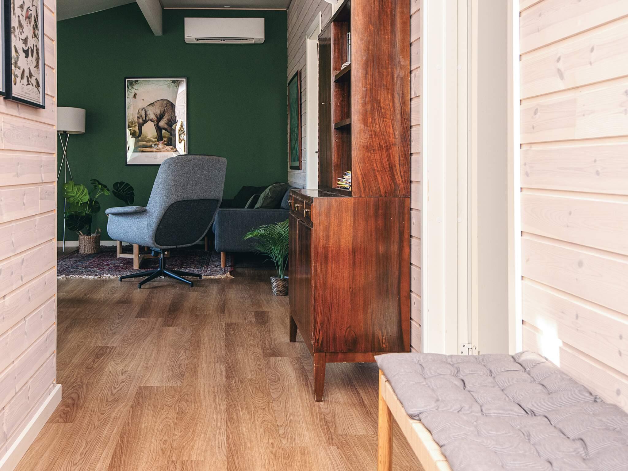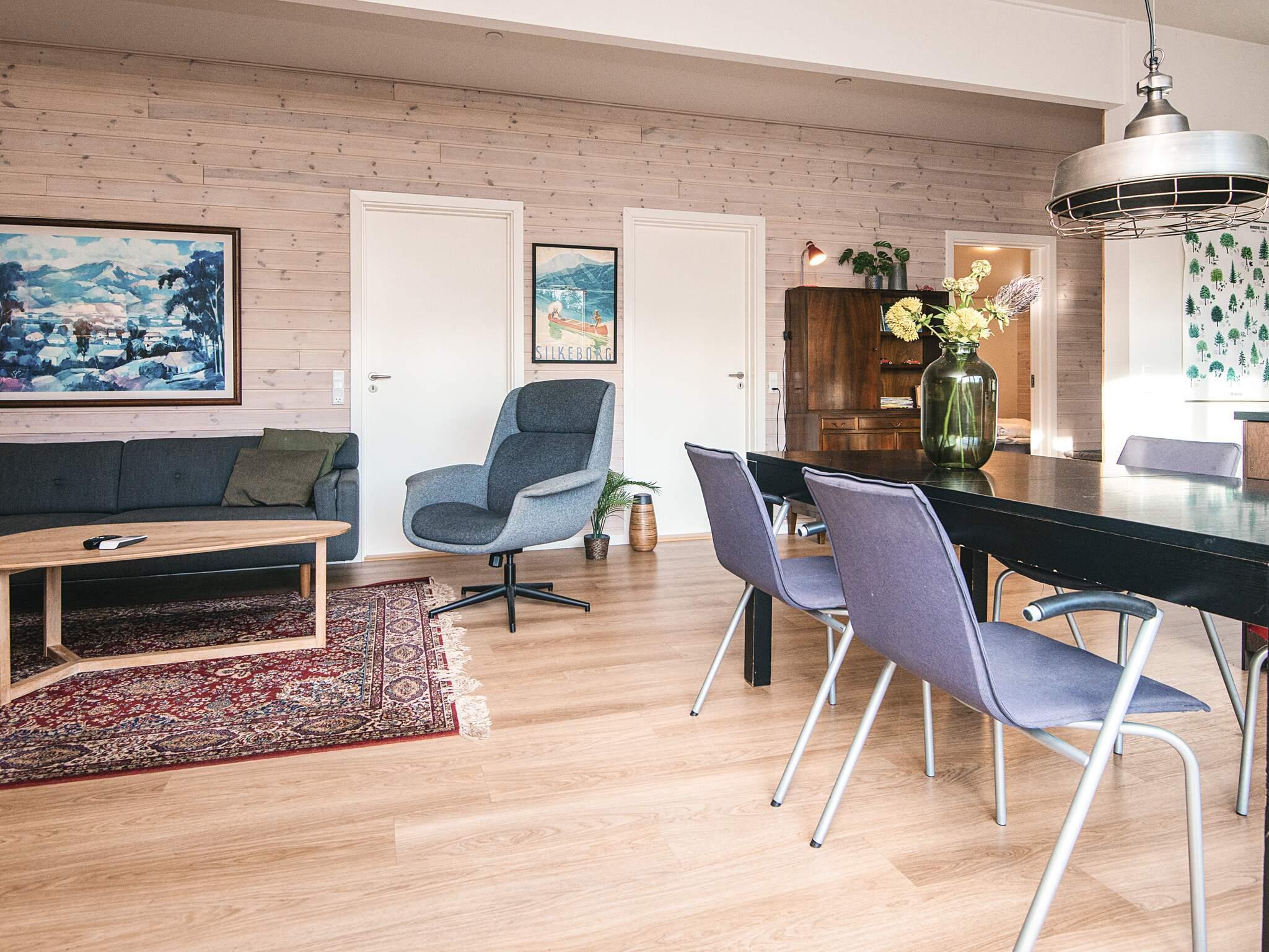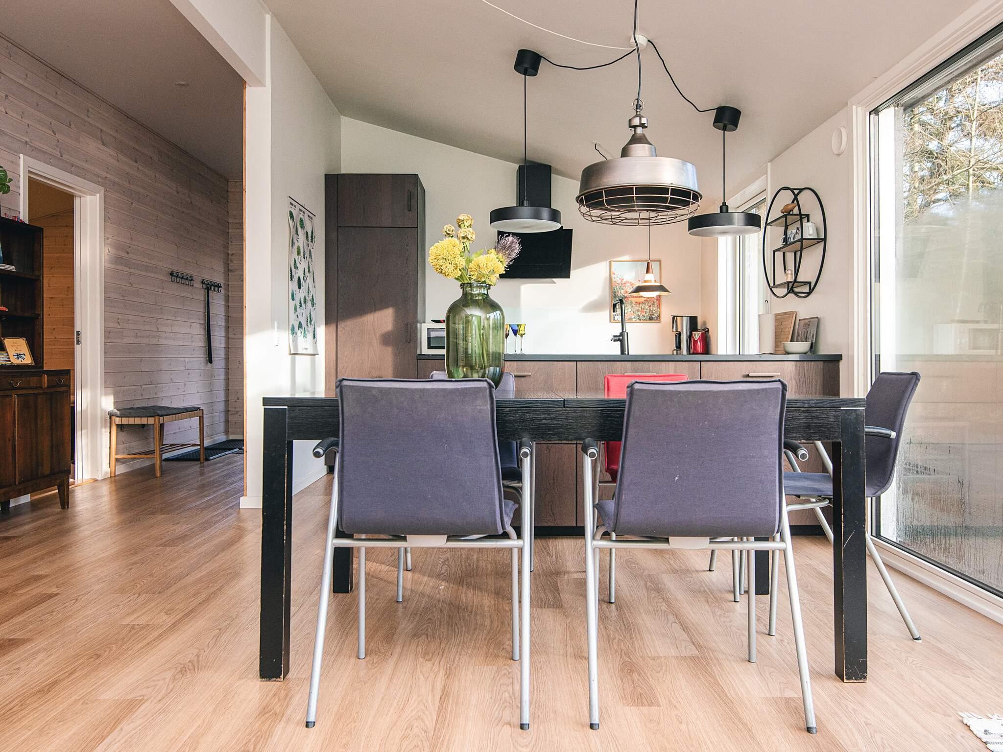 Huset har tre komfortable soveværelser og et moderne åbent køkken, der flyder problemfrit ind i spisepladsen og stuen. Store gulv-til-loft vinduer fylder rummet med naturligt lys og skaber en varm og indbydende atmosfære, hvor I kan nyde måltider sammen, spille spil eller blot slappe af med udsigten over det omkringliggende grønne område.