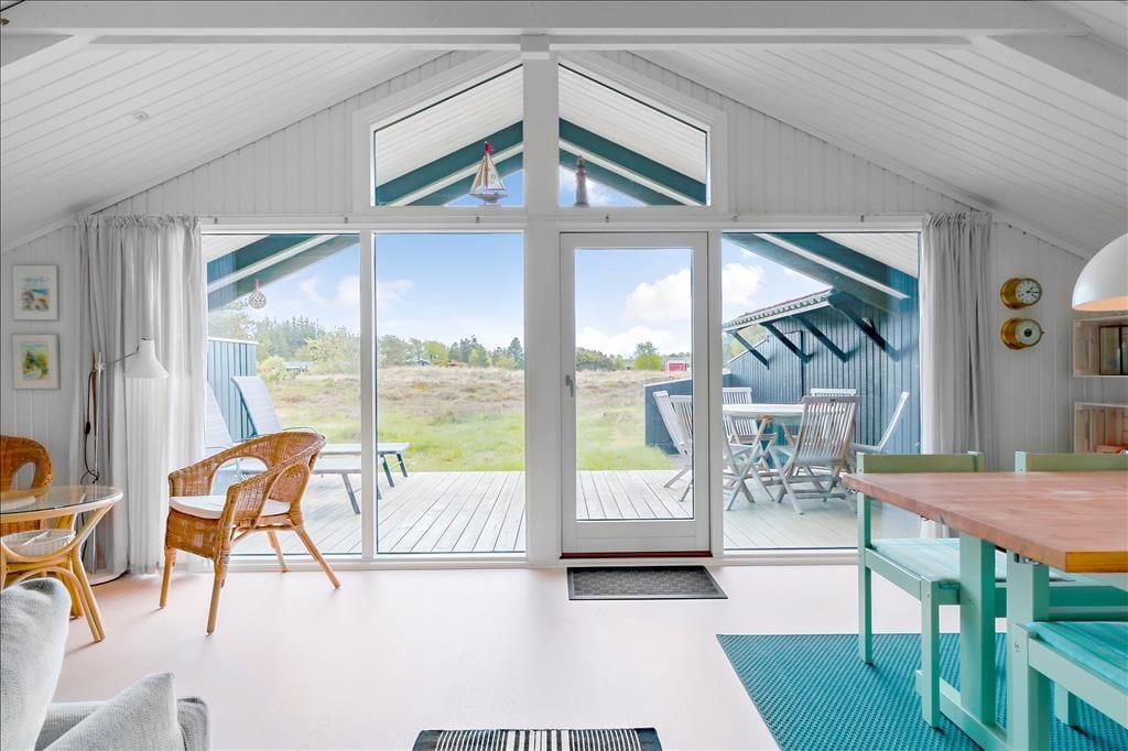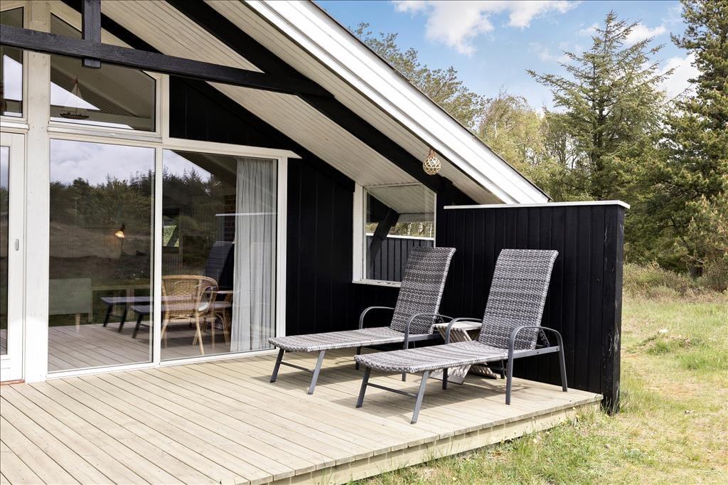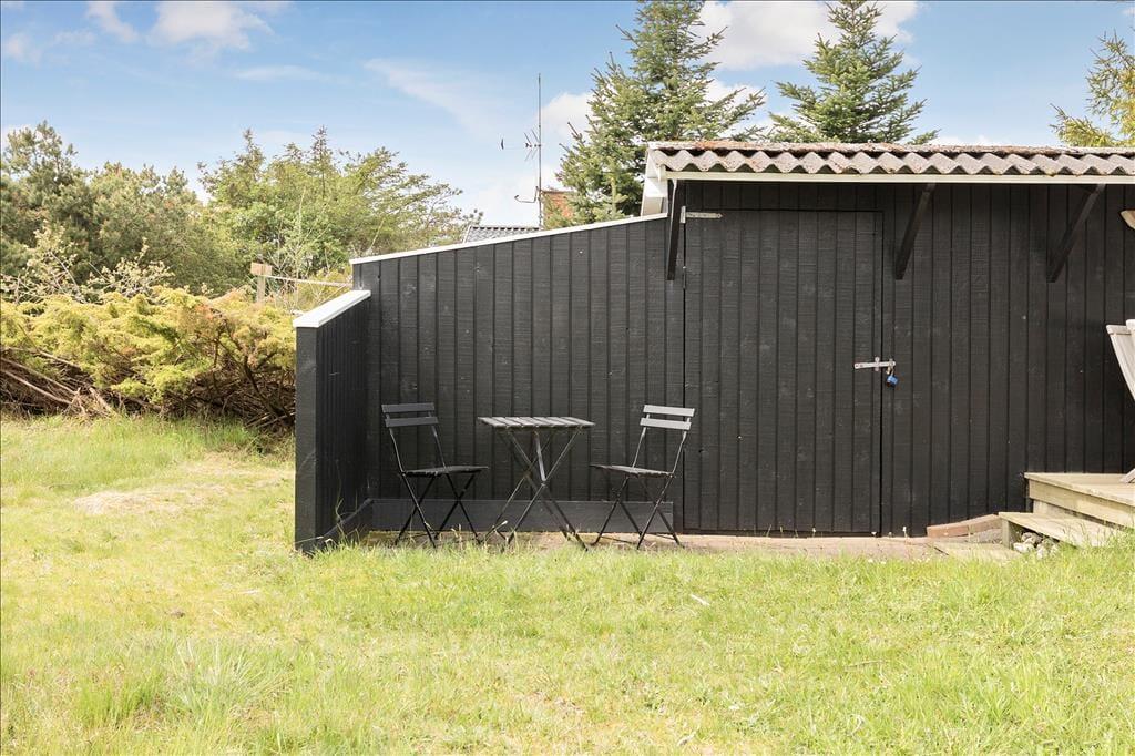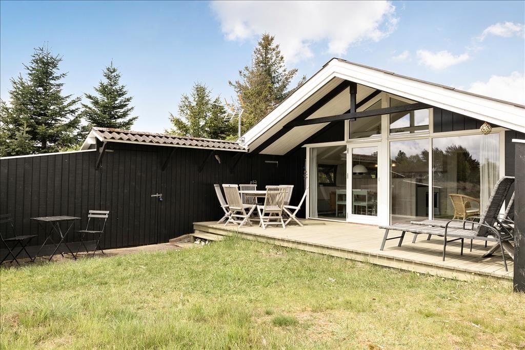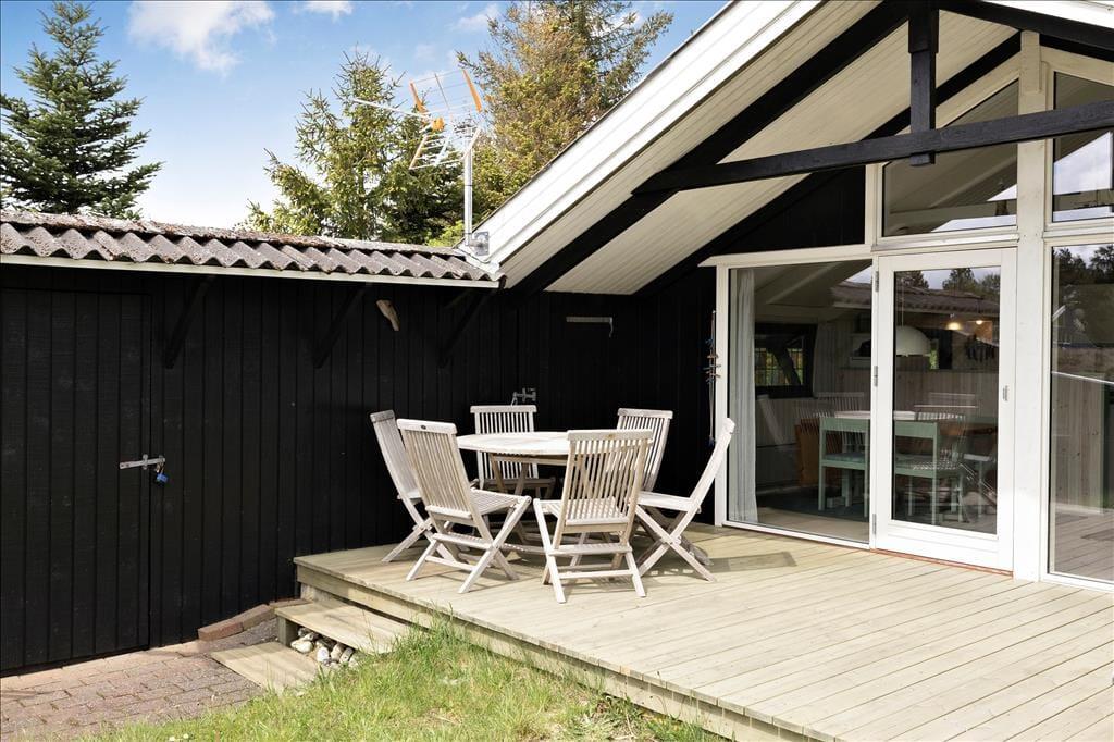 Flodbækvej er en mindre vej, og man kan derfor nyde udendørslivet uden at blive generet af meget trafik eller for mange forbipasserende. Fra stuen er der adgang til en god terrasse med en flot udsigt over de små klitter og naturgrunden, som dominerer landskabet i området. Der er havemøbler, liggestole og grill til rådighed.