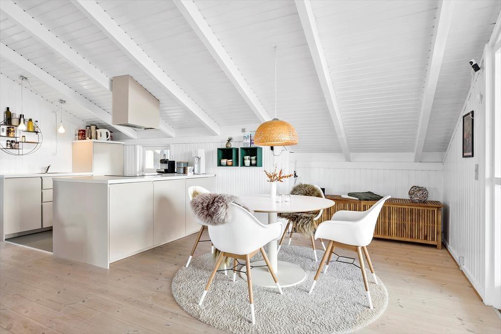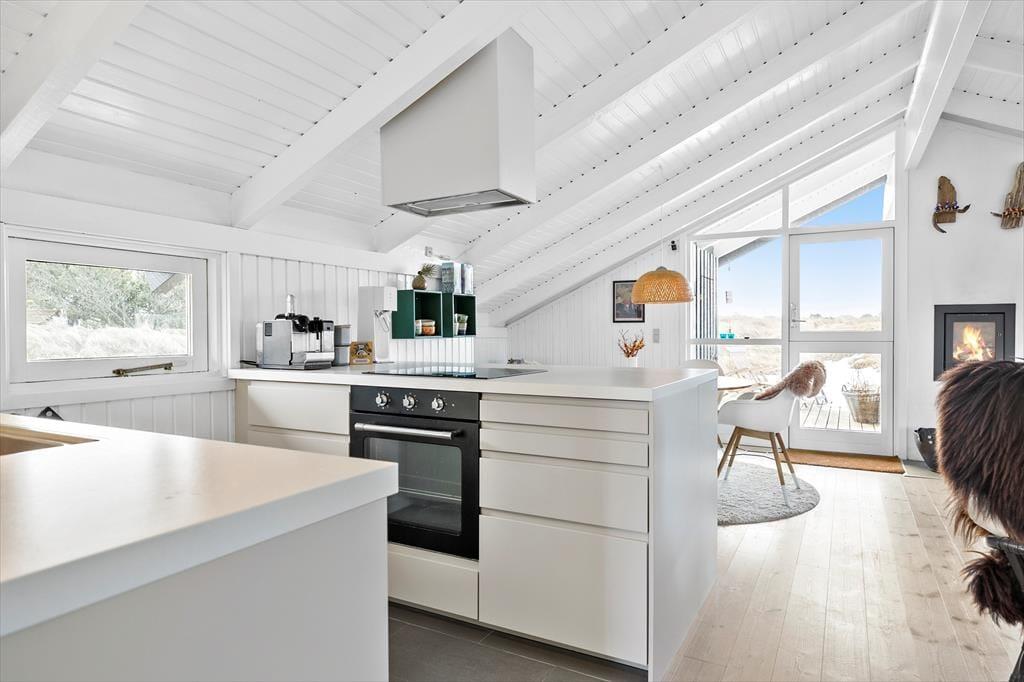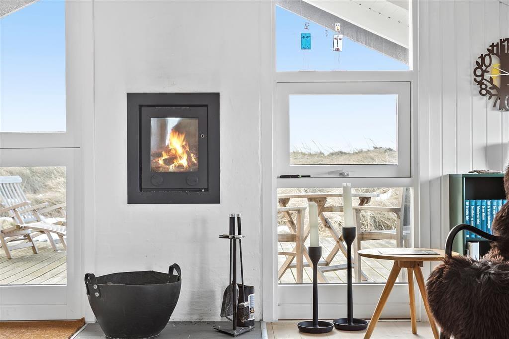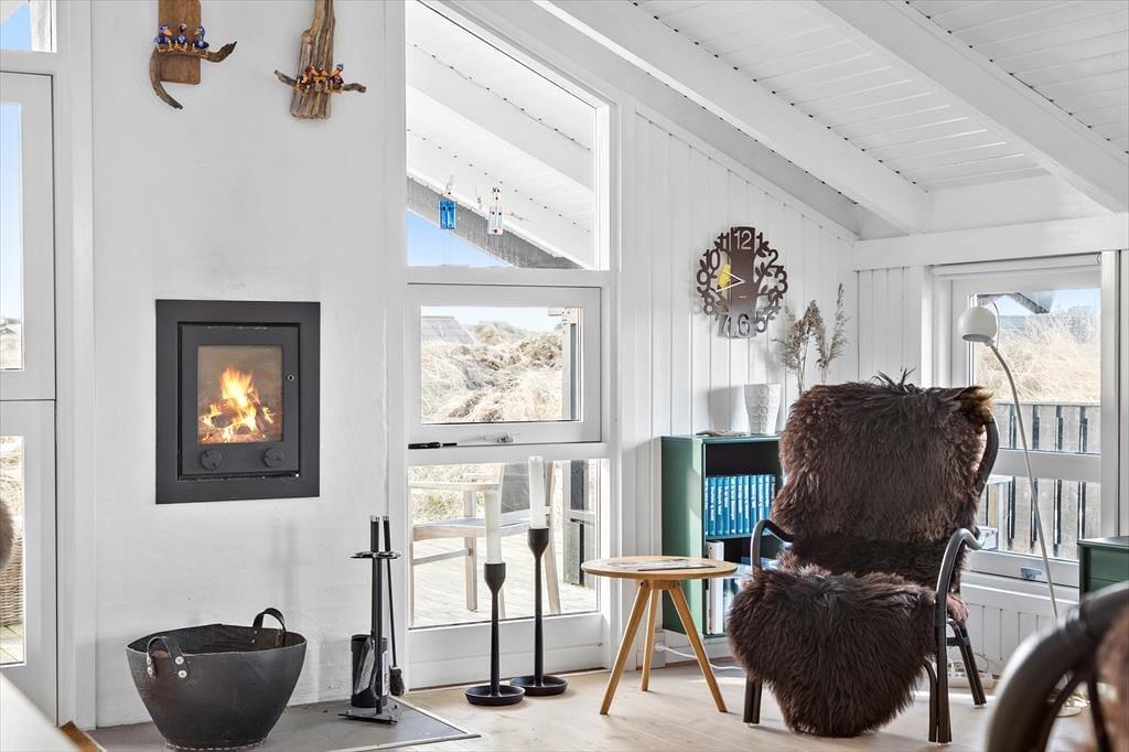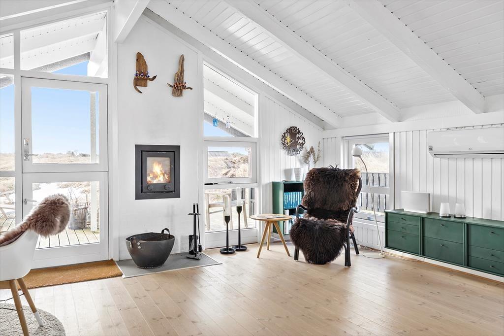 Når du træder ind i sommerhuset på Musvågevej 3, bliver du mødt af en lys og indbydende atmosfære. Den åbne stue og spiseafdeling skaber et naturligt samlingspunkt for familien, og den hyggelige indretning giver straks følelsen af hjemlig hygge. Brændeovnen spreder varme og stemning på kølige aftener, mens de store vinduer lader dagslyset strømme ind. Køkkenet er praktisk og ligger i åben forbindelse med stuen, så du nemt kan deltage i samtalerne, mens maden tilberedes. Soveværelserne inviterer til afslapning og ro efter en dag fuld af oplevelser.