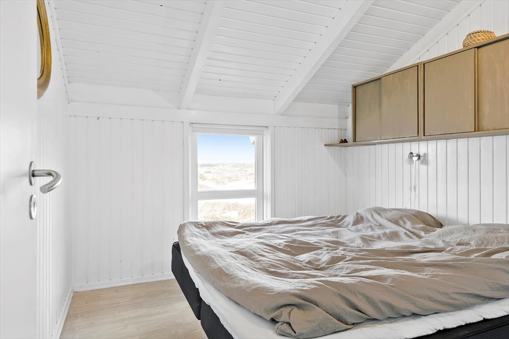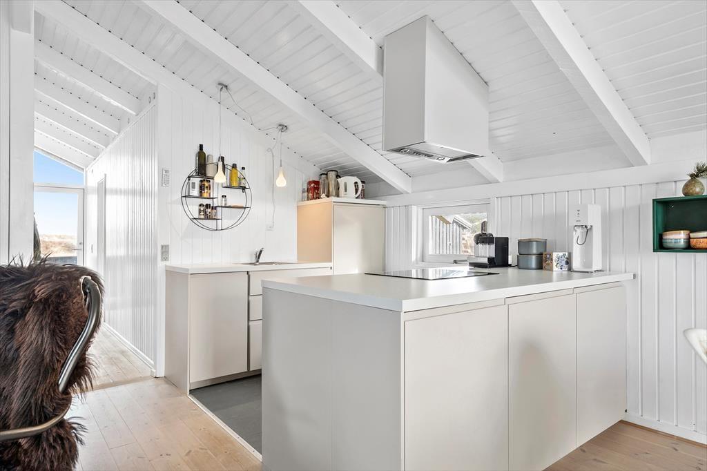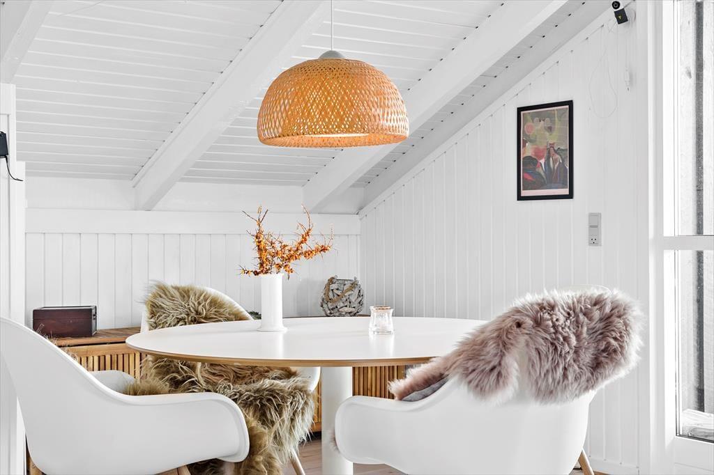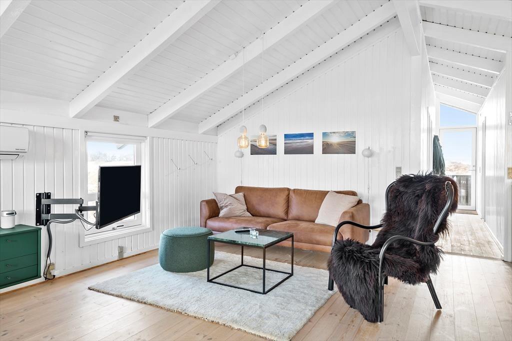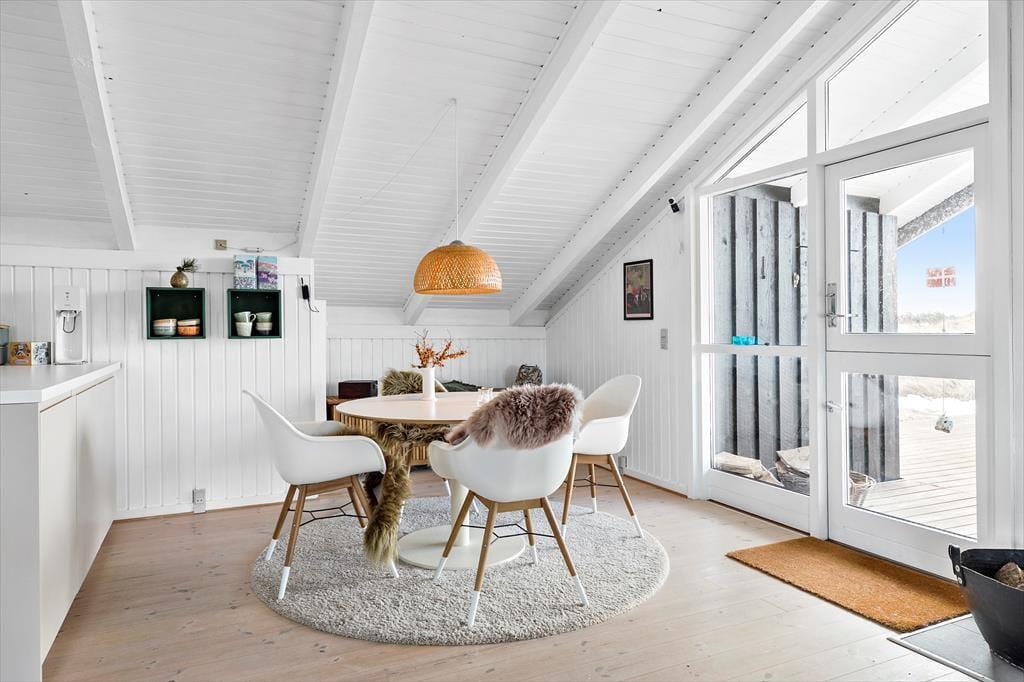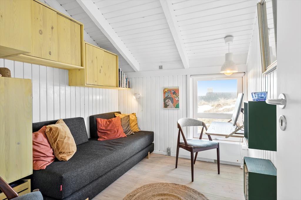 Når du træder ind i sommerhuset på Musvågevej 3, bliver du mødt af en lys og indbydende atmosfære. Den åbne stue og spiseafdeling skaber et naturligt samlingspunkt for familien, og den hyggelige indretning giver straks følelsen af hjemlig hygge. Brændeovnen spreder varme og stemning på kølige aftener, mens de store vinduer lader dagslyset strømme ind. Køkkenet er praktisk og ligger i åben forbindelse med stuen, så du nemt kan deltage i samtalerne, mens maden tilberedes. Soveværelserne inviterer til afslapning og ro efter en dag fuld af oplevelser.