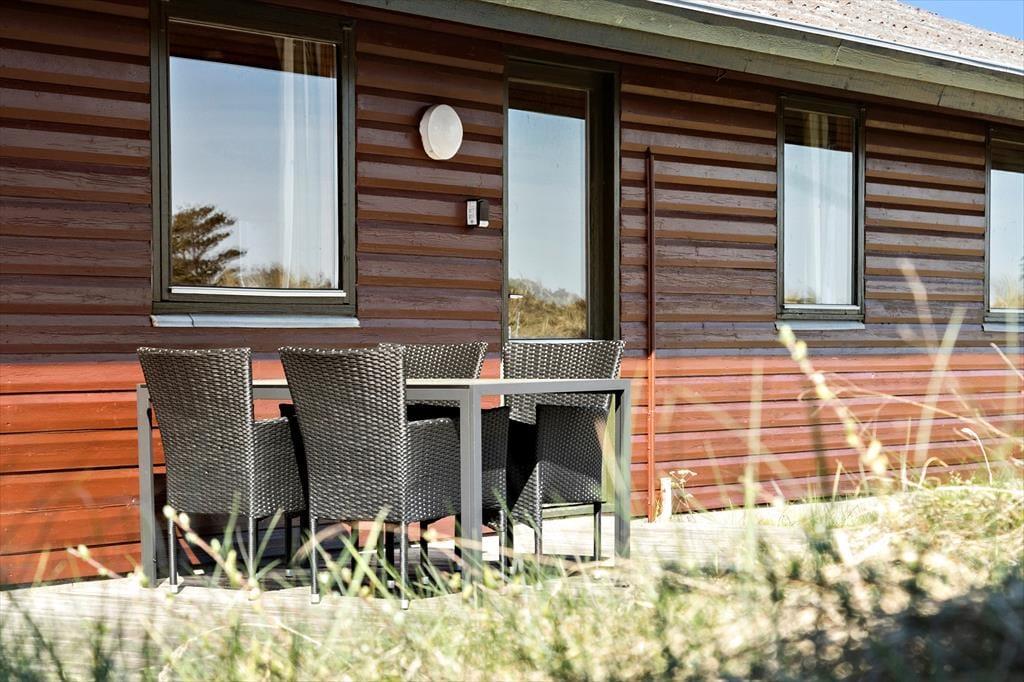 Udenfor venter et skønt terrasseområde, hvor du kan tilbringe mange timer under den åbne himmel. Med udsigt over det smukke landskab og havet i horisonten, er dette det perfekte sted til at nyde morgenkaffen eller en aftenmåltid i det fri. Terrassen er et ideelt sted at slappe af i liggestolene eller samle familien til en grillmiddag, mens du nyder de lange, lyse sommeraftener. Området er præget af ro og natur, hvilket gør det til et oplagt valg for dem, der ønsker en fredfyldt ferie i tæt kontakt med naturen.