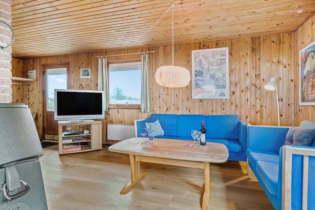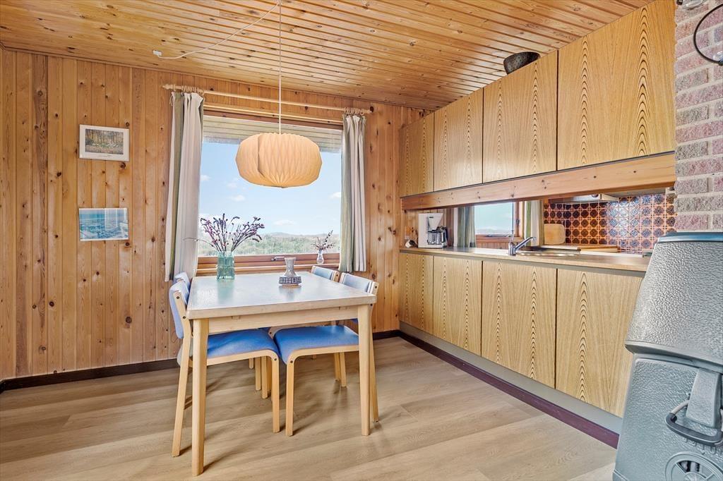 Når du træder ind i sommerhuset, bliver du mødt af en hyggelig og lys atmosfære, hvor du straks føler dig hjemme. Stuen er både indbydende og rummelig, og den store vinduesparti giver et vidunderligt kig over det omkringliggende landskab og havet i det fjerne. Her er der god plads til at samle familien foran brændeovnen, hvor flammerne spreder varme og hygge, eller til at slænge sig i den dejlige sofa, mens du nyder udsigten. Køkkenet er åbent og praktisk indrettet, hvilket gør det nemt at tilberede lækre måltider til dig og dine kære. Sommerhusets indretning er enkel, men funktionel, og hver eneste detalje er med til at skabe en afslappet og behagelig ferieatmosfære.