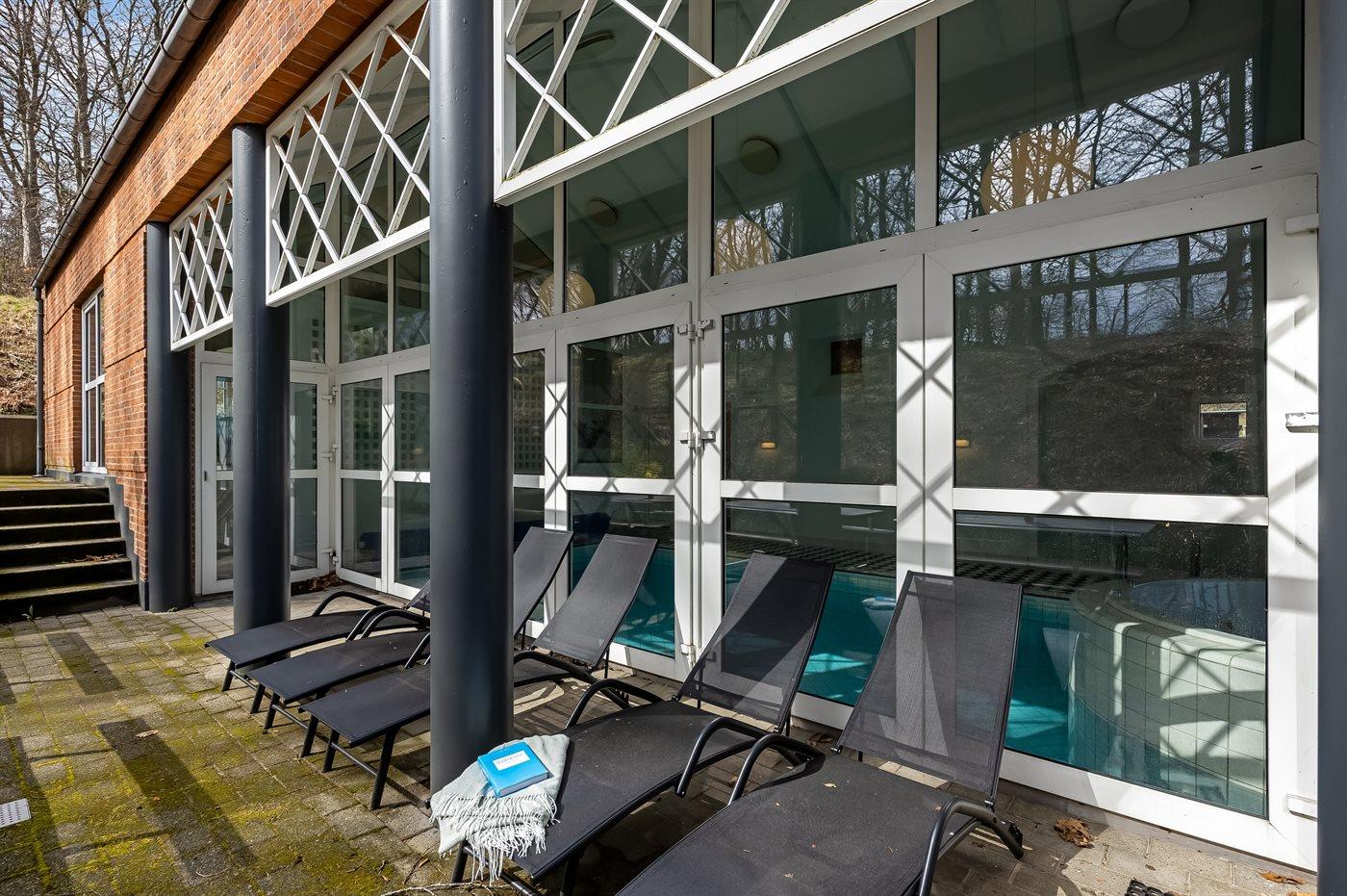I den indendørs swimmingpool er der mulighed for leg og hyggeligt samvær. Swimmingpoolen måler op til 3,5 m i bredden, 6,5 m i længden og den er op til 1,4 m dyb. Vandet er mellem 24 og 28° C varmt. Swimmingpoolen har modstrømsanlæg. Der er gulvvarme i swimmingpoolområdet.