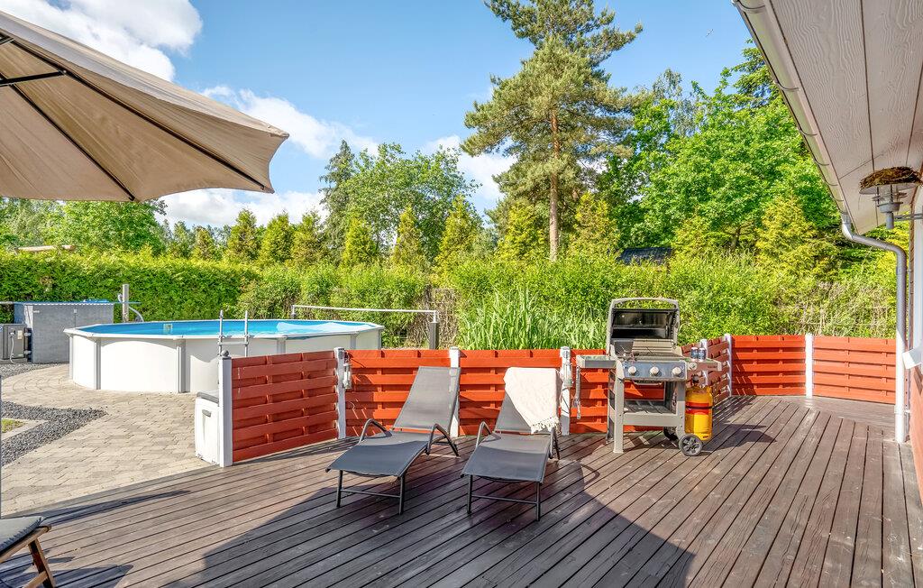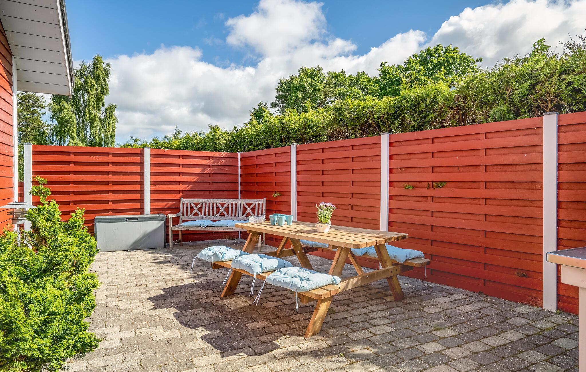 Til huset hører en dejlig, indhegnet have, hvor børnene kan lege og jeres hunde kan få frisk luft i løbet af dagen. Sæt jer med morgenmaden på træterrassen og hop en tur i poolen på de varme dage.