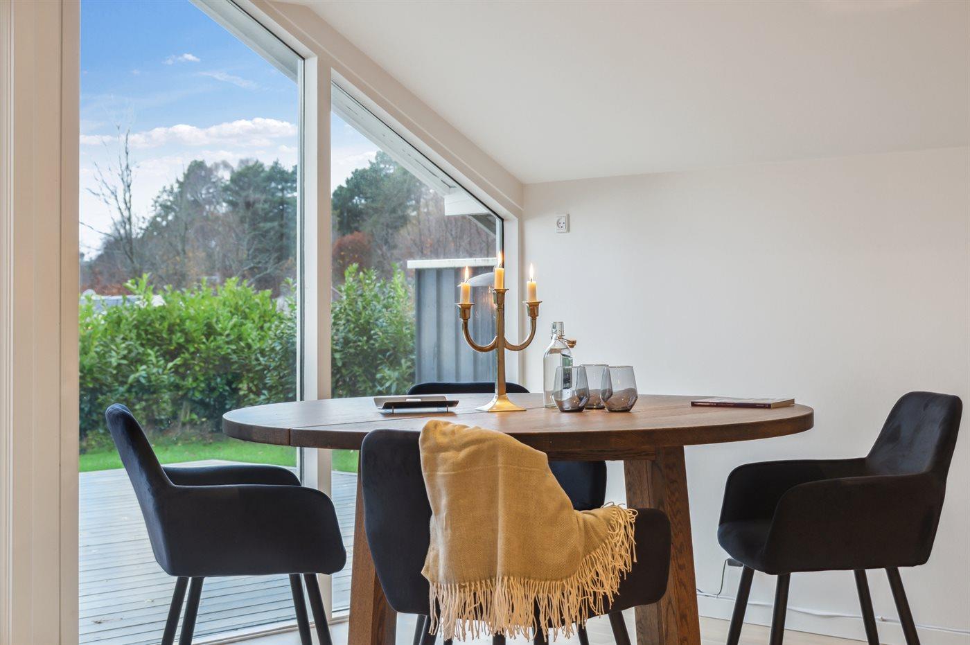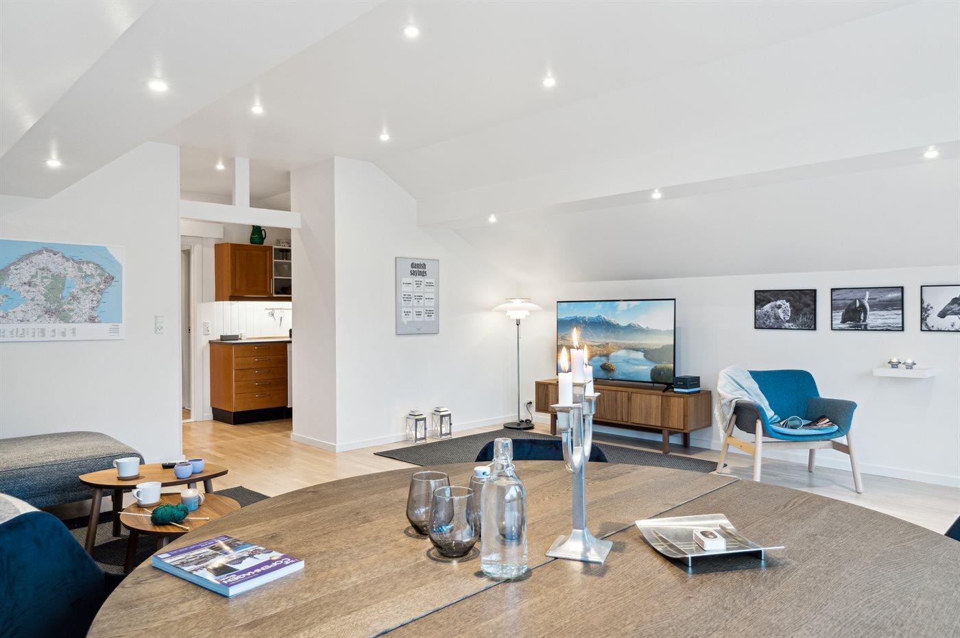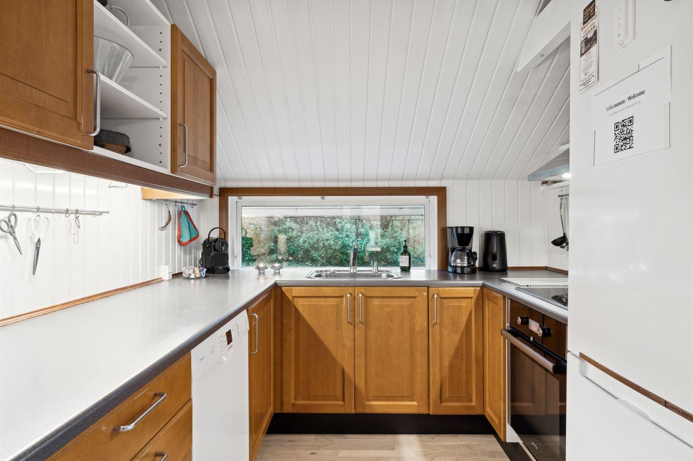 Køkkenet er udstyret med 1 køleskab. Der er 4 keramiske kogeplader, varmluftovn samt opvaskemaskine.