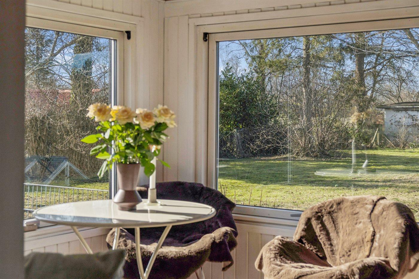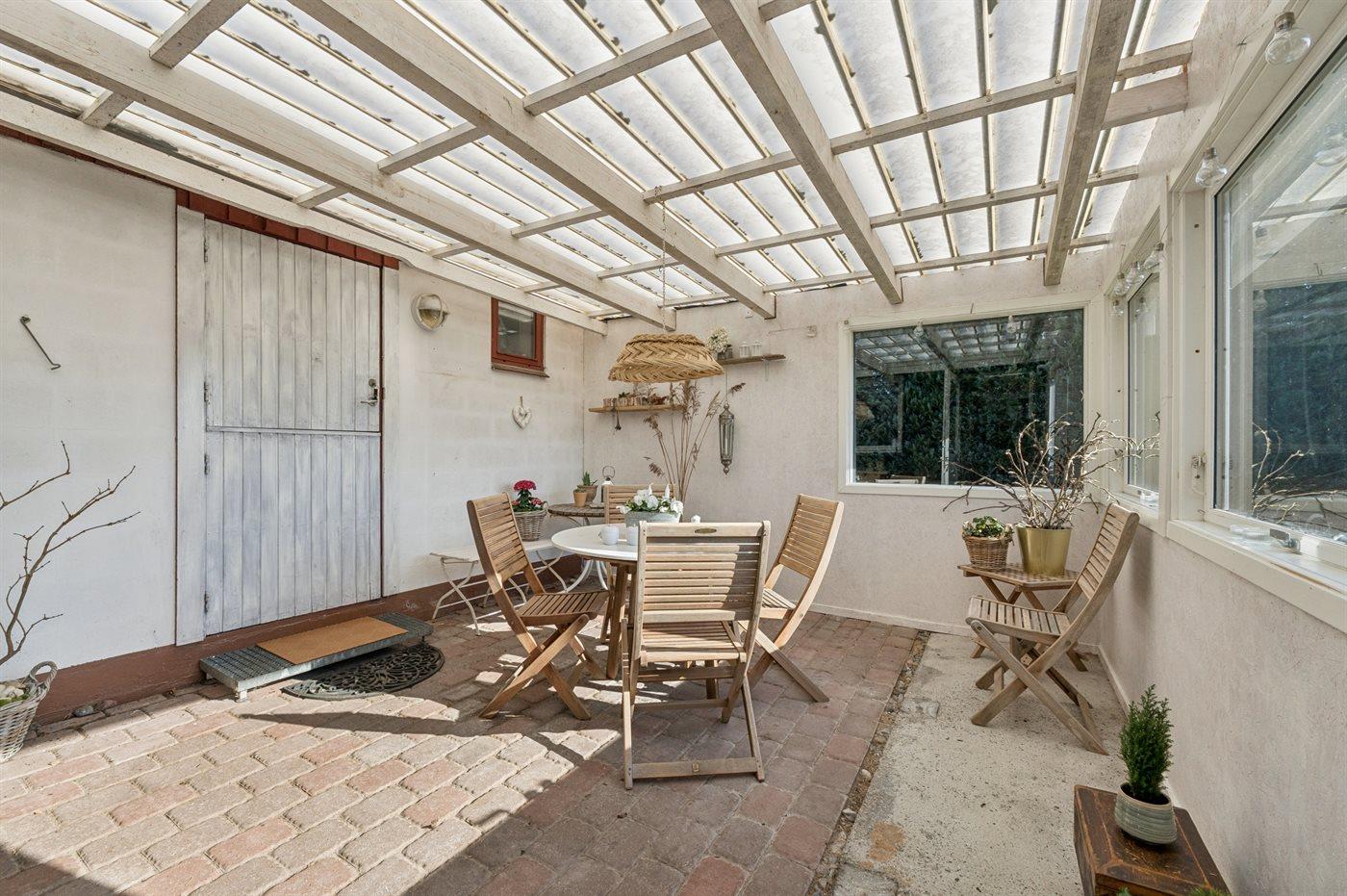 Hyggeligt sommerhus nær børnevenlig strand med overdækket udestue og elbiloplader i rolige omgivelser ved Udsholt Strand.
