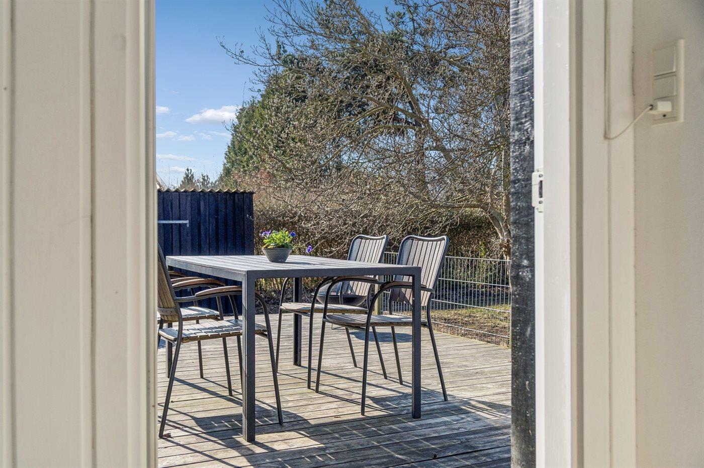 Ferieboligen er beliggende på en 1229 m² stor havegrund. Grunden er indhegnet. Der er 1000 m til havet. Nærmeste forretning er beliggende i en afstand af 1700 m. Til ferieboligen hører åbent terrasseareal. Ligeledes er der adgang til udestue. Bålsted. Grill til rådighed. Der er installeret stik til opladning af elbil. Type 2 stik. Med 11 kW ladeeffekt. Parkering ved ferieboligen.