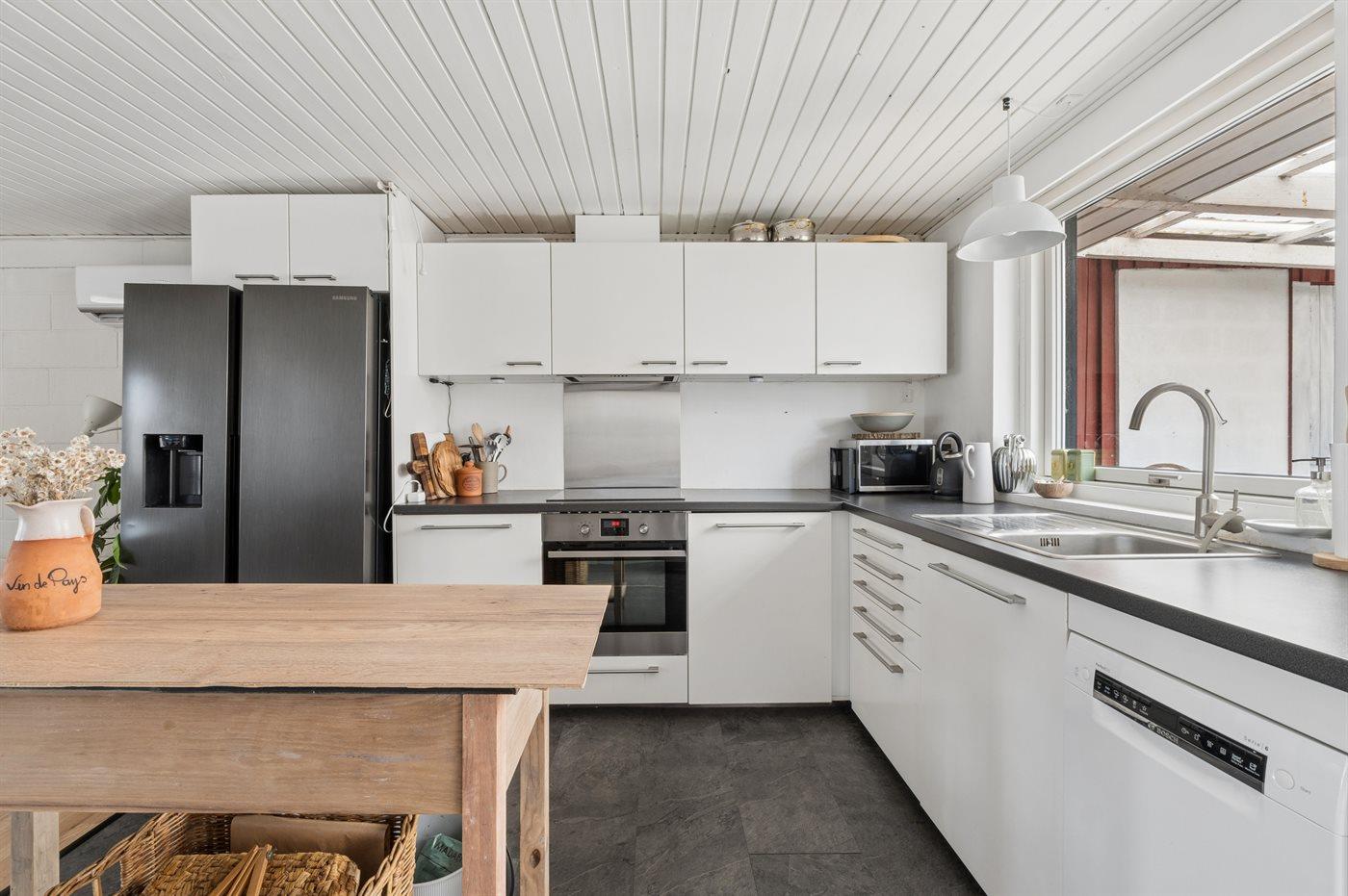 Køkkenet er udstyret med 1 køleskab. Der er 4 keramiske kogeplader, varmluftovn, mikrobølgeovn, Airfryer samt opvaskemaskine.