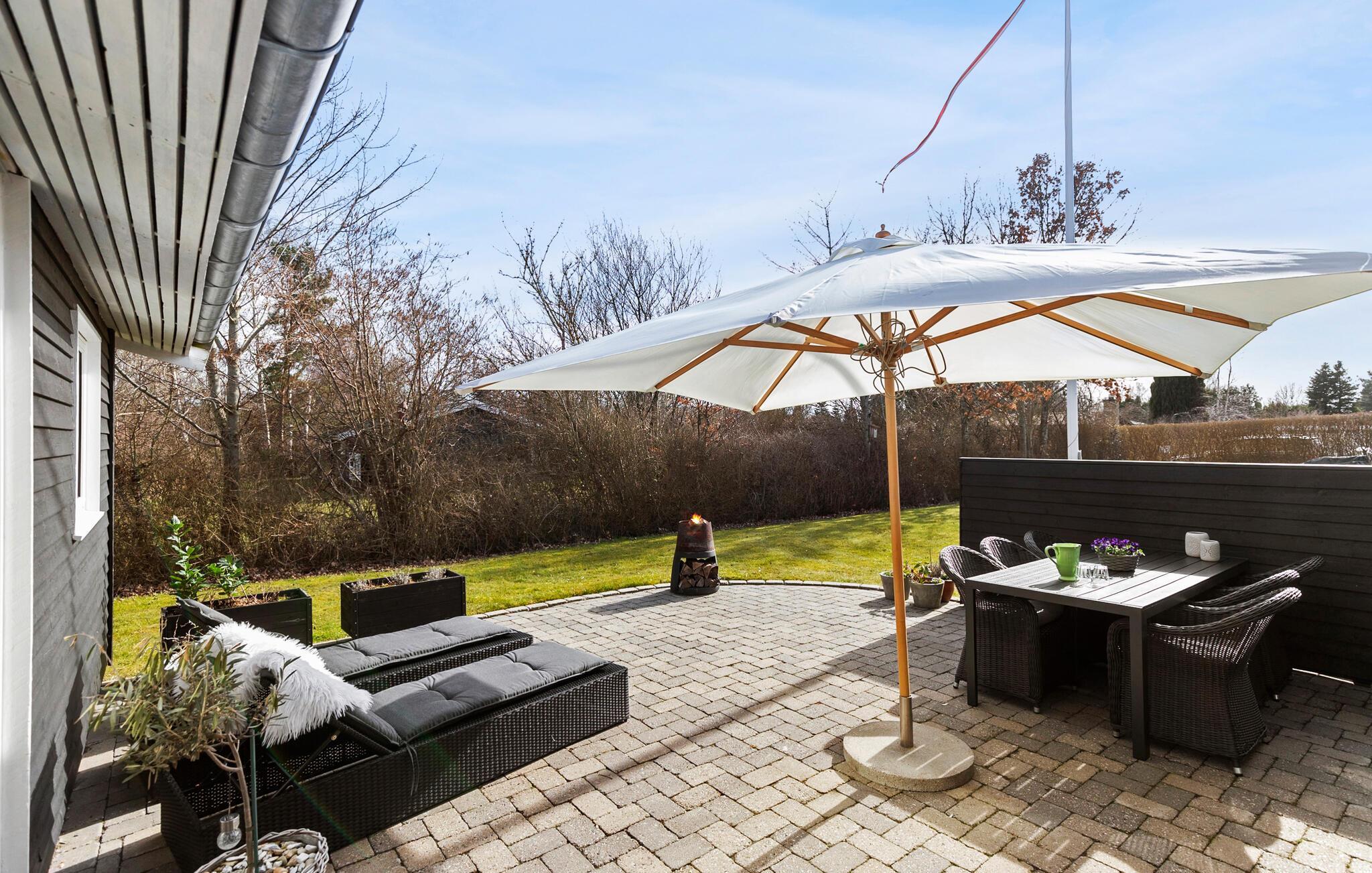 Begynd sommerdagene på den møblerede terrasse med en kop kaffe. Her sidder I godt placeret i en solkrog med udsigt over haven. Læn jer tilbage i liggestolene, mens børnene spiller bold på græsplænen. I kan slutte dagen ekstra stemningsfuldt af med snobrød over bål.