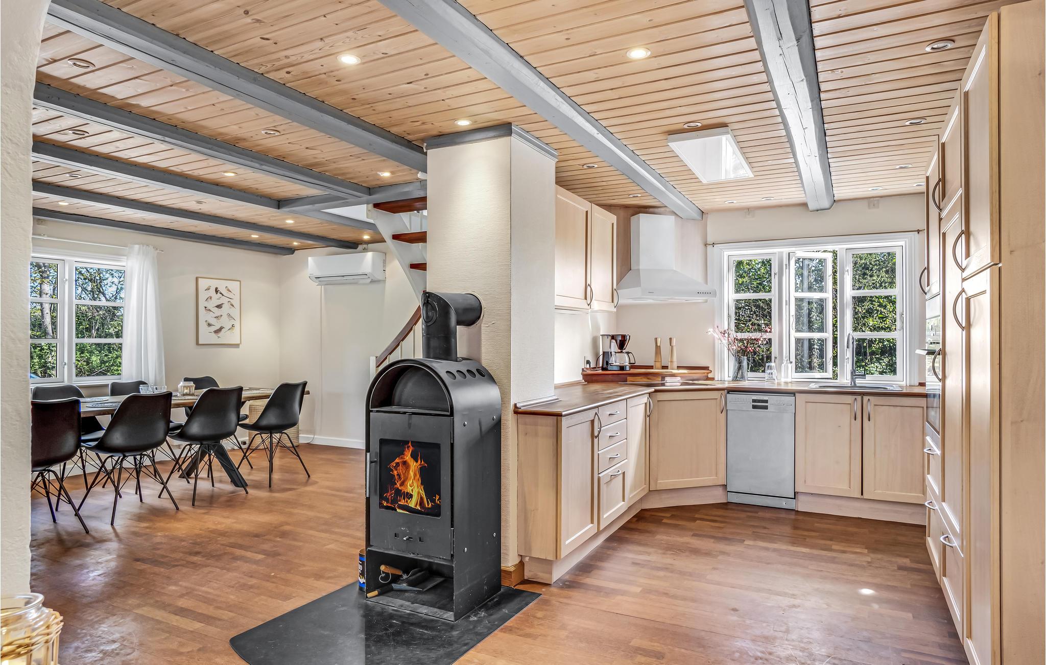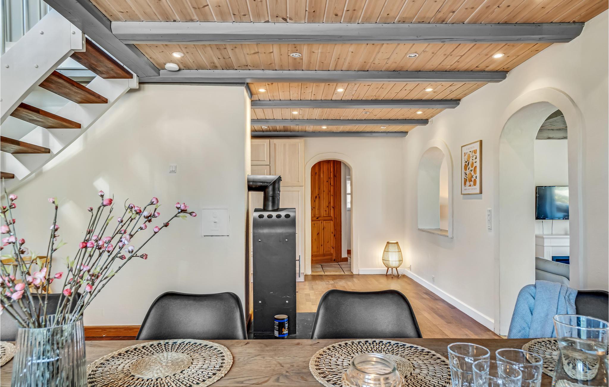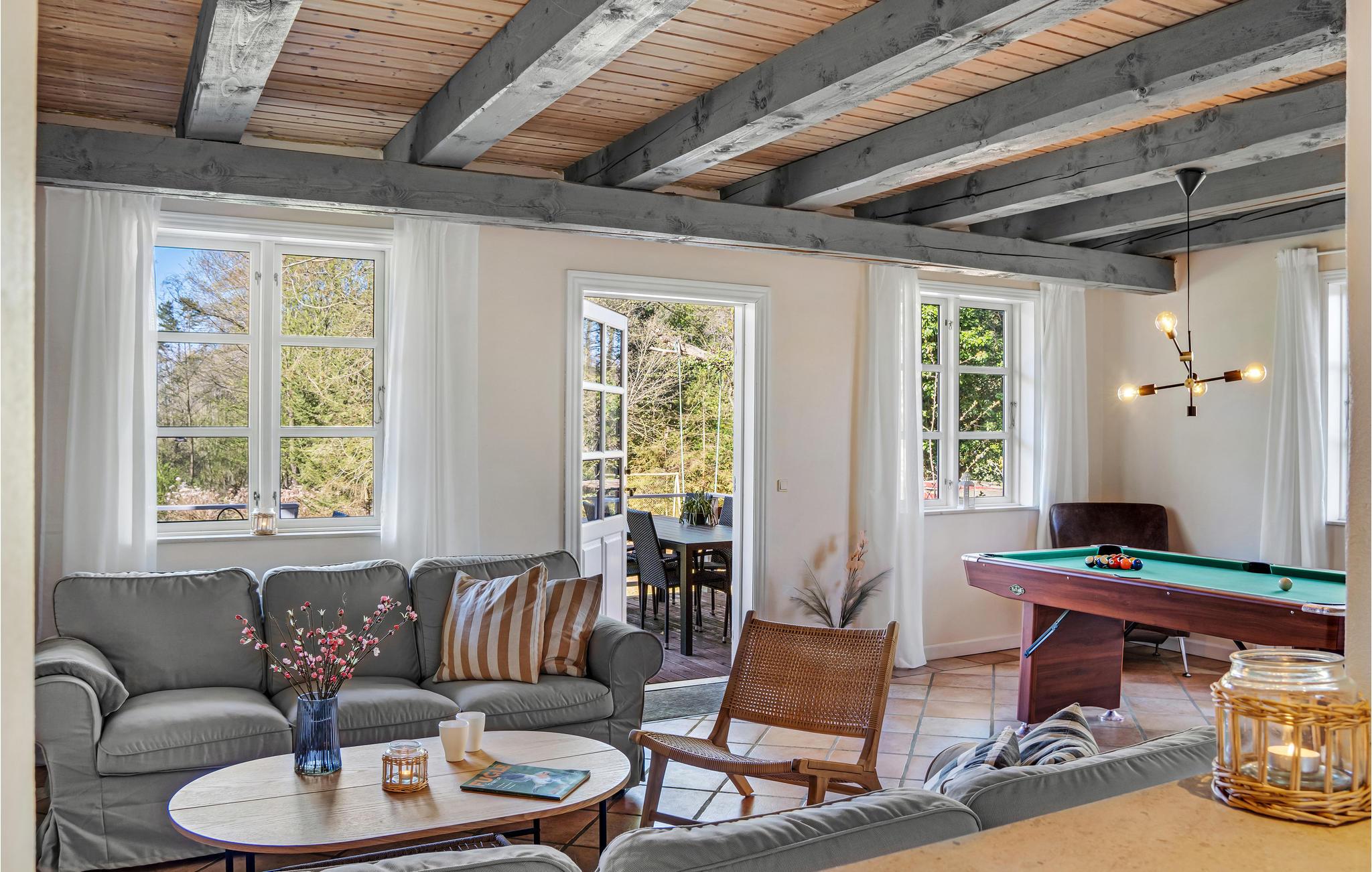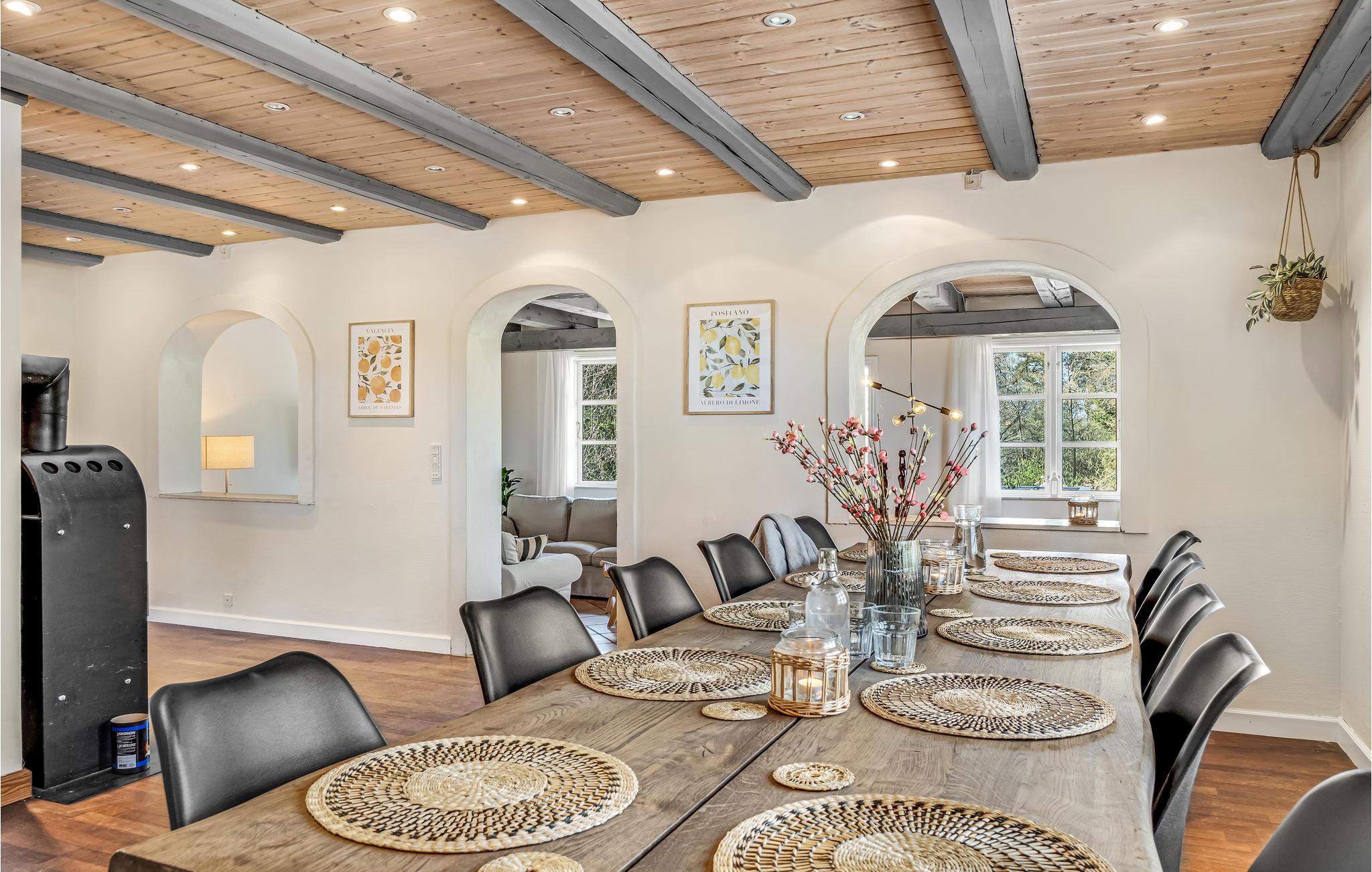 Dette indbydende hus har en harmonisk blanding af stilfuld elegance og afslappet komfort. Synlige træbjælker, en brændeovn og komfortable møbler skaber en atmosfære, hvor I øjeblikkeligt kan slappe af og genoplade. Slap af med en kop kaffe i sofaen, stream den nyeste serie, snup et spil billard eller lav lækre måltider sammen i det veludstyrede køkken.