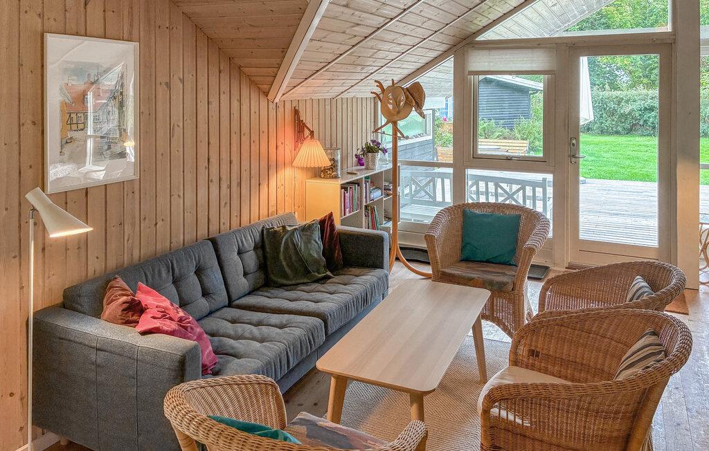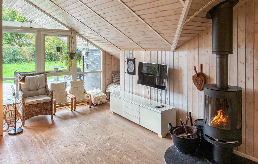 I dette feriehus, kun få minutters gang fra vandet, venter en varieret ferie, der kombinerer hav, natur og dansk hygge. Husets indbydende interiør byder på masser af træ og skandinavisk charme. Find jer til rette i stuen foran brændeovnen og nyd den hyggelige varme, mens I læser en bog eller ser en film sammen. Sofahjørnet og lænestolene lægger op til hyggestunder, og de store vinduer skaber en behagelig forbindelse mellem interiøret og haven. Det åbne køkken er moderne udstyret og tilbyder alt, hvad I behøver for at tilberede måltider sammen. Spisebordet giver plads til, at familie og venner kan nyde lange, hyggelige aftener.