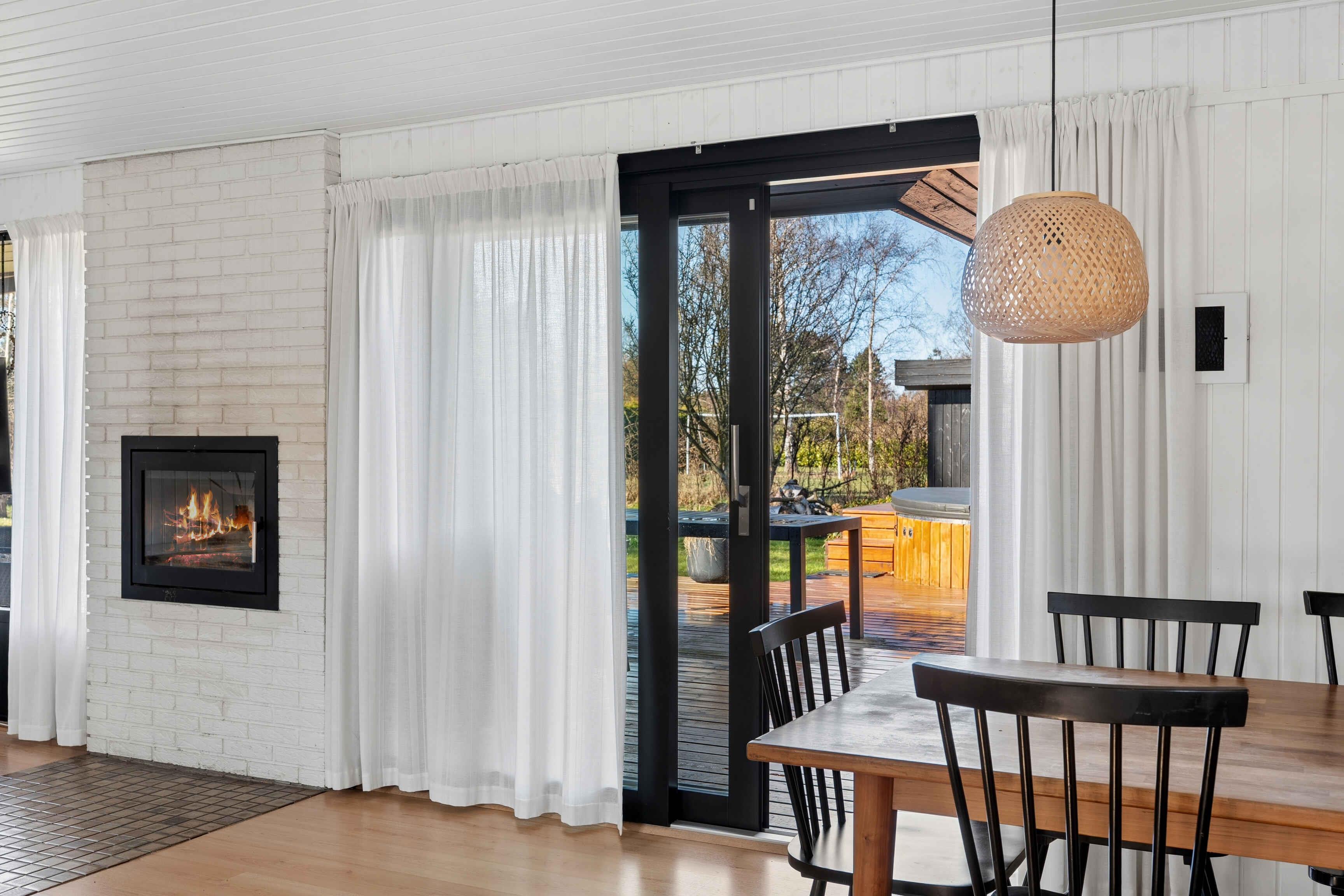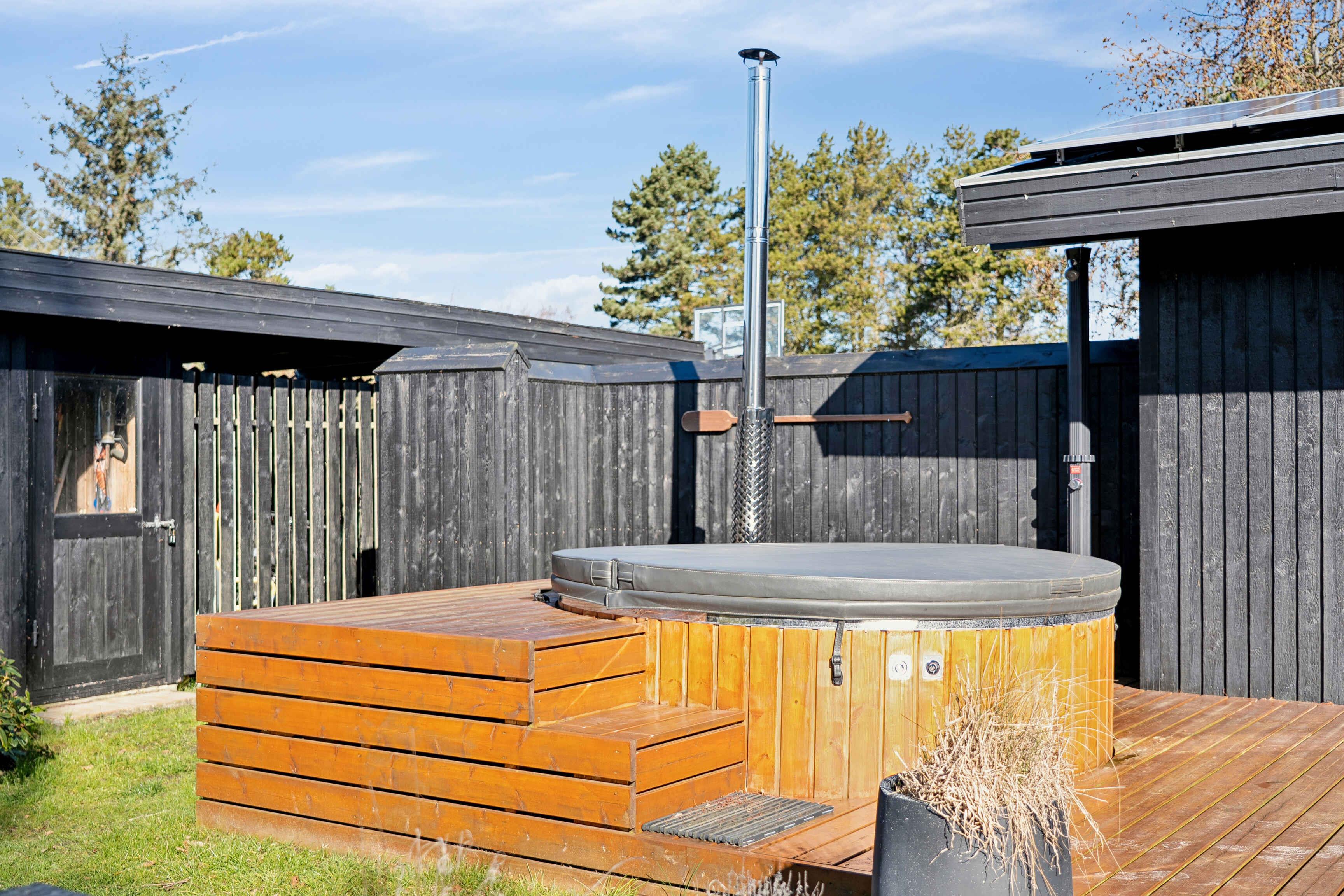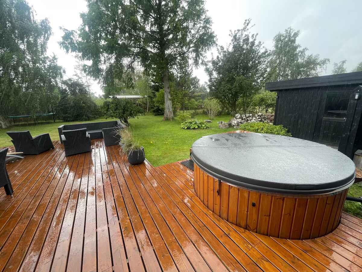 Sommerhus i Lupinerkvarteret med vildmarksspa, pejs og to terrasser tæt på vand og legeplads.
