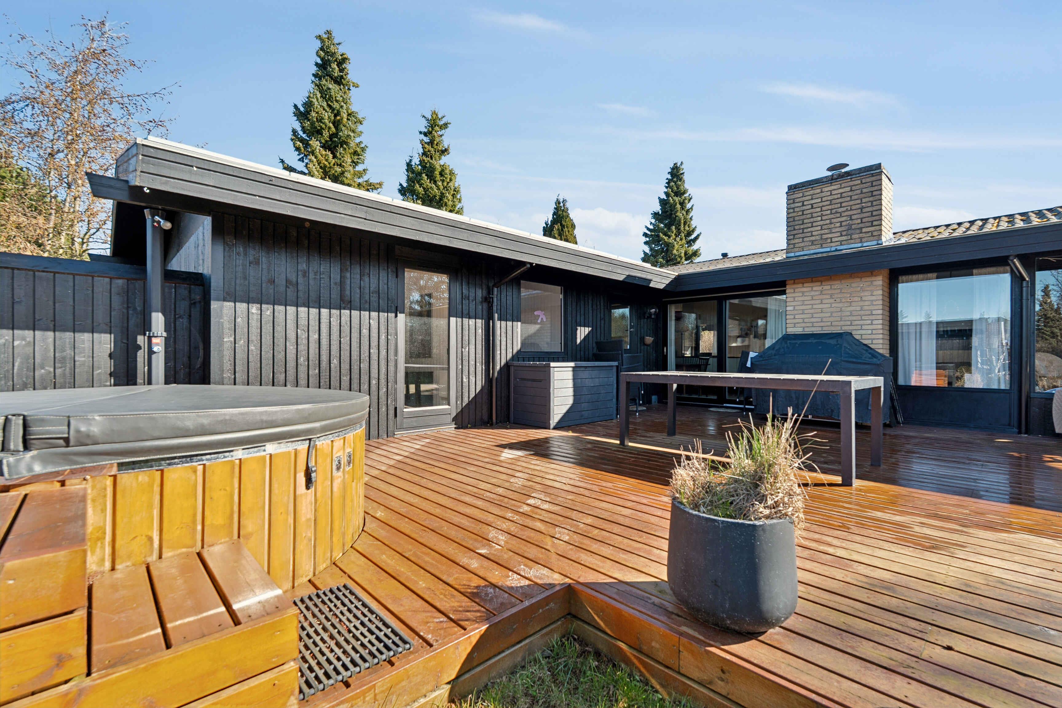 Sommerhus i Lupinerkvarteret med stor pejs, rummelig stue og flere terrasser i øst og vest samt overdækket terrasse. Udendørs vildmarksspa til 8 personer. Tæt på vand, købmand, legeplads og boldbaner. Mange aktiviteter som spil, dart og PS4.