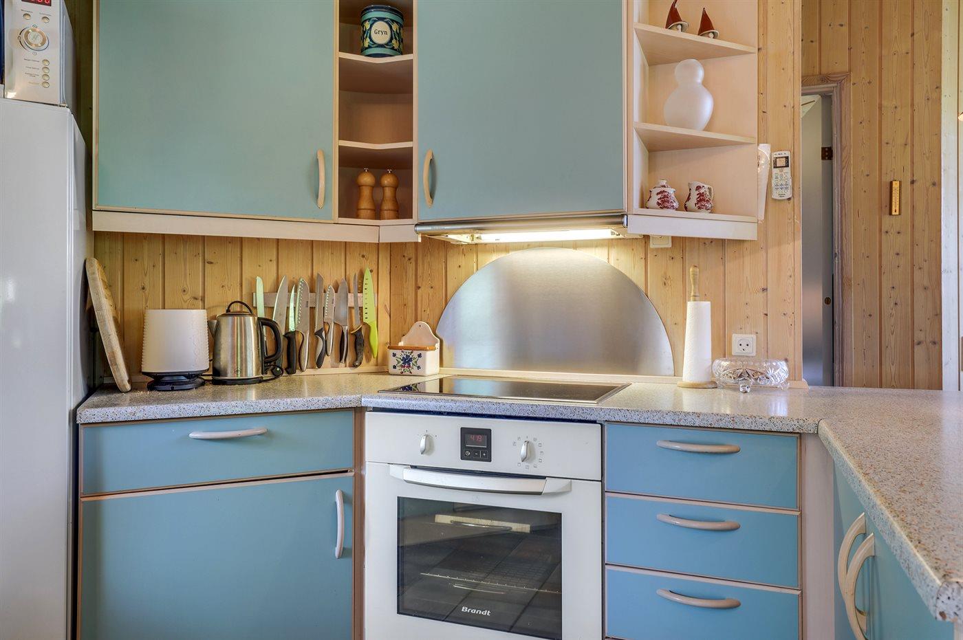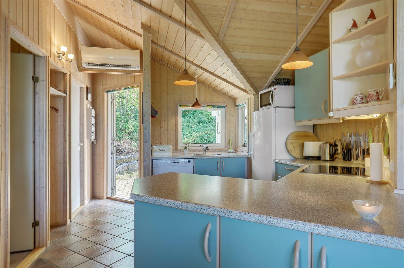Køkkenet er udstyret med 1 køleskab. Der er 4 keramiske kogeplader, varmluftovn, mikrobølgeovn samt opvaskemaskine.