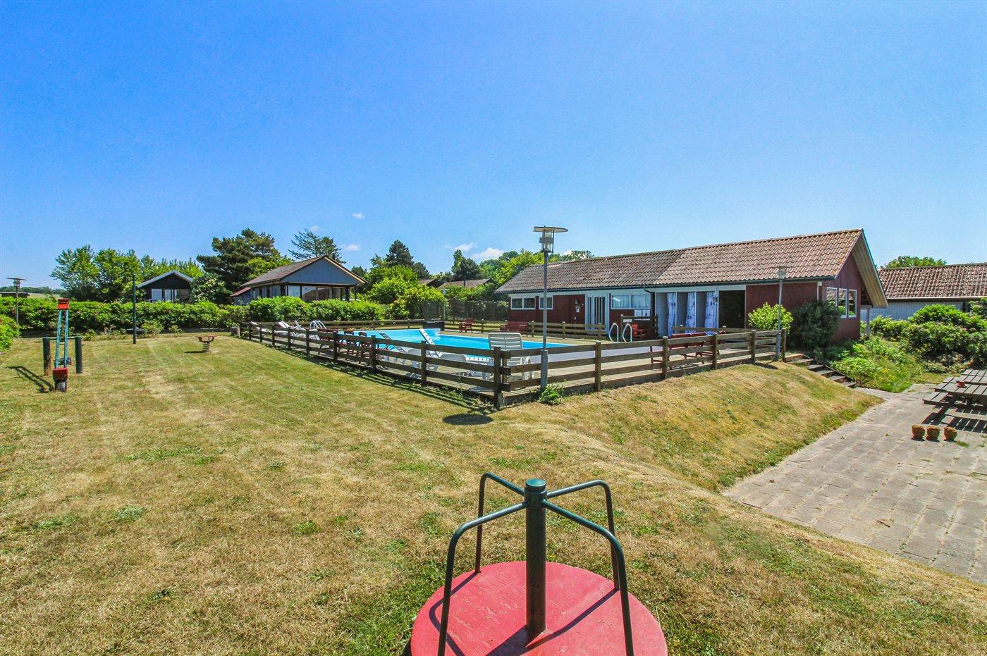 Huset ligger i en feriehusbebyggelse, hvor der er adgang til fælles faciliteter i området: Udendørs pool (der kan benyttes fra 15. juni til 15. september), sauna (møntindkast) og vaskemaskine (møntindkast) samt legeplads med gynge, vippe, karrusel, udendørs pejs og udendørsbruser.