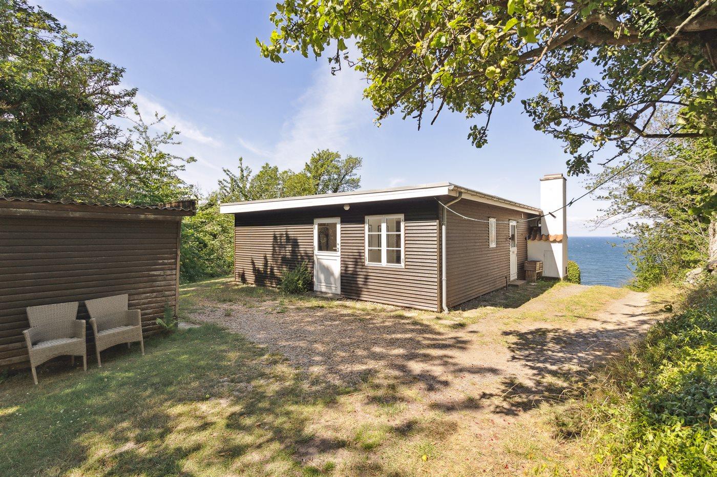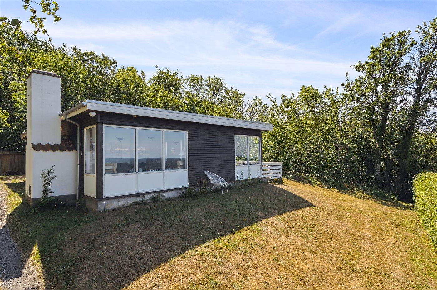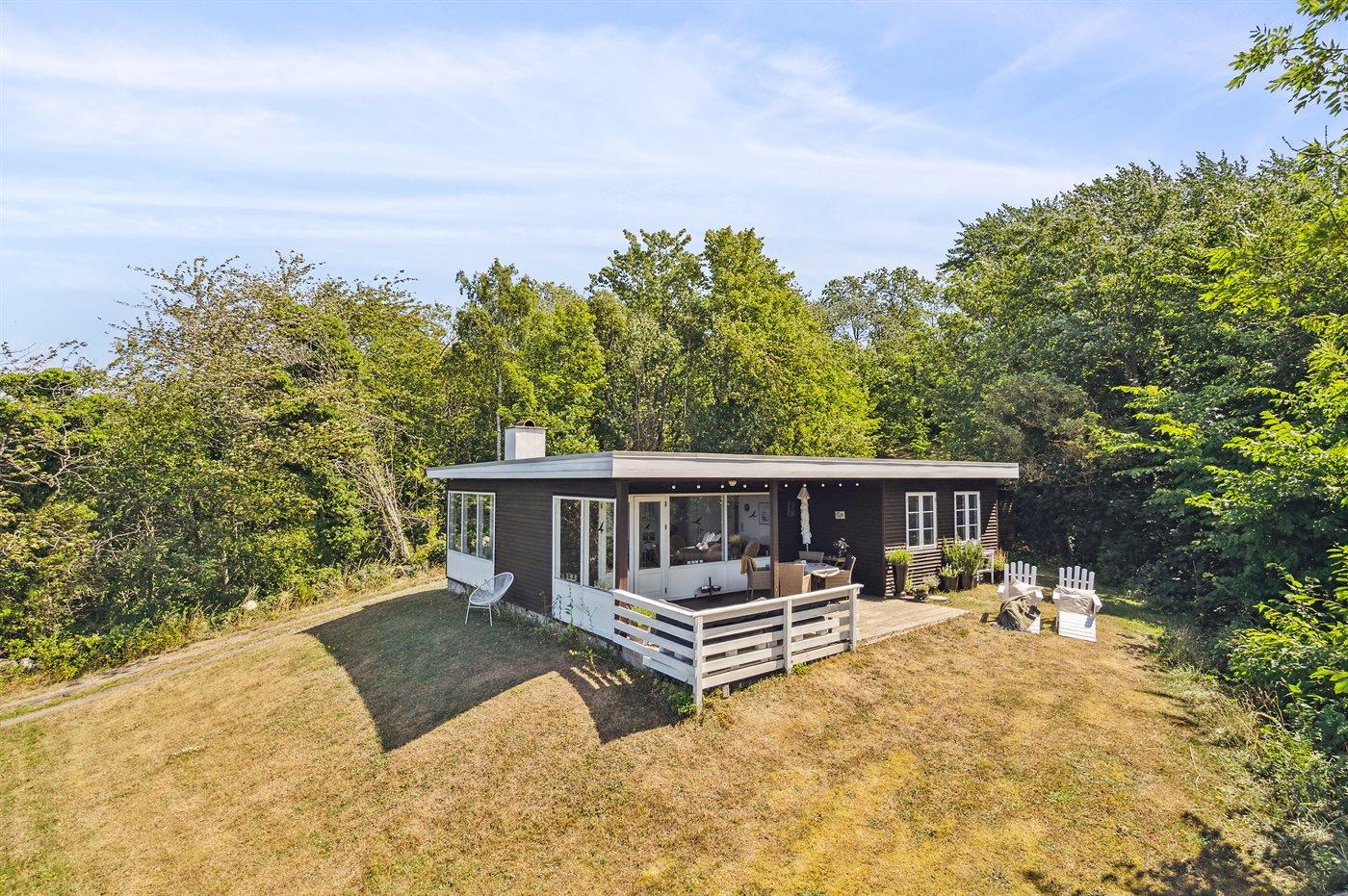 Højt beliggende med den fineste udsigt ned over det lille fiskerleje Vang og udover Østersøen - i klart vejr ses den svenske kyst. Den overdækkede terrasse indbyder til, at man følger naturens gang og solen vandring henover himmelen fra tidlig morgen til sen aften. Sommerhuset ligger for enden af en relativ stejl tilkørselsvej.