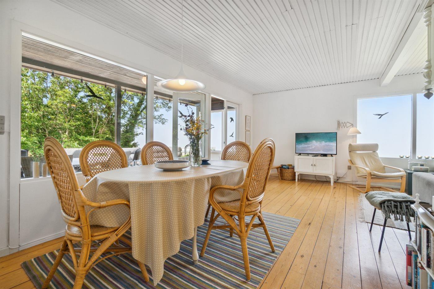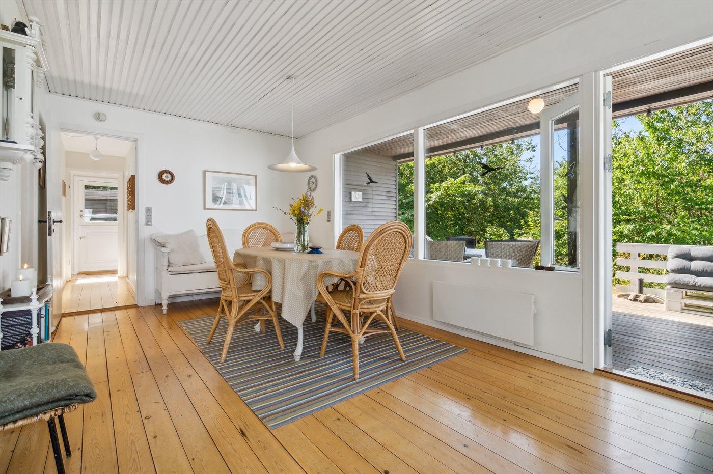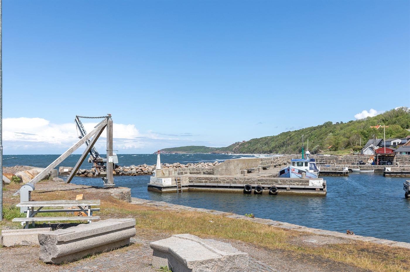 Højt beliggende med den fineste udsigt ned over det lille fiskerleje Vang og udover Østersøen - i klart vejr ses den svenske kyst. Den overdækkede terrasse indbyder til, at man følger naturens gang og solen vandring henover himmelen fra tidlig morgen til sen aften. Sommerhuset ligger for enden af en relativ stejl tilkørselsvej.