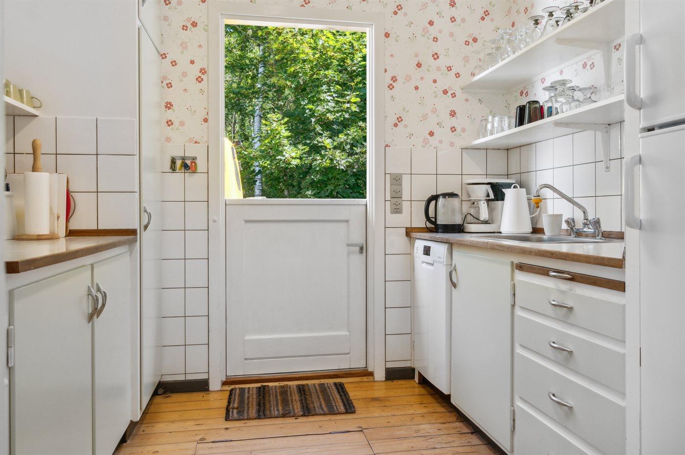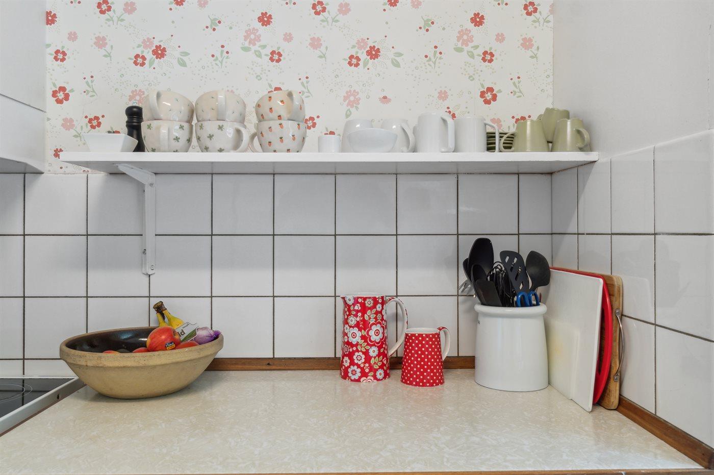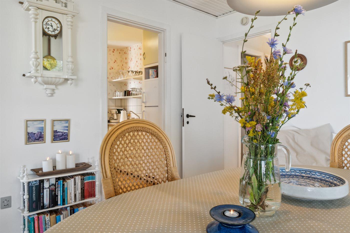 Køkkenet er udstyret med 1 køleskab. Der er 4 keramiske kogeplader, varmluftovn samt opvaskemaskine.