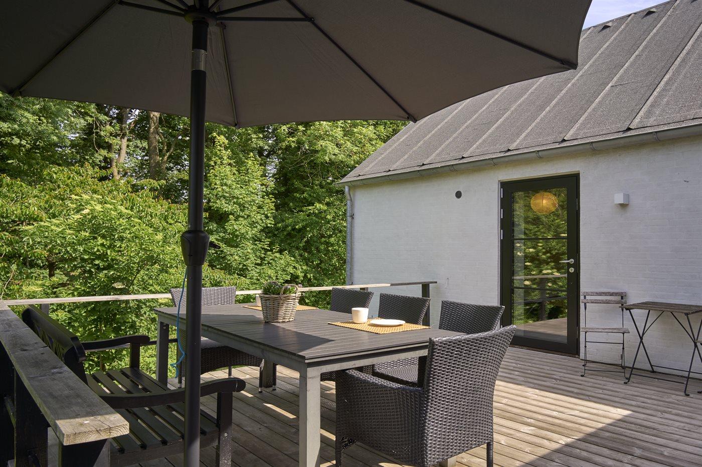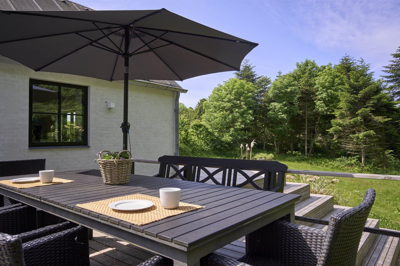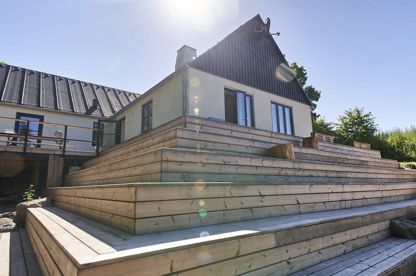 De store terrasser, der omgiver en del af huset i det stærkt kuperede terræn, indbyder virkelig til naturnydelse, da man kan følge vind og vejr - og selvfølgelig solens gang på himlen. Der vil altid være god mulighed for læ, da terrassen er lagt, så man blot kan flytte sig rundt om hjørnet, hvis vinden generer.