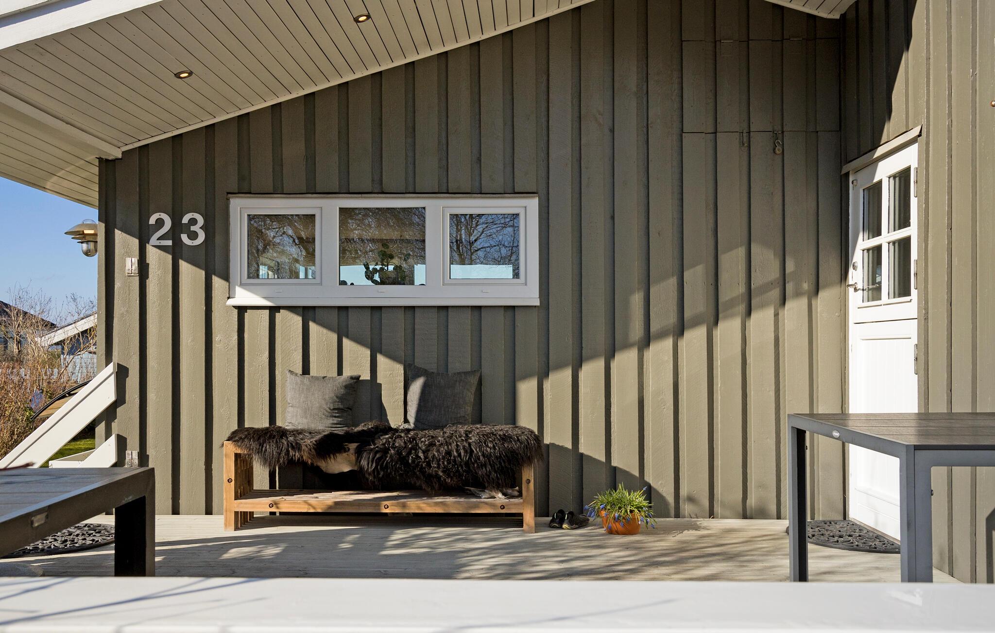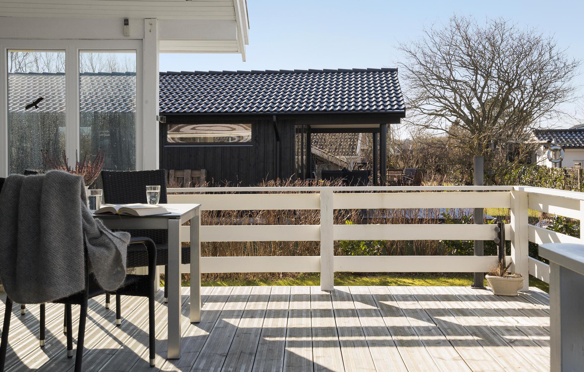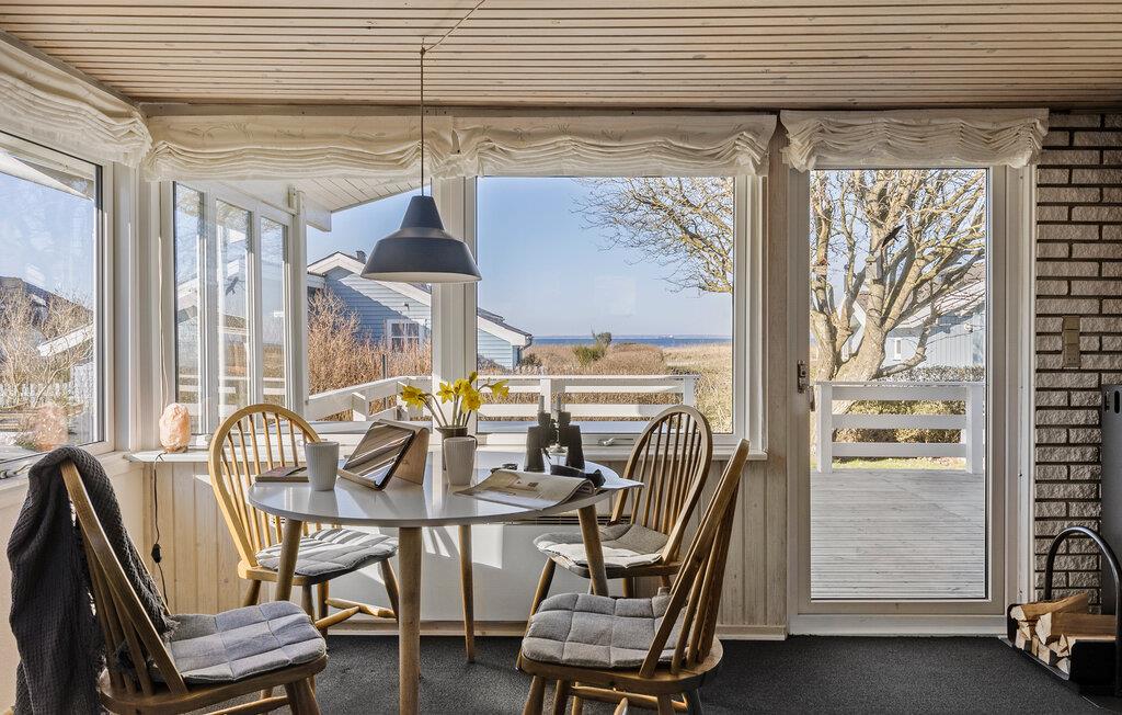 Udenfor er der en rummelig, overdækket terrasse med komfortable siddepladser og en grill til hyggelige aftener. Fyld lungerne med den friske havluft, nyd solen eller læn jer tilbage med et tæppe og en varm drik, mens I nyder synet af de rolige omgivelser.