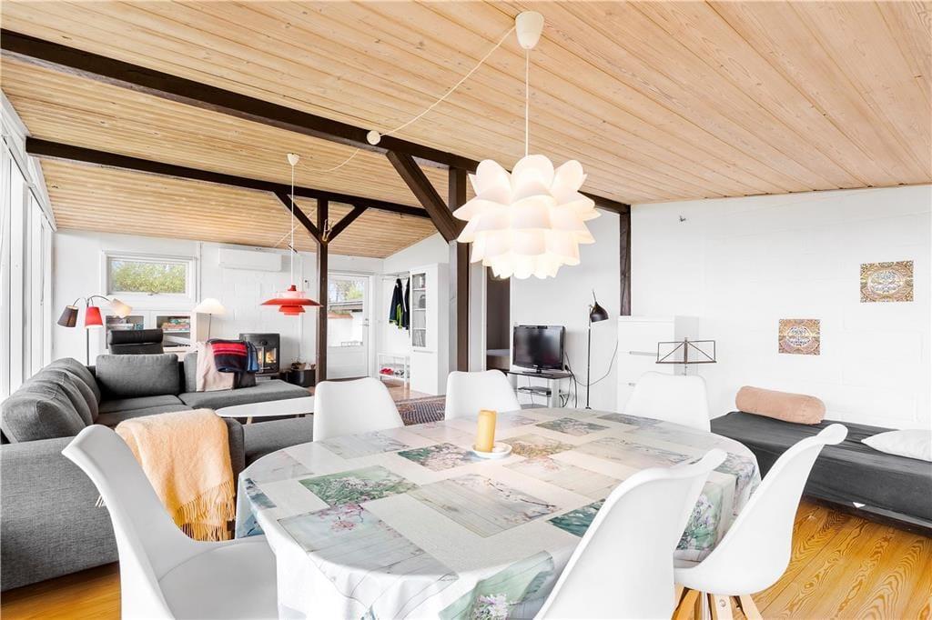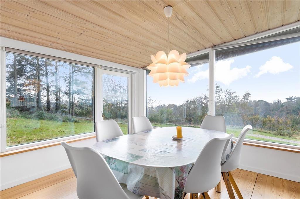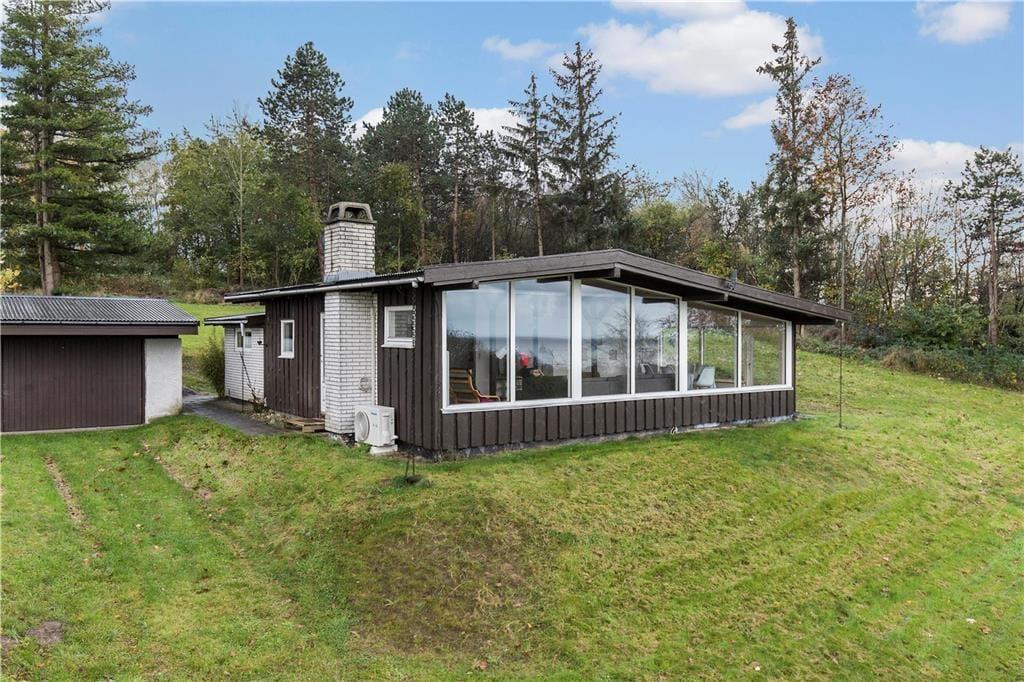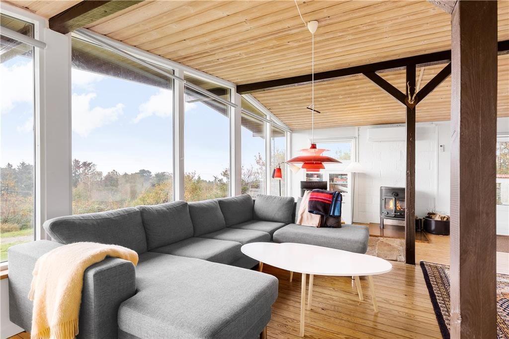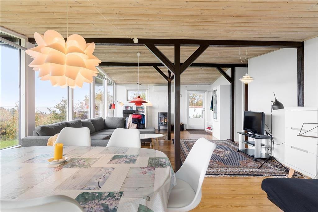 Huset ligger øverst på istidsranden. Her kan du fra panoramavinduerne se havet og træerne på den store ugenerte grund. Velegnet for 4-6 gæster og evt. en hund til en dejlig ferie i Odsherred tæt på lækre badestrande, oldtidsminder, købstæder, indkøbscenter, havne, Sommerland Sjælland, Odsherred Dyrepark og meget mere.